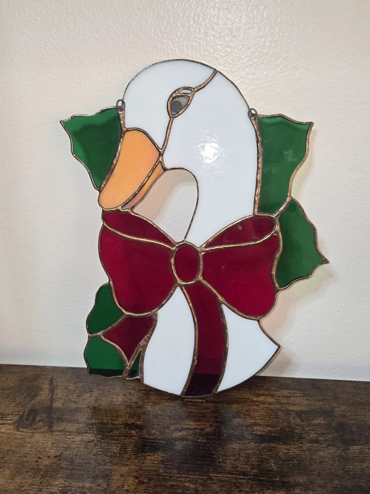Vintage Stained Glass Christmas White Goose Bow Hanging Sun Catchers Window 10”
