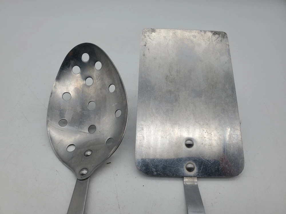 Add a touch of vintage charm to your kitchen with this set of stainless steel serving utensils. The set includes a slotted spatula and spoon, both with a beautiful floral pattern in silver, black, and white. Slotted spoon is 12" long and spatula is 12.5" long.