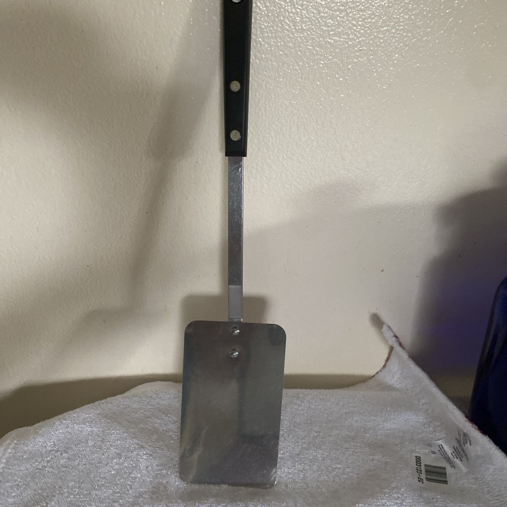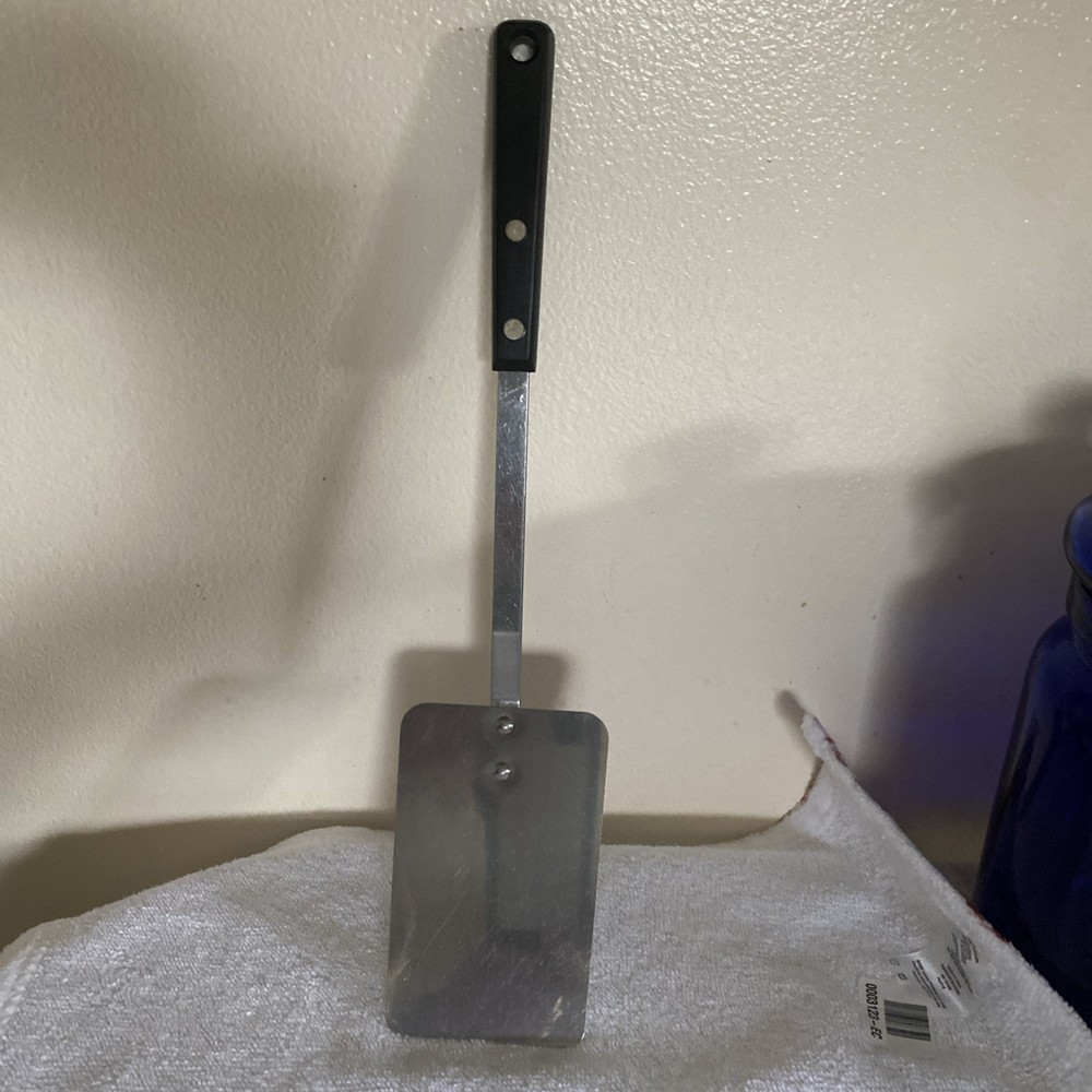 The Vintage Stainless Steel USA Spatula is a collectible kitchen tool perfect for flipping pancakes, burgers, and other dishes. Made in the USA, this spatula boasts a classic design and durable stainless steel construction. Its ergonomic handle provides a comfortable grip, making it a practical and stylish addition to any kitchen collection. Ideal for cooking enthusiasts or vintage collectors, this spatula combines functionality with a touch of nostalgia. The only markings that I see on this flipper are lettering near the handle and it says stainless steel USA and there are two little tiny stars. It looks like an ECKO turner, but I am not entirely sure. There are some surface scratches and signs of use but still has many years to go. The handle is some kind of very dark smooth plastic. Maybe Bakelite . It is well made. Please see all photos.