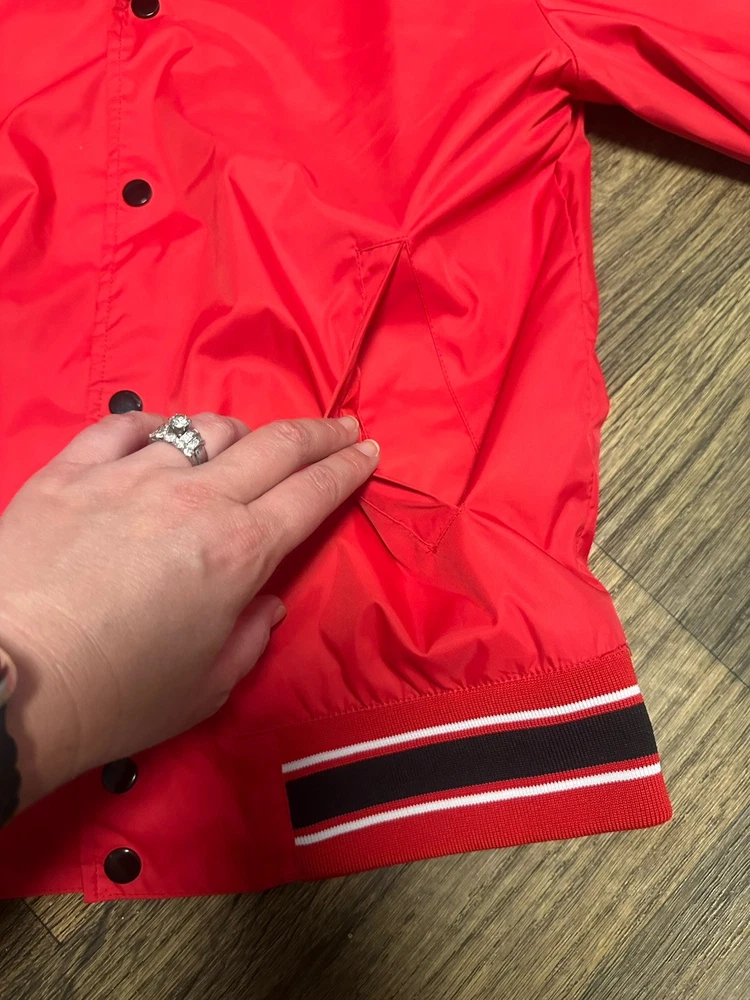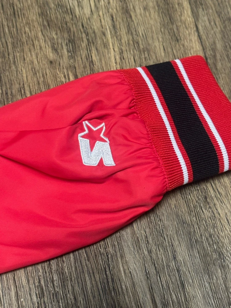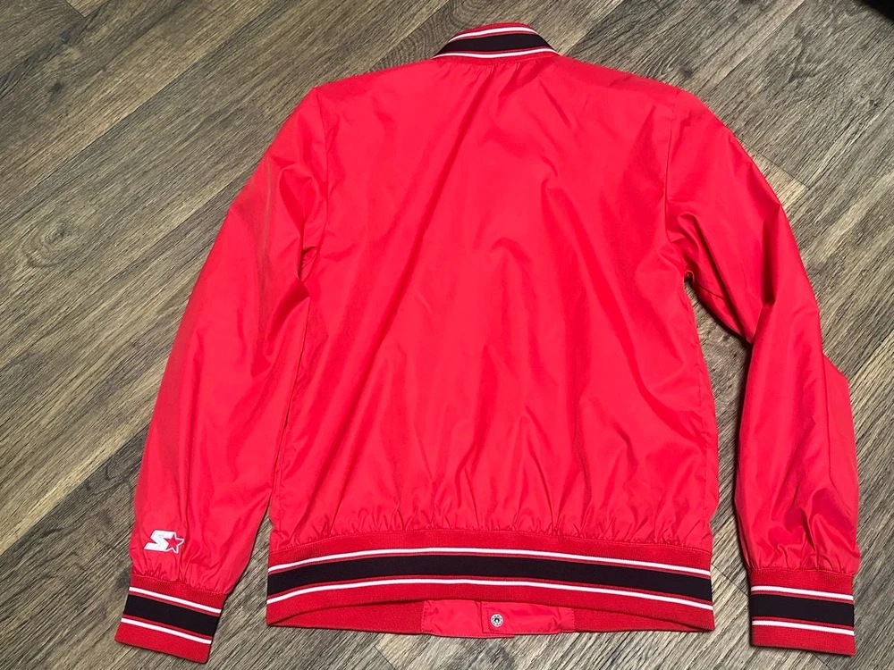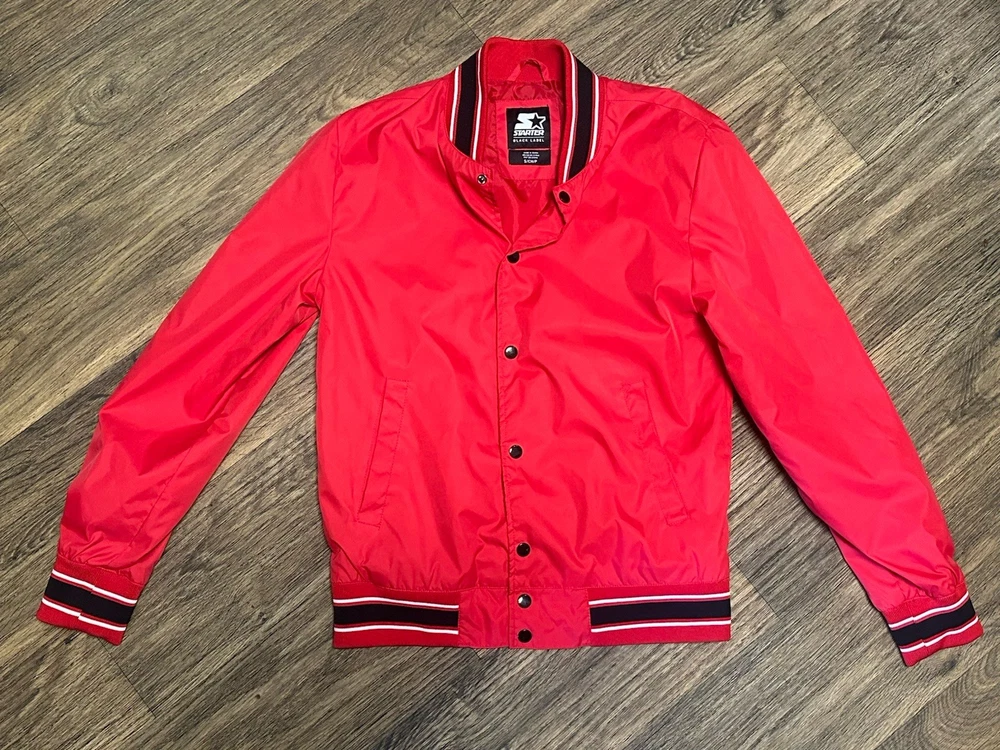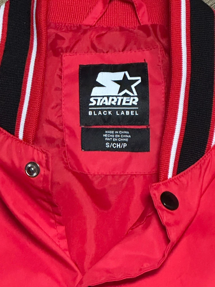 This Vintage Starter Black Label Bomber Jacket is a stylish and practical addition to any man's wardrobe. Made of nylon with a satin fabric type, this snap button windbreaker features a hood, zip and drawstring closure, and is adorned with embroidered logos. The jacket is designed for casual occasions and is perfect for the winter, fall, and spring seasons. With a focus on quality and style, this jacket from the USA-based Starter brand is a must-have for those who appreciate vintage-inspired fashion.