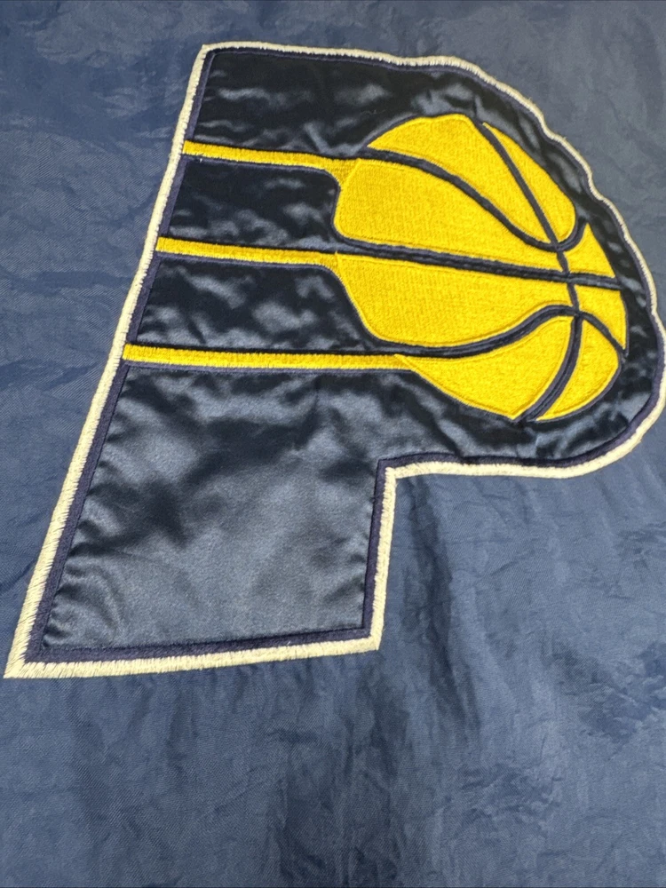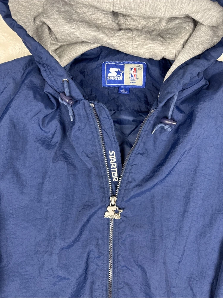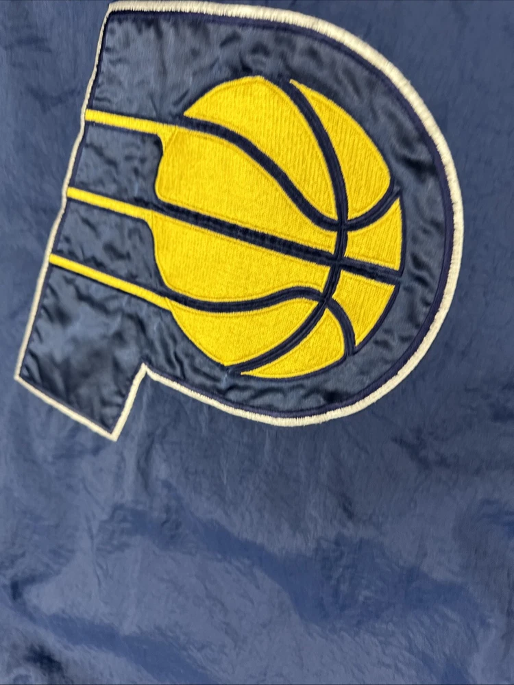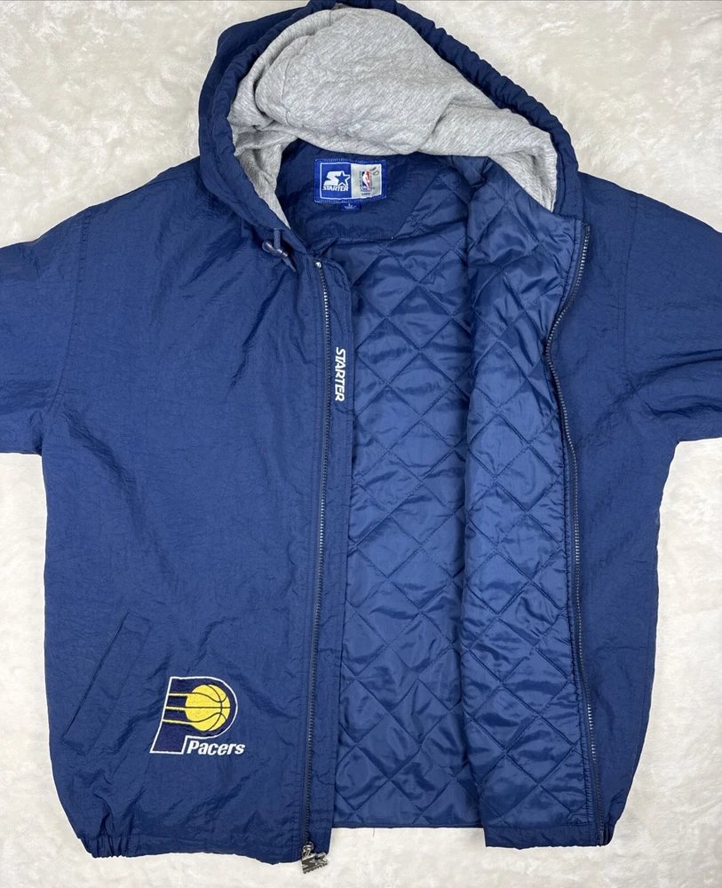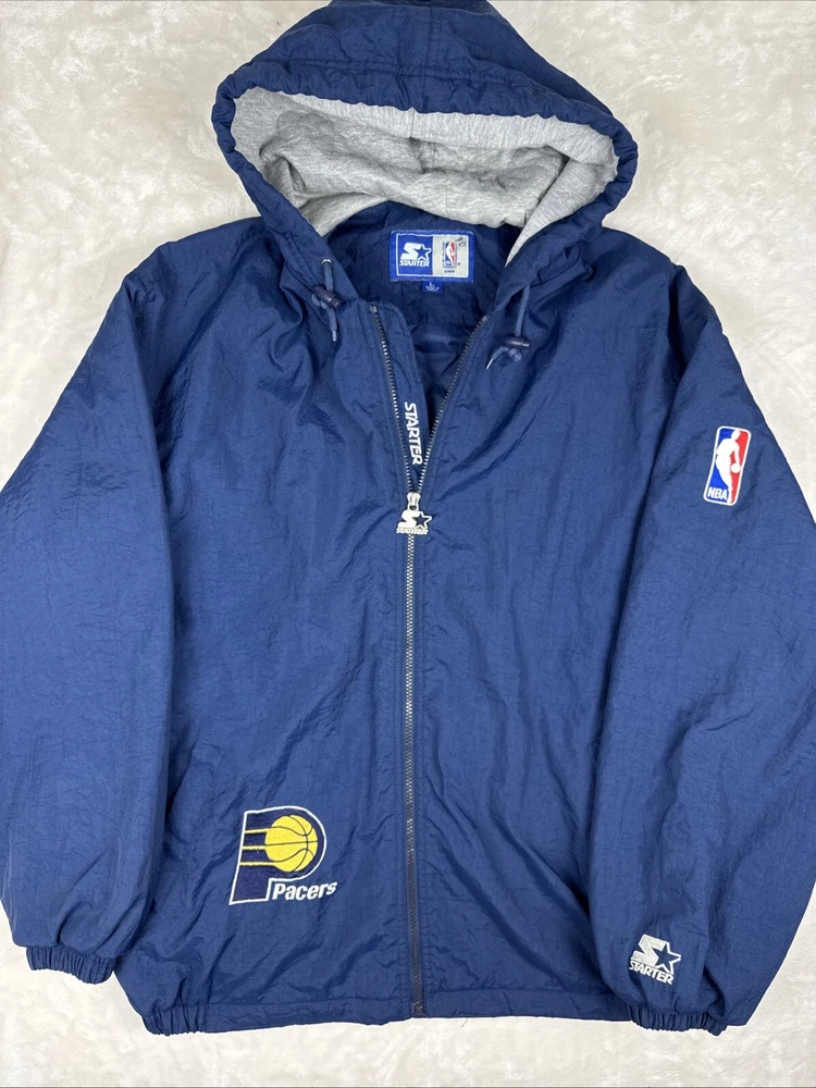 This is a vintage Starter Indiana Pacers hooded full zip jacket from the 90's NBA in size Large. The jacket is officially licensed by the National Basketball Association and features the team's colors of blue. It is a rare collectible item for men, made in Korea. Large embroidered logo on rear. Amazing condition!!