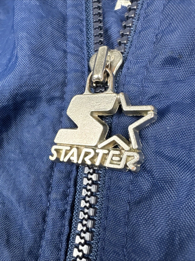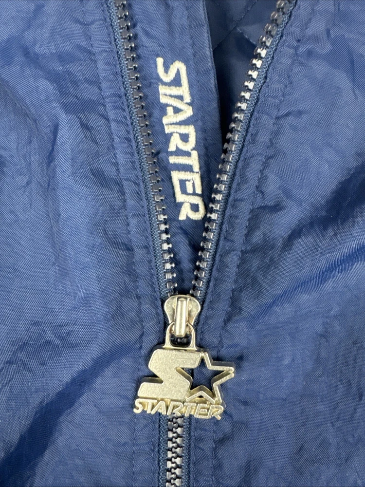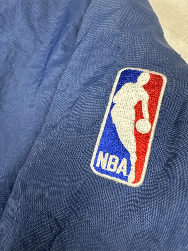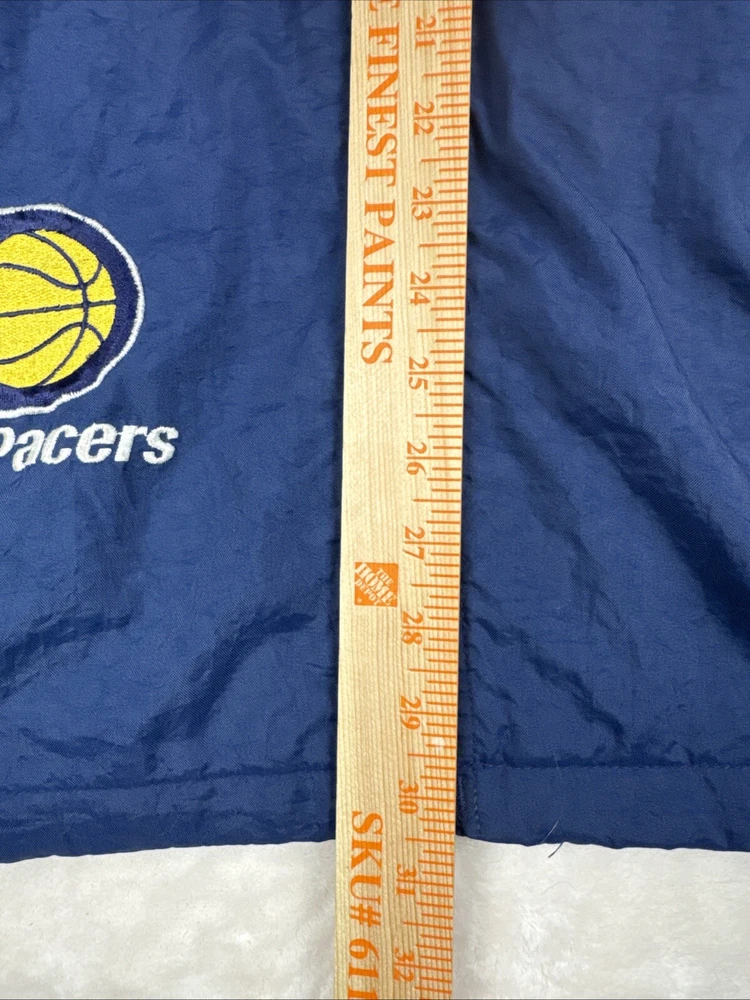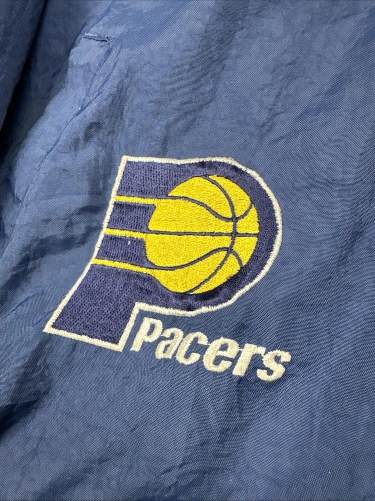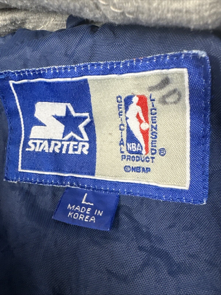This is a vintage Starter Indiana Pacers hooded full zip jacket from the 90's NBA in size Large. The jacket is officially licensed by the National Basketball Association and features the team's colors of blue. It is a rare collectible item for men, made in Korea. Large embroidered logo on rear. Amazing condition!!