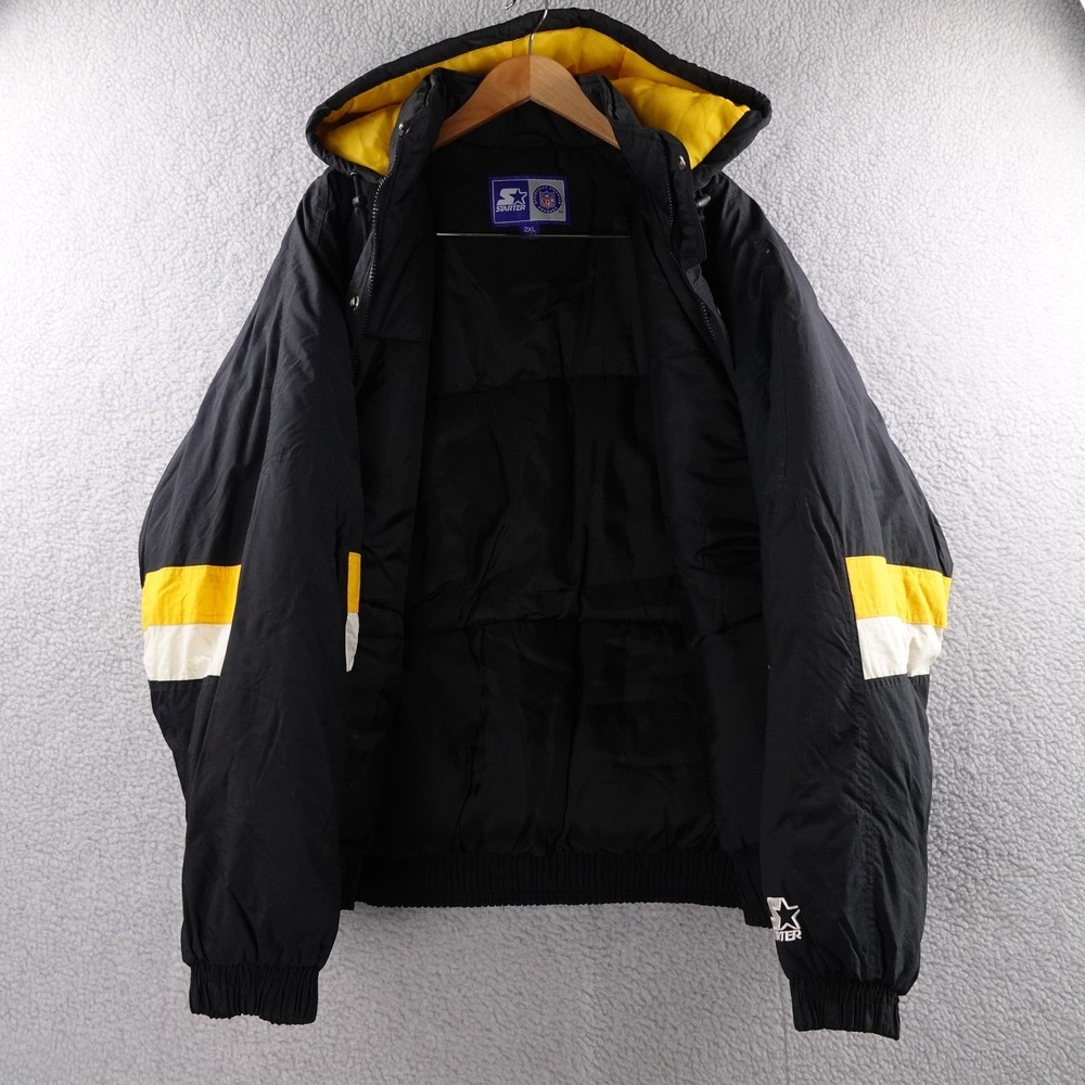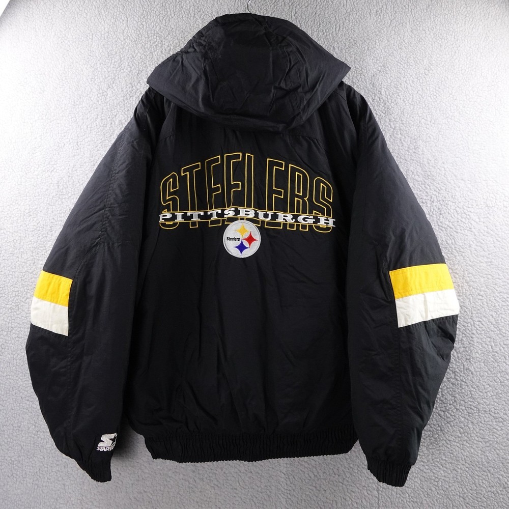 Rep your favorite team in classic style with this Starter Pittsburgh Steelers hooded jacket. Feel the thrill of game day or everyday outings with this officially licensed NFL gear. Bold team branding on the back and chest proudly displays your allegiance, while the comfortable hood and durable construction ensure you're ready for any weather. Perfect for tailgating, watching the game with friends, or casual wear around town. Type: Jacket Style: Anorak Outer Shell Material: Nylon Department: Men Closure: Snap, Zip Fabric Type: Microfiber Insulation Material: Polyester Occasion: Casual Performance/Activity: Football Accents: Logo, Button Features: Pockets, Insulated, Wind-Resistant, Removable Hood Fit: Regular Lining Material: Nylon Keywords: Pittsburgh Steelers, NFL, Starter Jacket, Hooded Jacket, Team Apparel, Football Fan Gear, Outerwear, Sports Apparel, Menswear, Streetwear, Casual Jacket
