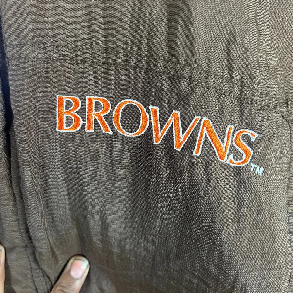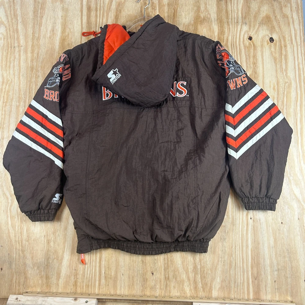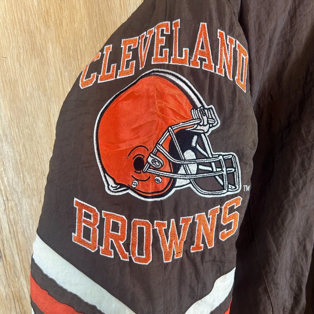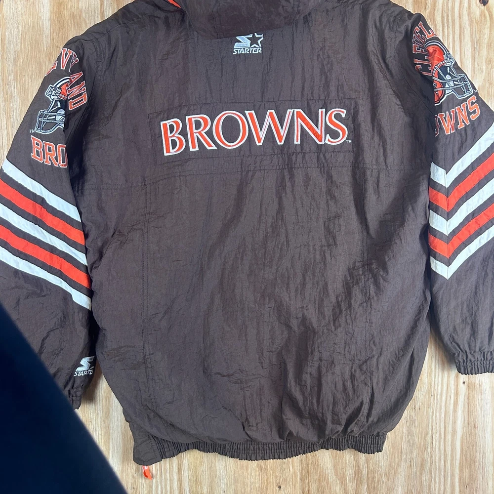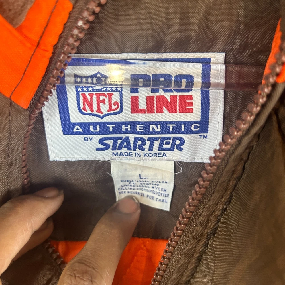 Show off your love for the Cleveland Browns with this vintage Starter Pro Line NHL jacket. Made in Korea, this officially licensed jacket features the team's iconic brown color and is sized for men's Large. Perfect for regular season games or everyday wear, this jacket is a must-have for any true fan. Represent your favorite team in style with this high-quality jacket from Starter. The perfect addition to any football fan's wardrobe, this jacket is made for comfort and durability. Get yours today and show off your support for the Cleveland Browns! SKU: 160018