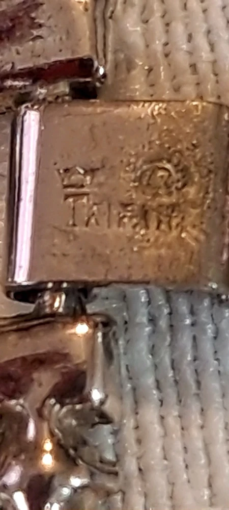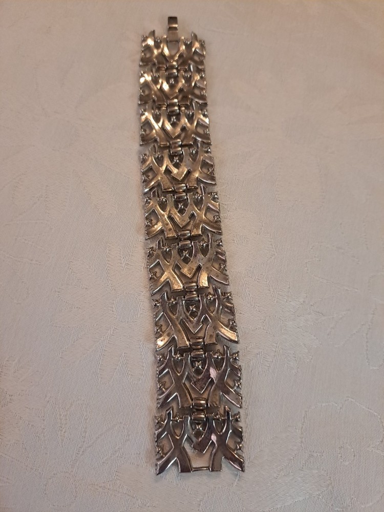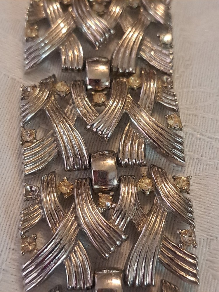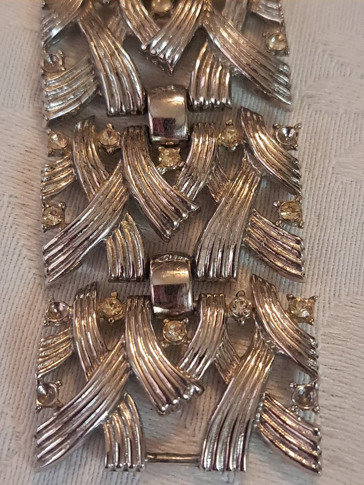 The Vintage Statement Crown TRIFARI Silvertone Wide Lattice Braided Link Bracelet is a stunning piece of vintage jewelry signed by the renowned brand Trifari. The bracelet features a wide lattice design with braided links in silvertone, accented with sparkling rhinestones as the main stone. The snap closure makes it easy to wear, and the classic silver color adds a touch of elegance to any outfit. Perfect for those who appreciate vintage and antique jewelry, this bracelet exudes a timeless beauty and sophistication. Missing a few tiny rhinestones. Price reflects. I can combine shipping to save you some $ 🥳