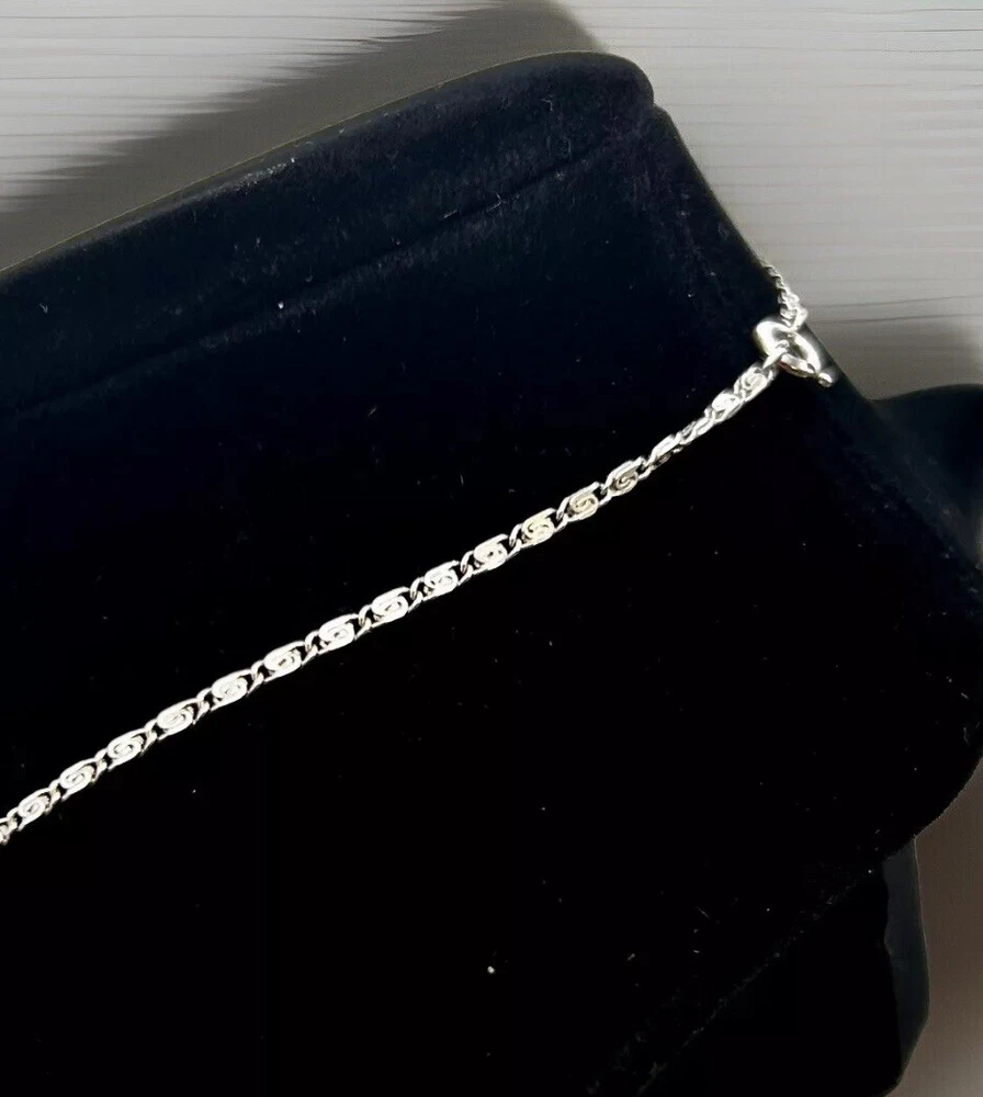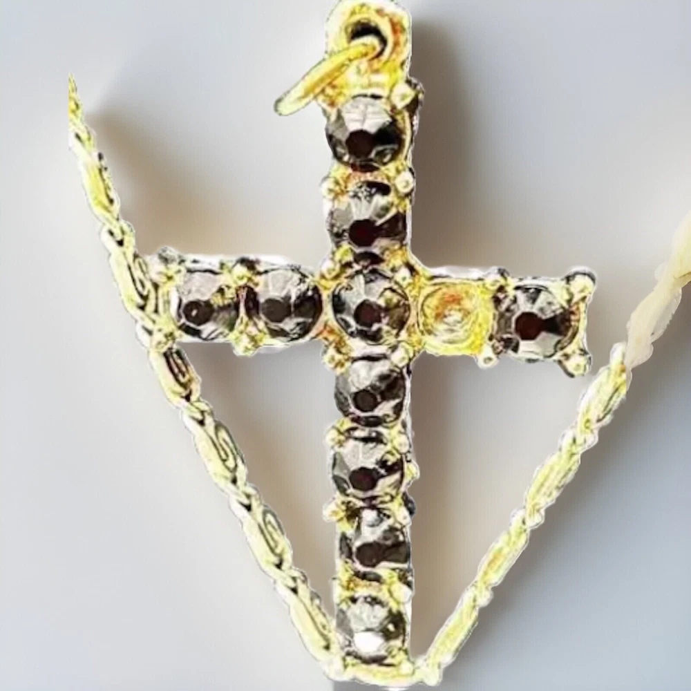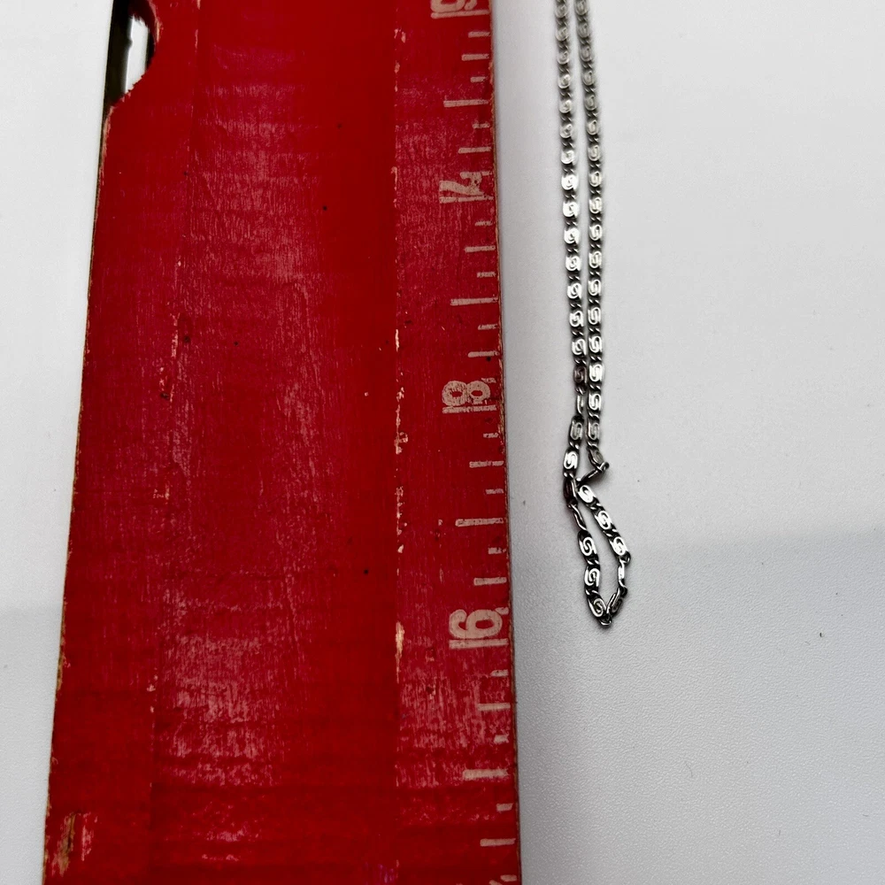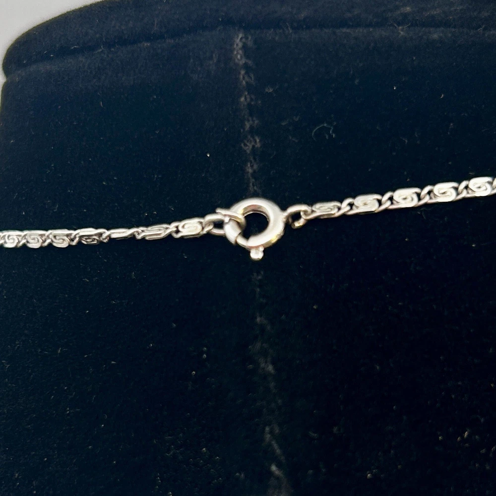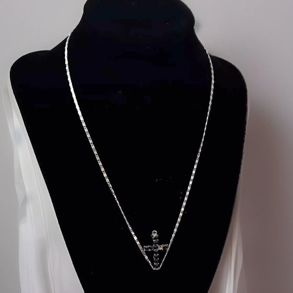 Please note that the crucifix is missing one black stone but it is not the star of the show. That belongs to the 18 inch hallmark sterling silver chain. It has a hallmark or makers mark that I have not been able to decipher. The hallmark and STERLING mark are on the ring clasp which makes it very difficult to photograph but please look at the photos for more information.