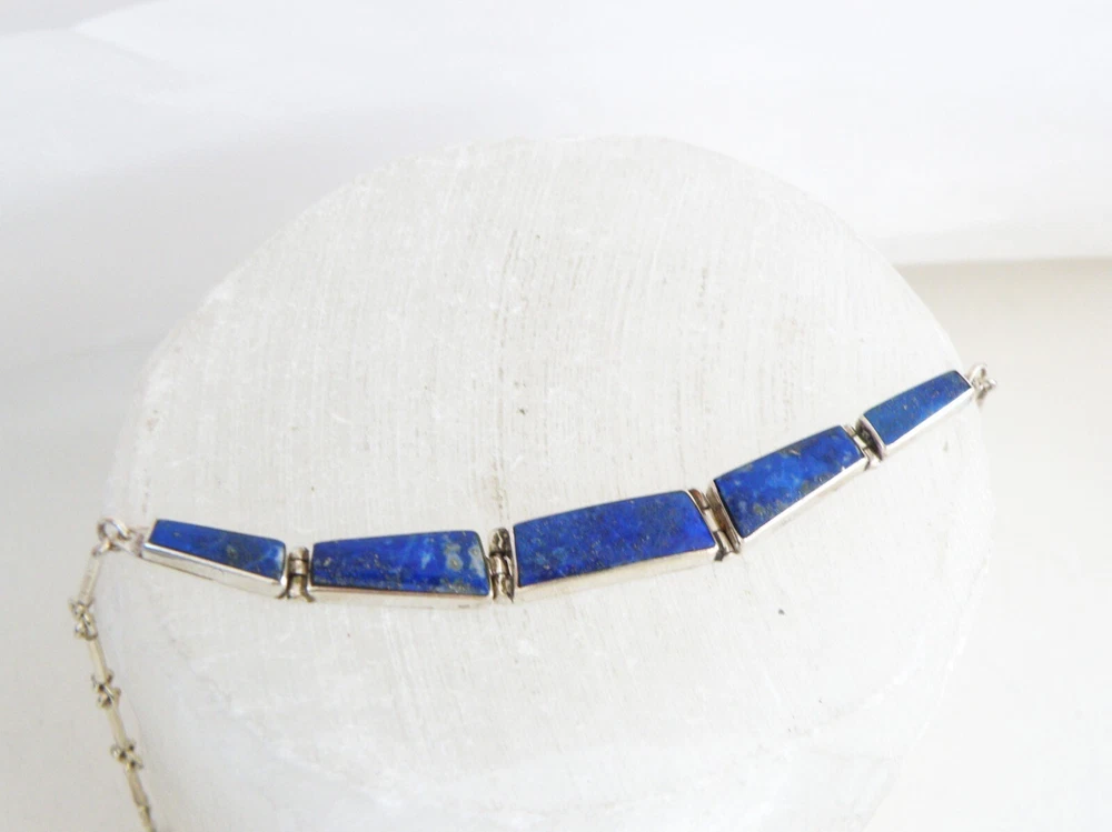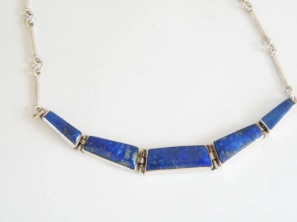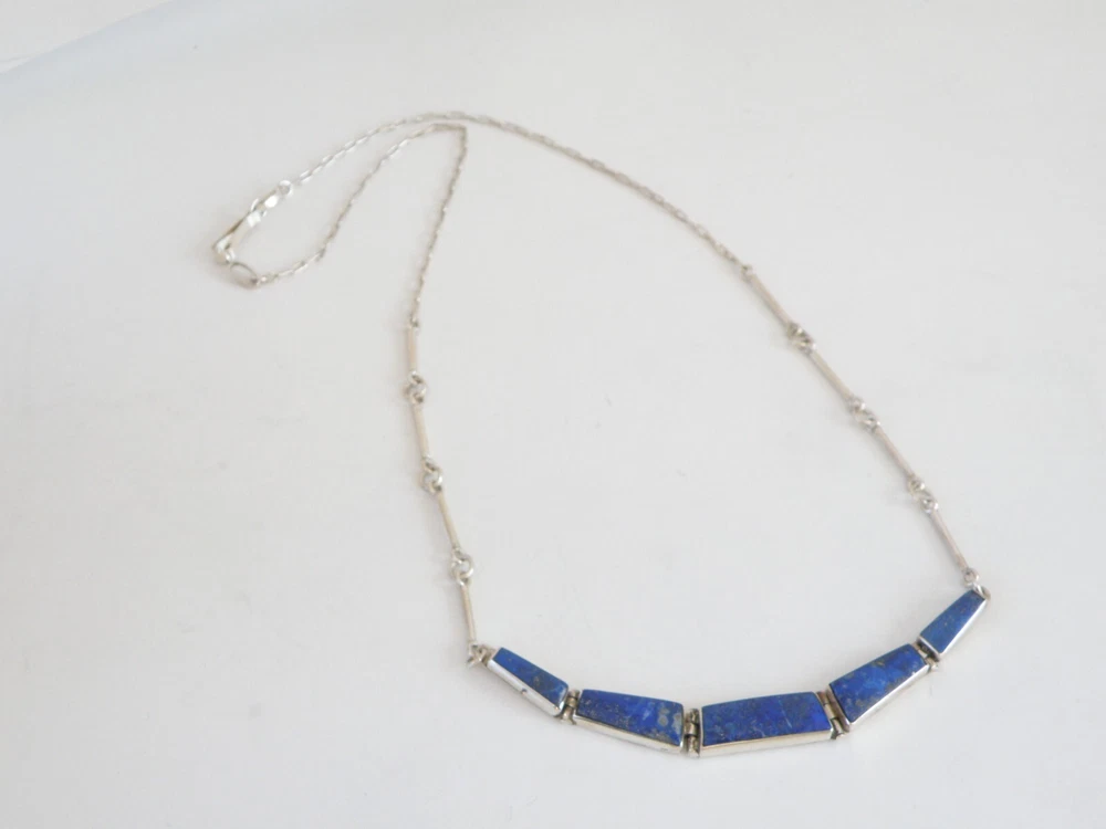 Find the key to accessory success in this statement making vintage sterling silver necklace. Beautiful natural lapis stones light up the center. This necklace appears all handmade. It is stunning. It is in good vintage condition with normal wear. No missing or damaged stones. May need to be polished. WEIGHT: 9.5 grams MEASURES APPROX: 18" long end to end x .35" widest in the center The center is approx. 3" long Center stone is approx. 8mm x 19mm Signed 925 for sterling silver is marked on the hook clasp and the back of the necklace