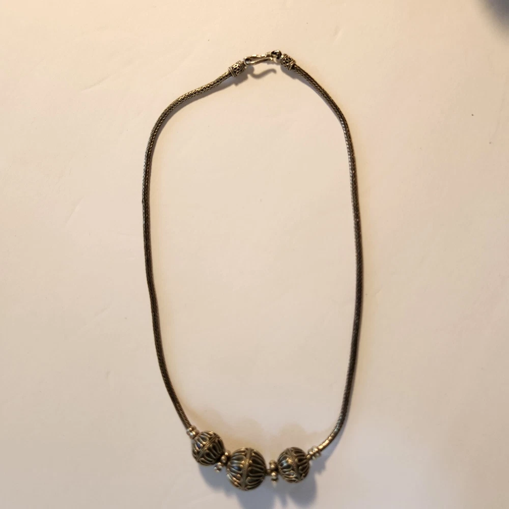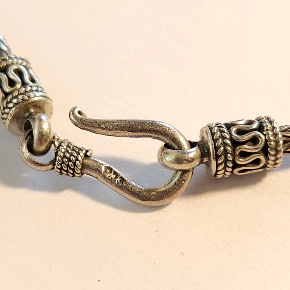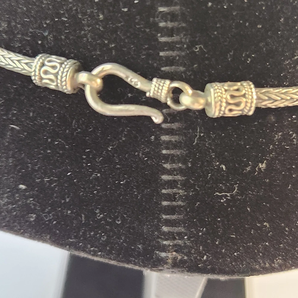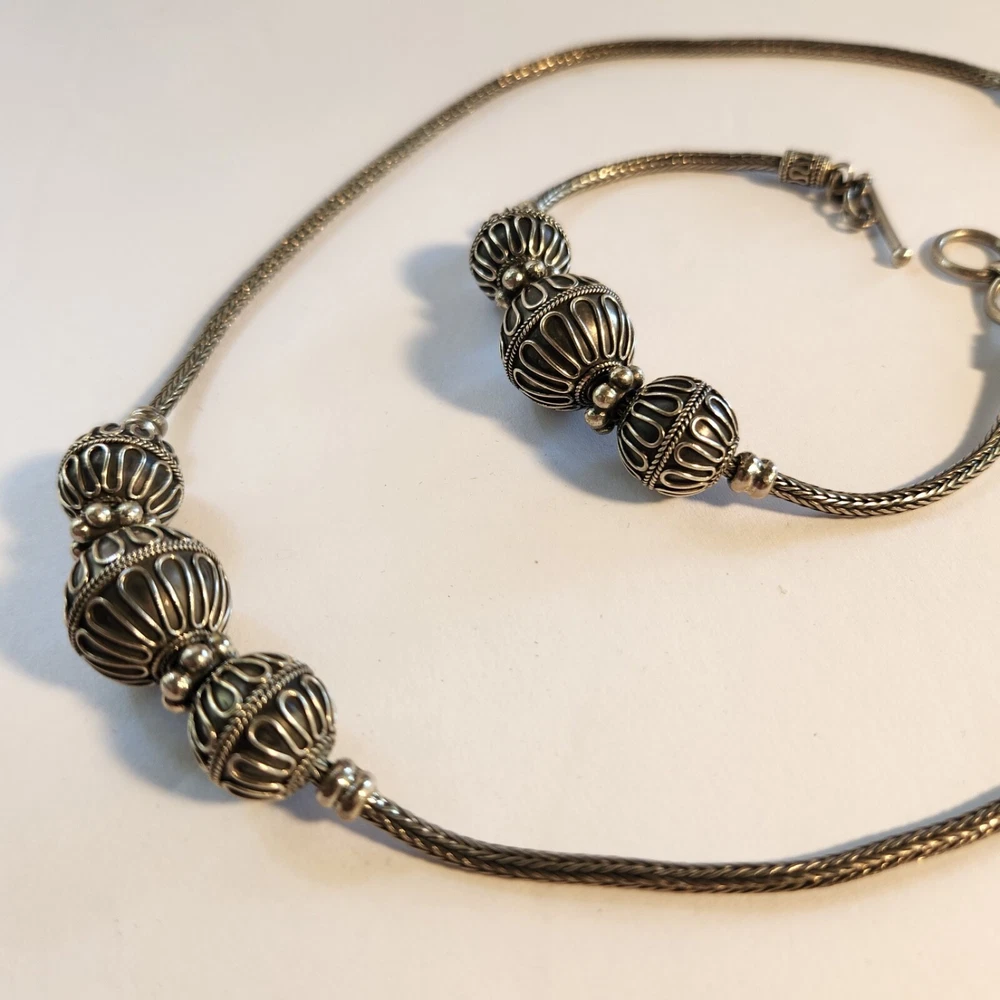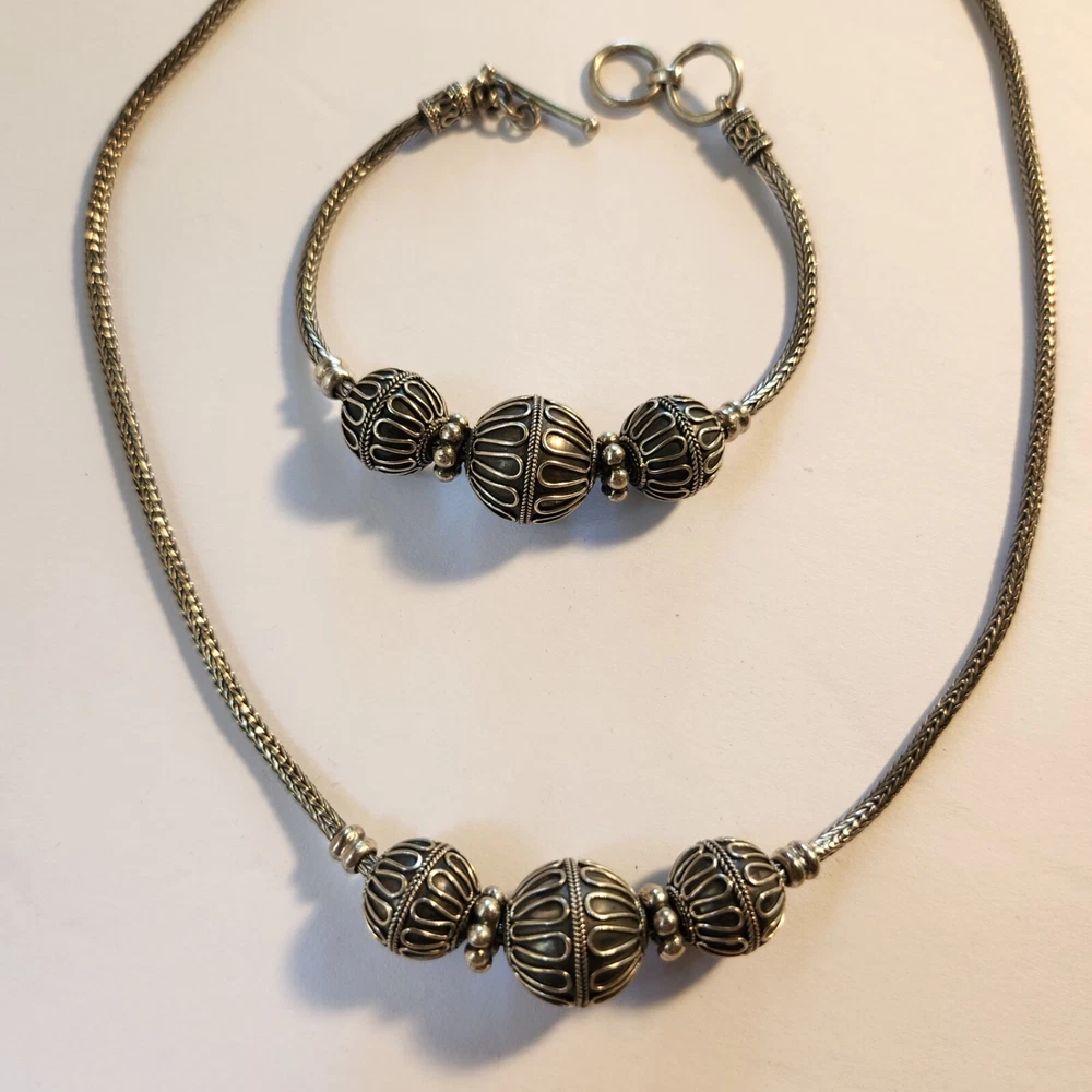 Sterling .925 silver necklace and bracelet… Bali wheat foxtail chain.. hook enclosure for necklace and and hoop for the bracelet. Both are stamped .925 the bracelet is 8 inches long and weighs 26 grams.. the necklace is 18 inches long and weighs 34 grams.. ALMOST 2 OUNCES OF STERLING SILVER… there are 3 balls on this necklace . An elegant design and sure to please.. PREOWNED.