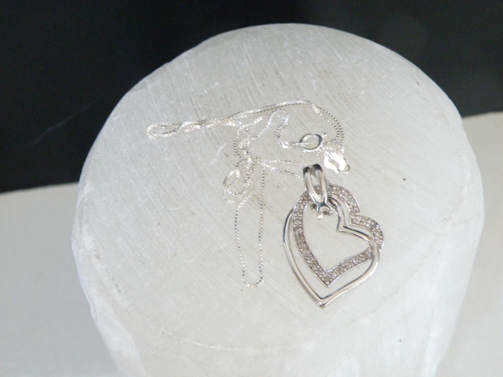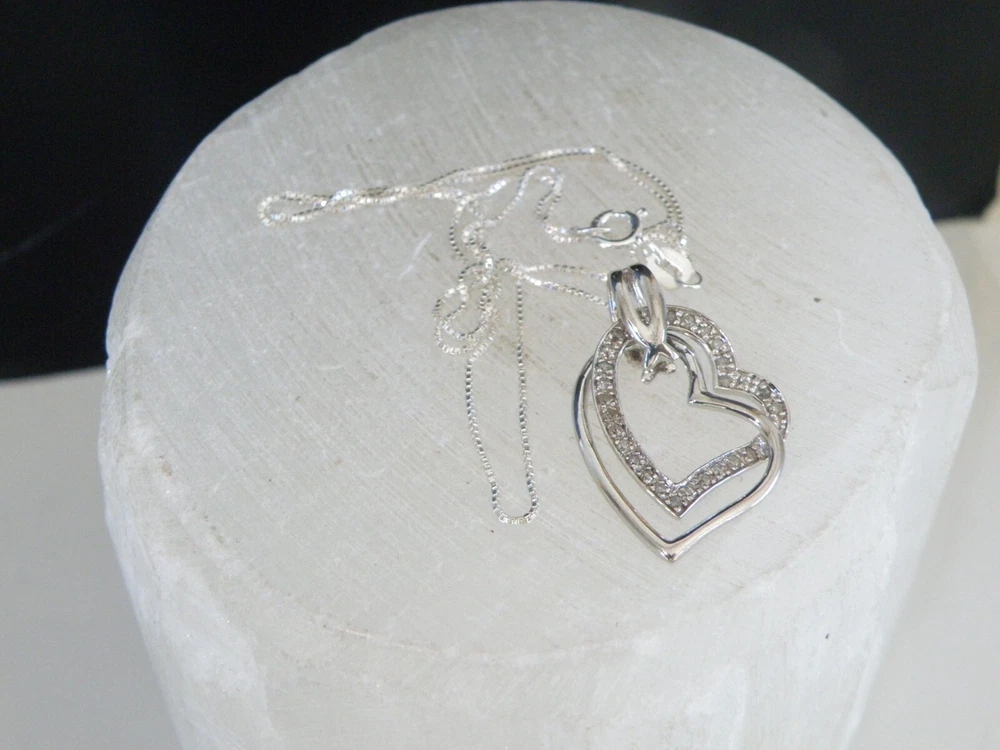 Unlock your style potential with this charming double heart diamond sterling silver pendant necklace. Measures approx. 18" long. Heart is approx.1.20" with the attached bail x .75" Weight 3.2 grams Marked 925 for sterling silver is marked on both pieces. The pendant is also marked SAI - necklace is marked Italy 925