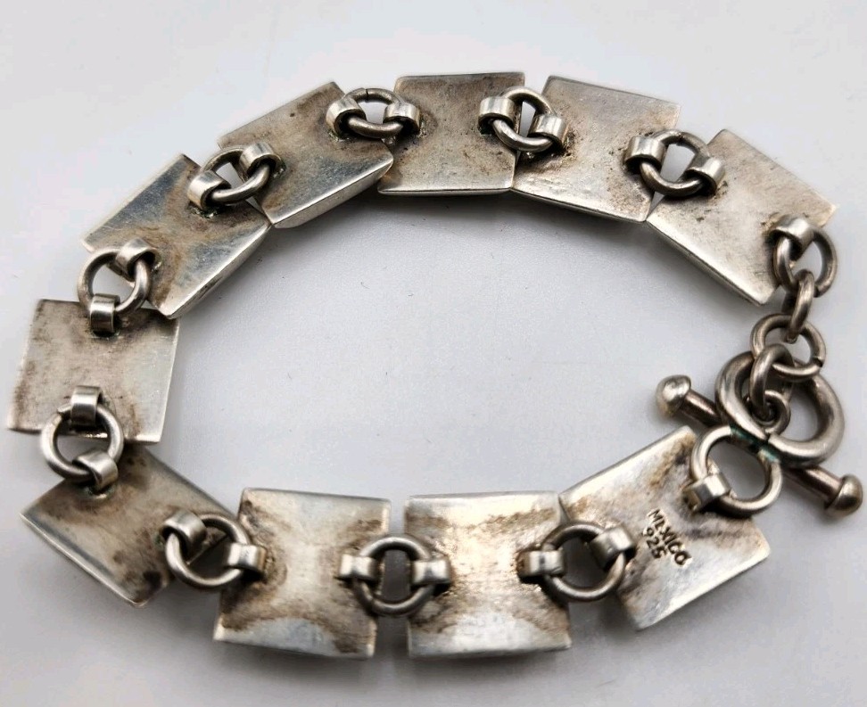 This Gorgeous Vintage Sterling Silver Sweet Heart Bracelet features a classic tennis-style design with beautiful red heart-shaped stones set in 925 silver. The bracelet's intricate heart shape adds a touch of elegance, making it a perfect accessory for any outfit. The vintage charm exudes timeless beauty, making it a timeless piece that can be worn for years to come. Heavy well-made bracelet, weighs 37.40 grams, 1/2 inches wide, and is 7 inches long. The back of the bracelet needs to be polished.