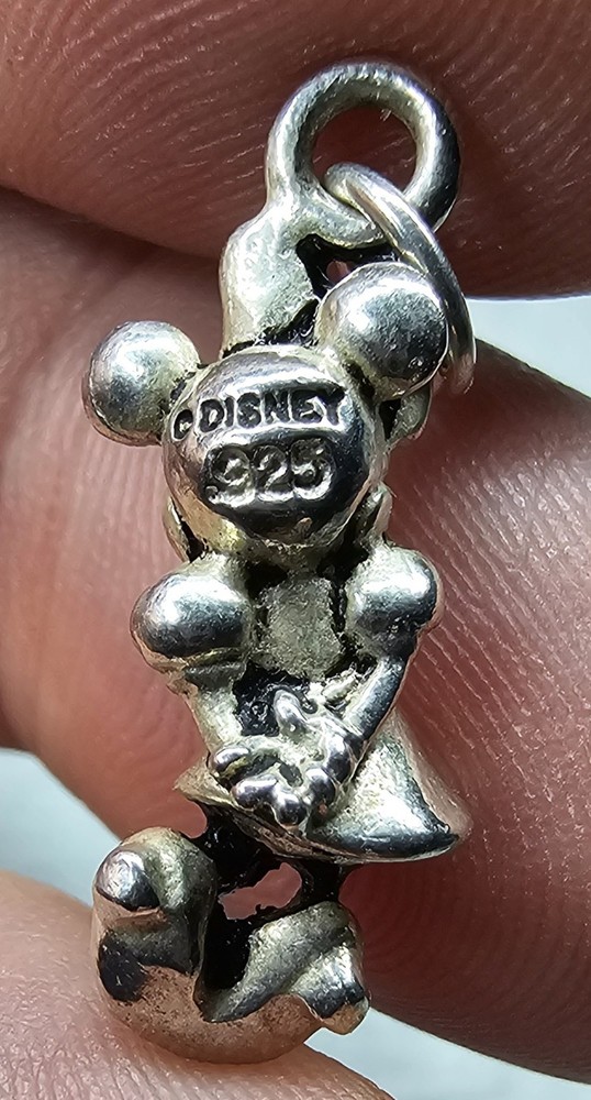 Add a timeless classic to your jewelry or Disney collection with this vintage Minnie Mouse charm, crafted from solid 925 sterling silver. Fully detailed in 3D, Minnie is shown with her signature bow, holding a flower and wearing her classic skirt — a design that’s both nostalgic and charming. Stamped © Disney 925, this piece is perfect for collectors of vintage Disney jewelry, charm bracelets, or themed pendant sets. --- Details: Character: Minnie Mouse Material: Sterling Silver (marked 925) Weight: 3.1 grams Design: Full 3D sculpt, solid vintage charm Marks: © Disney 925 Condition: Excellent vintage condition with light patina
