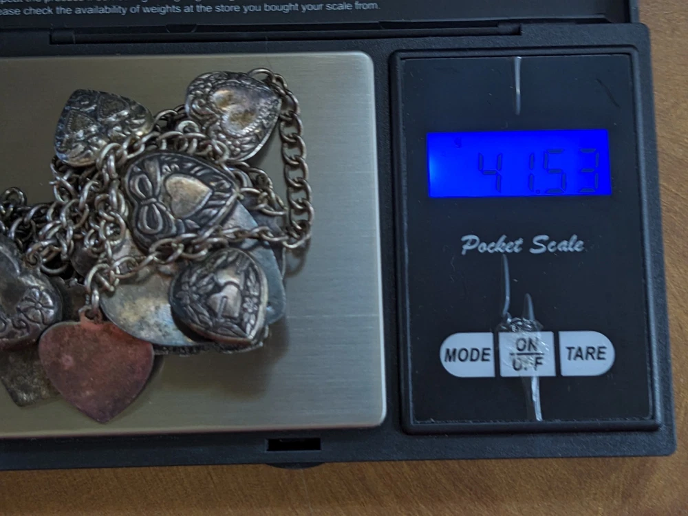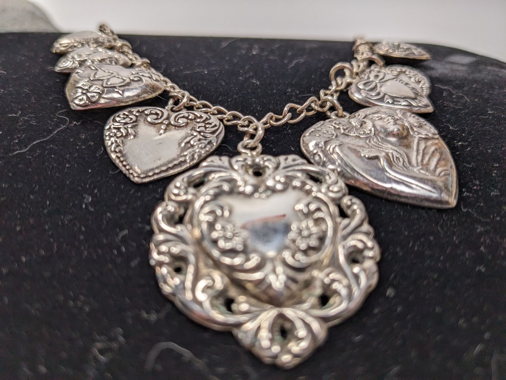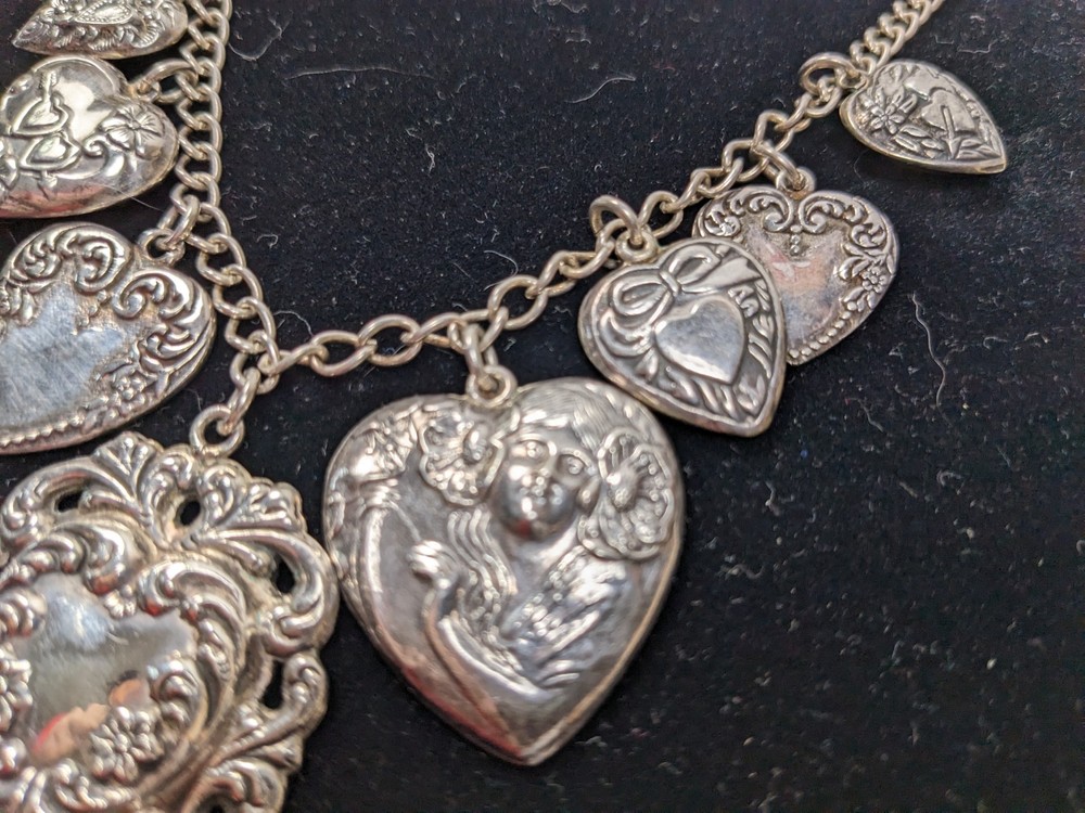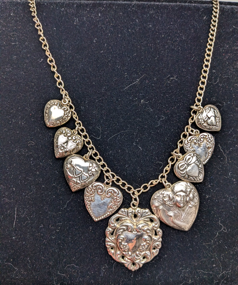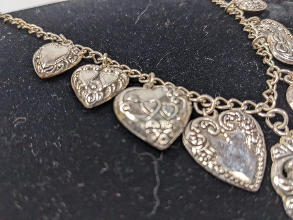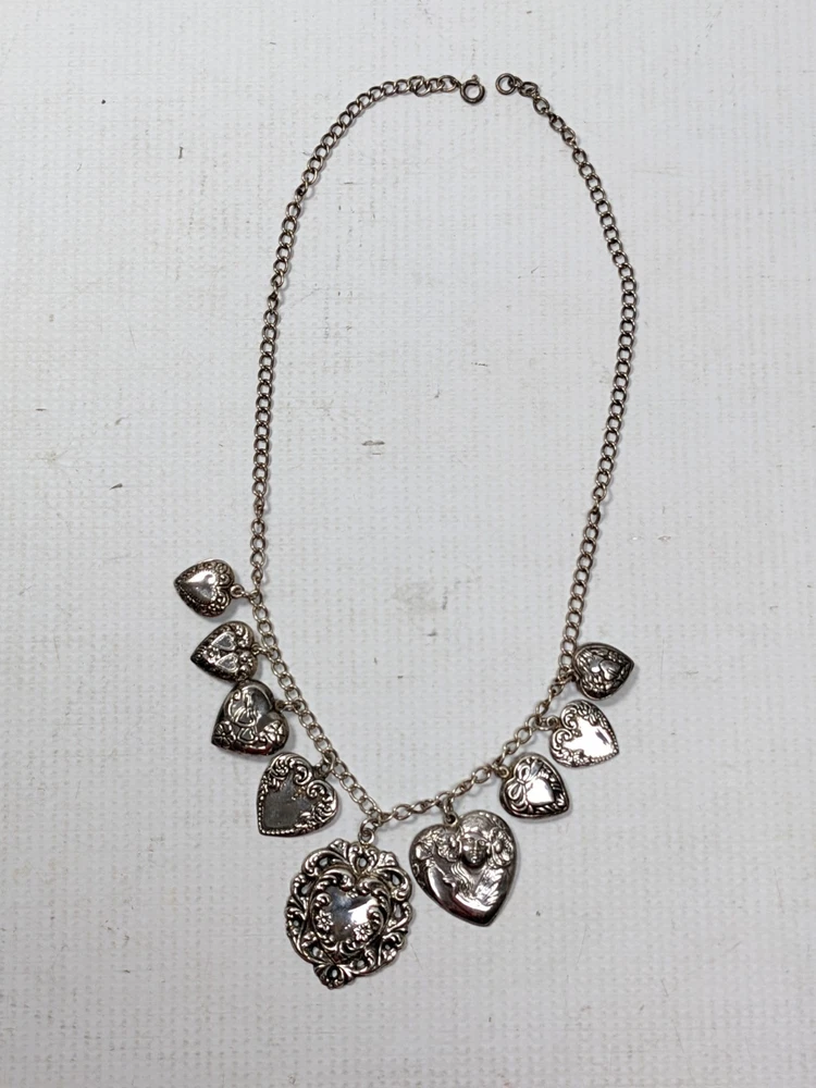This vintage sterling silver puffy heart charm necklace is a striking piece of fine jewelry, featuring nine intricately crafted heart-shaped charms. The big pendant is stamped STERLING, highlighting its authenticity and uniqueness. Made from sterling silver, the necklace boasts a retro design dating from the 1935-1950 era. A secure spring ring clasp completes the look, making this a timeless and elegant accessory for women who appreciate vintage style. I gave it a light polish with a silver cloth but preserved most of the original age-related patina, which beautifully enhances the details of each charm. Weight: 41.53 g Total lenght: 20" Estate sale find, pre-owned item, used condition showing signs of wear and use. All images provided accurately represent the item(s) you will receive and should be regarded as an integral part of the description. We encourage you to carefully review each image. If you have any questions or need further details about this listing, please feel free to reach out to us.
