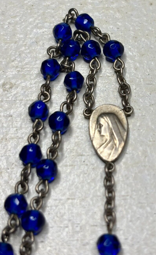 Vintage sterling silver rosary with cobalt blue glass 1/8 inch beads. Total length is 19 inches with cross Cross is marked STERLING No damage