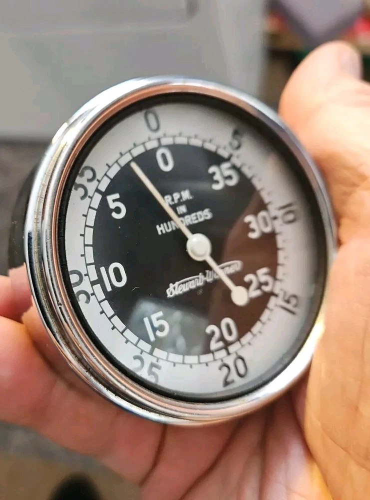 Unit of Measure:rpmCountry/Region of Manufacture:United StatesDisplay Type:AnalogBrand:Stewart WarnerVintage Part:YesNeedle Color:WHITEColor:MulticolorMaterial:MetalType:TachometerStyle:Vintage