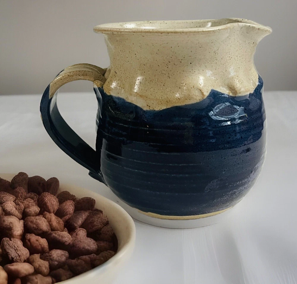This unique vase is a wonderful addition to any collection. Handmade by Joyce Brown in Pittsboro, North Carolina in 1983, it features a beautiful all-over pattern of stones. The vase stands at 5 inches tall and has a glossy finish. H- 5 inches Dimension opening- 4 3/4 inches 6 1/2 across spout to handle Very good condition. Minimal sign of wear and tear. No chips, cracks or discoloration. Please see all attached photos and zoom in for imperfection. Free shipping with bundle of care.