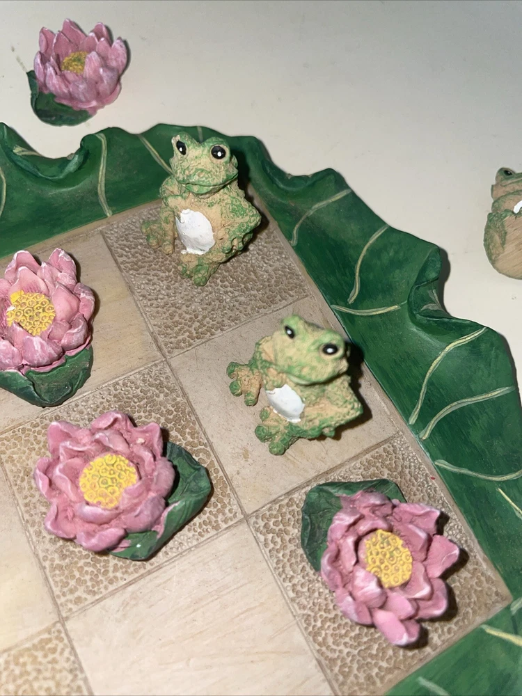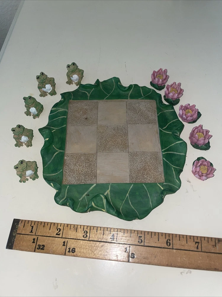 This vintage stoneware tic tac toe game is a unique piece of folk art that will add a touch of charm to any collection. Handmade by Lyn Ganoe in 2002, this statue features miniature frogs and flowers with vibrant colors that make it a decorative piece perfect for any gaming enthusiast. The game is contemporary, produced in the United States, and made of clay and stone materials. The sculpture is 6.5 inches long and 6 inches wide, with a period of production from 2000-2009. It is signed by the artist and features a handmade design that showcases the culture of folk art. This item is perfect for collectors who appreciate unique and vibrant pieces that add a touch of history to their collection. It would make an interesting Christmas gift especially for those who love games.