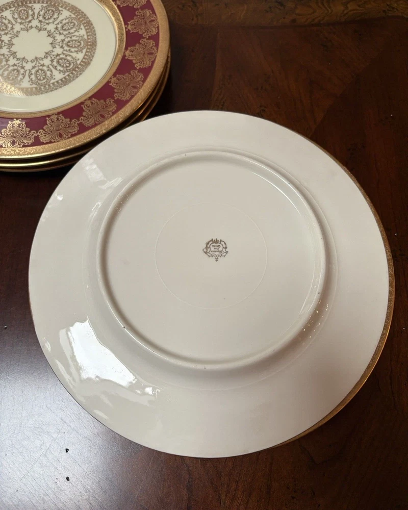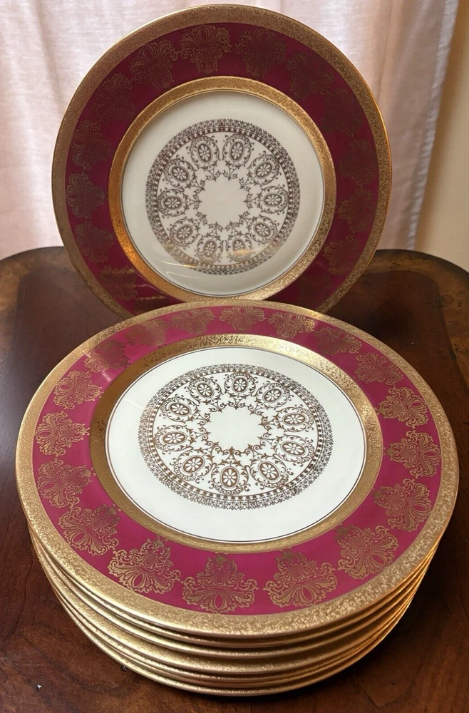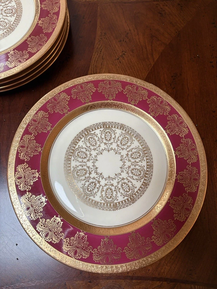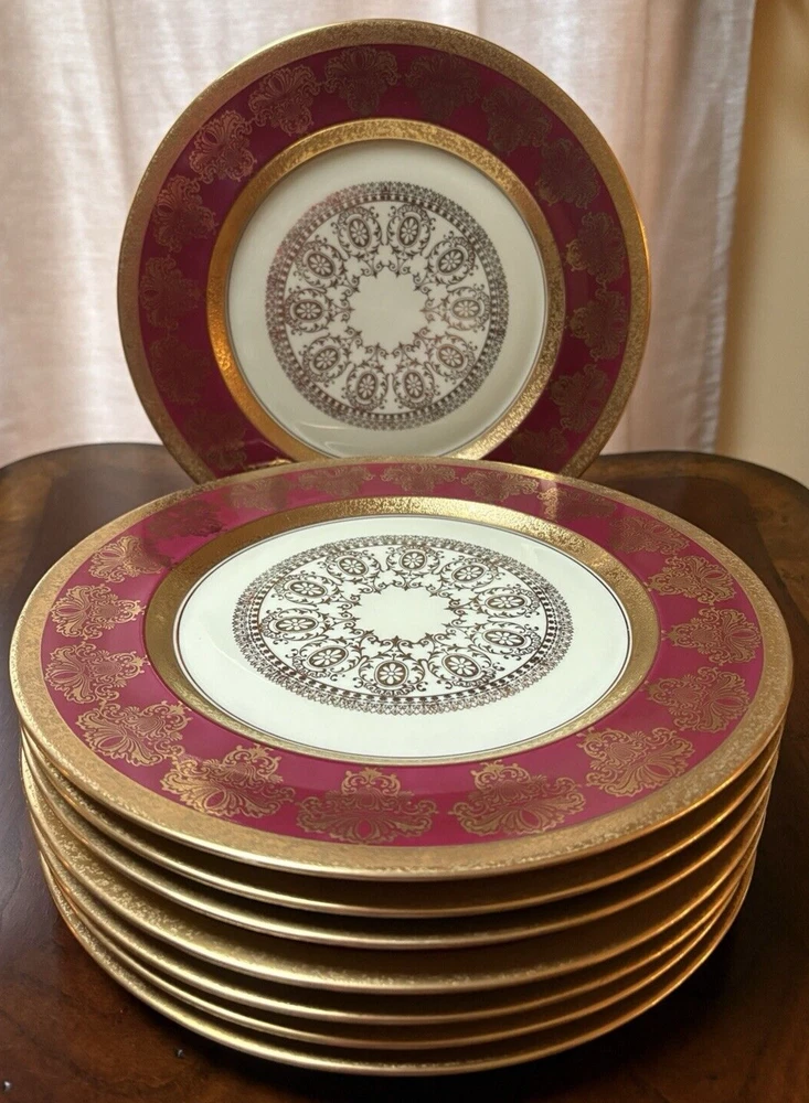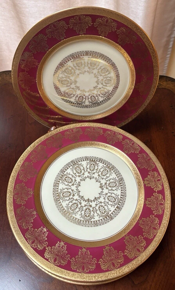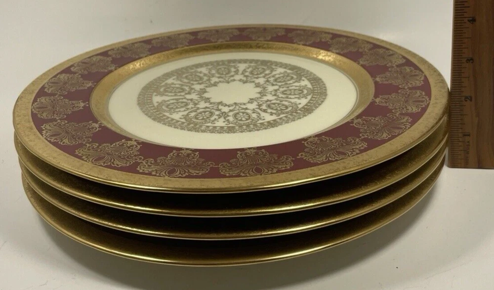 Set of four fine china dinner plates decorated with gold design and gold trim. There are 2 sets of four plates available. They are in excellent condition, no chips or cracks and the gold looks vibrant; there is some discoloration on the back of the plates that looks like a manufacturing imperfection. Measures (approx.): 11" DIA rim. They are marked on the bottom. Please see photos for more details. Please note that the item is vintage and may show signs of wear. We have done our best to honestly and accurately describe and photograph the item, including possible flaws. What you see are the actual photos of the item being sold. If you have any questions regarding the item, please ask! We DO NOT SELL outside United States. SHIPPING The item will be shipped within three business days after receipt of payment. We ship via USPS to any location within the 48 continental United States, NO INTERNATIONAL SHIPPING. Shipping is calculated by EBAY based on the weight and size of the item plus packaging. We can combine shipping in case you buy multiple items that can be safely shipped together. Thanks for looking!
