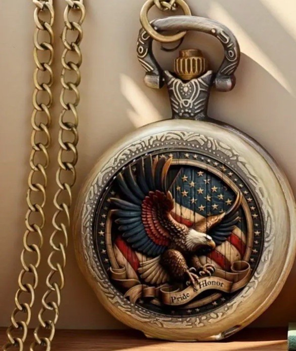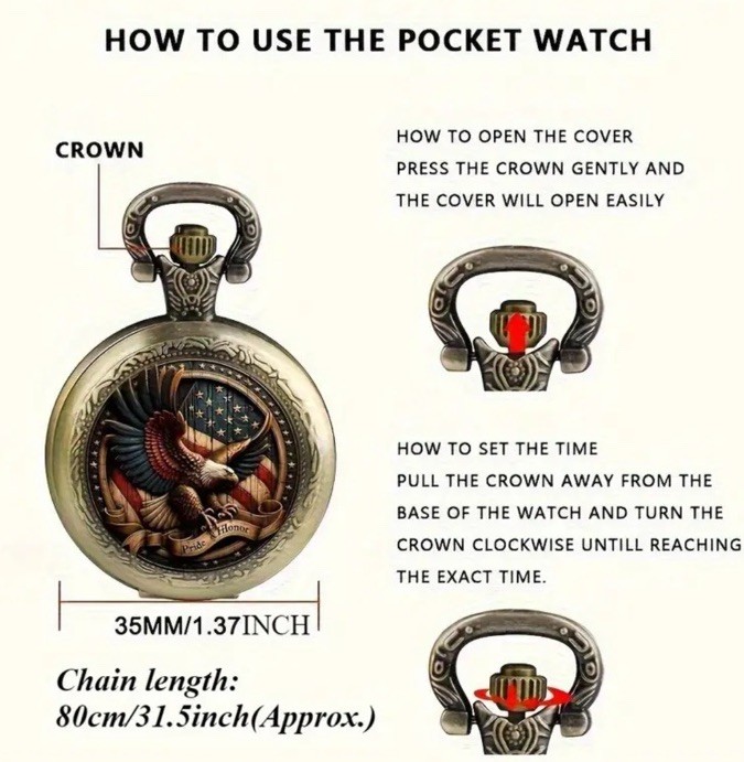 This new American Eagle Pocket Watch is a stylish and unique timepiece with a hand-winding mechanical movement. This retro-themed pocket watch comes with a chain and in original wrap (not a box) for easy carrying and is perfect for both men and women. It includes a 12-hour dial and original packaging, making it a versatile and eye-catching accessory for any outfit. Made from durable alloy material, this pocket watch exudes luxury and sophistication for those looking for a vintage-inspired watch.