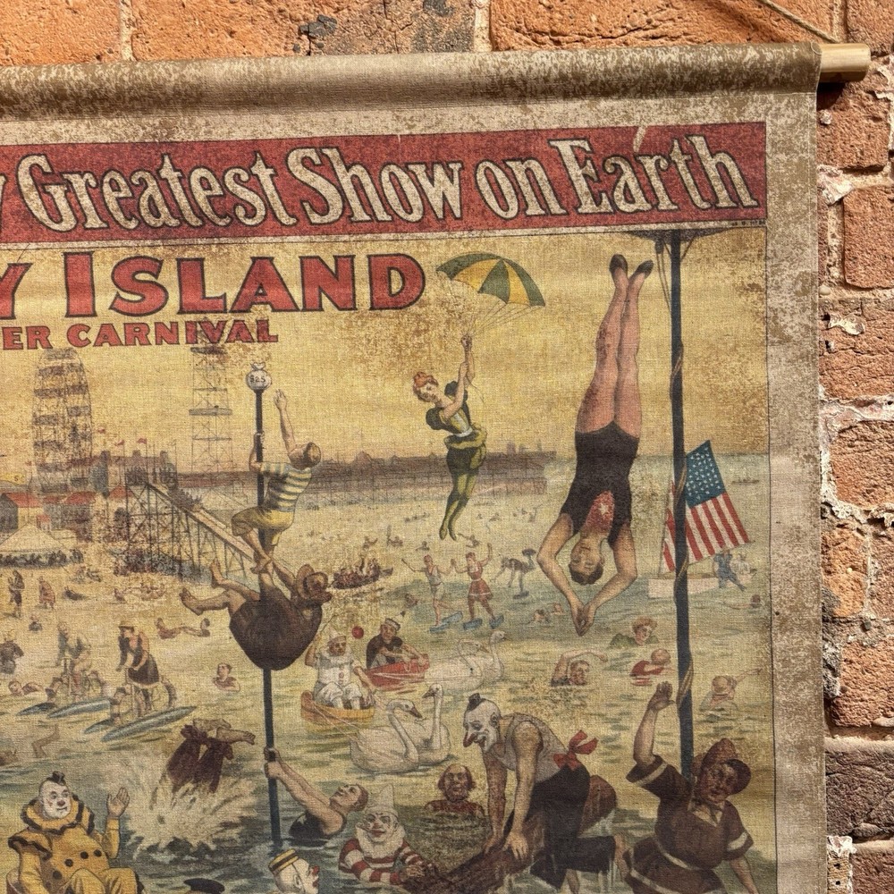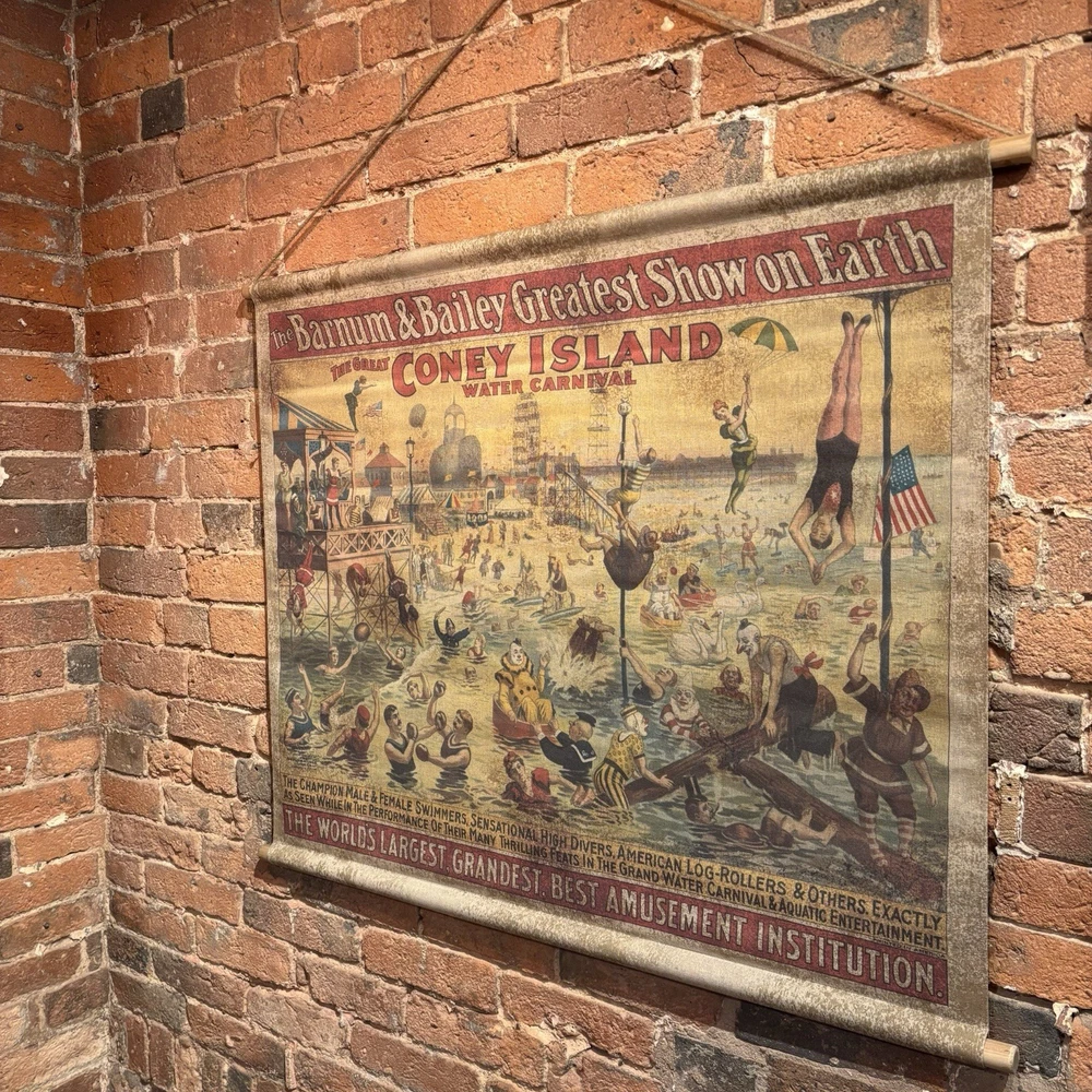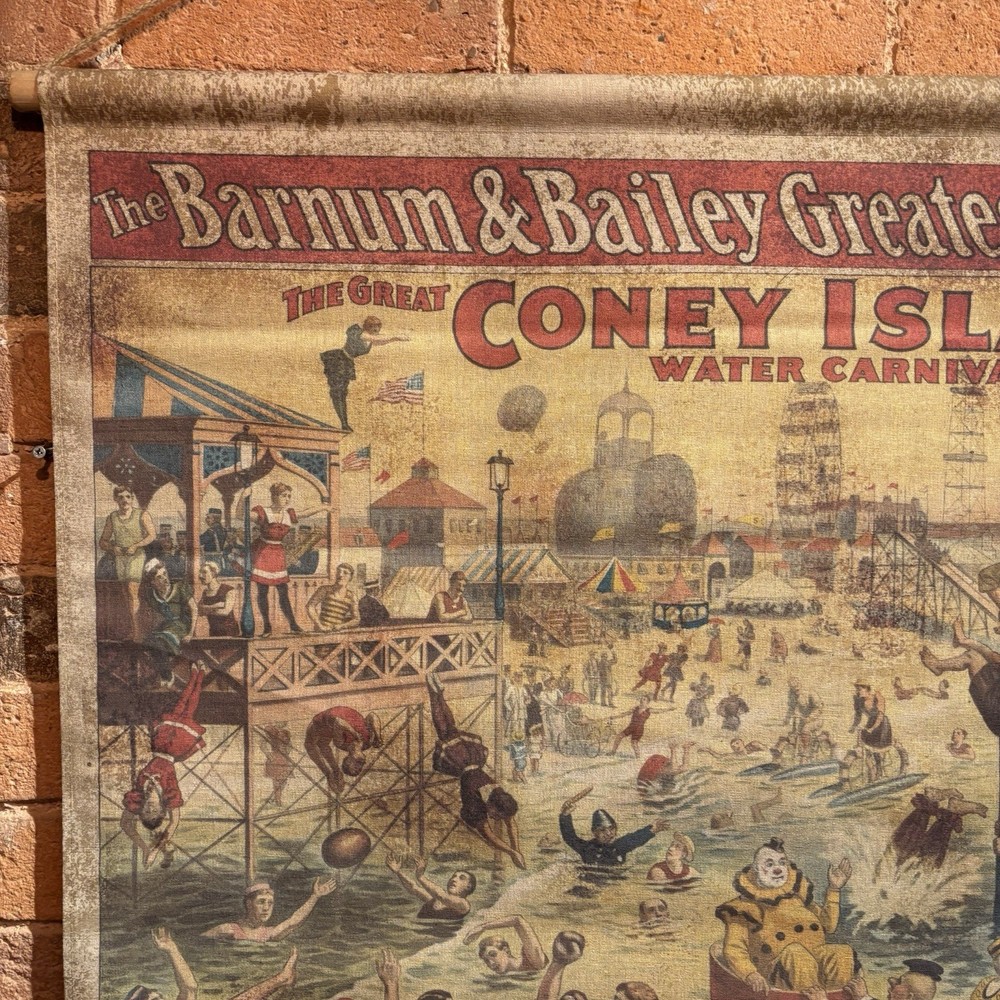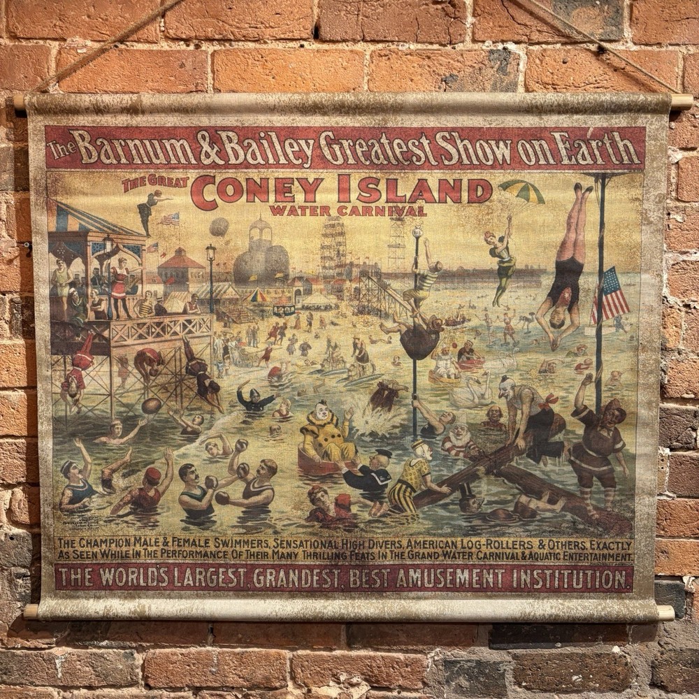 Circus Themed Fairground Wall Art Large canvas wall art that is in the stye of traditional fairground advertisement. Great statement pieces for large wall coverage! Please note that this is not an original piece, but a quality reproduction that makes for a great wall feature! Dimensions: Height: 81cm Width: 106cm Depth: 3cm Free UK delivery with ParcelForce. Please enquire for more details. *Please note that this is also listed on our own website, therefore this listing may end suddenly if sold through there*
