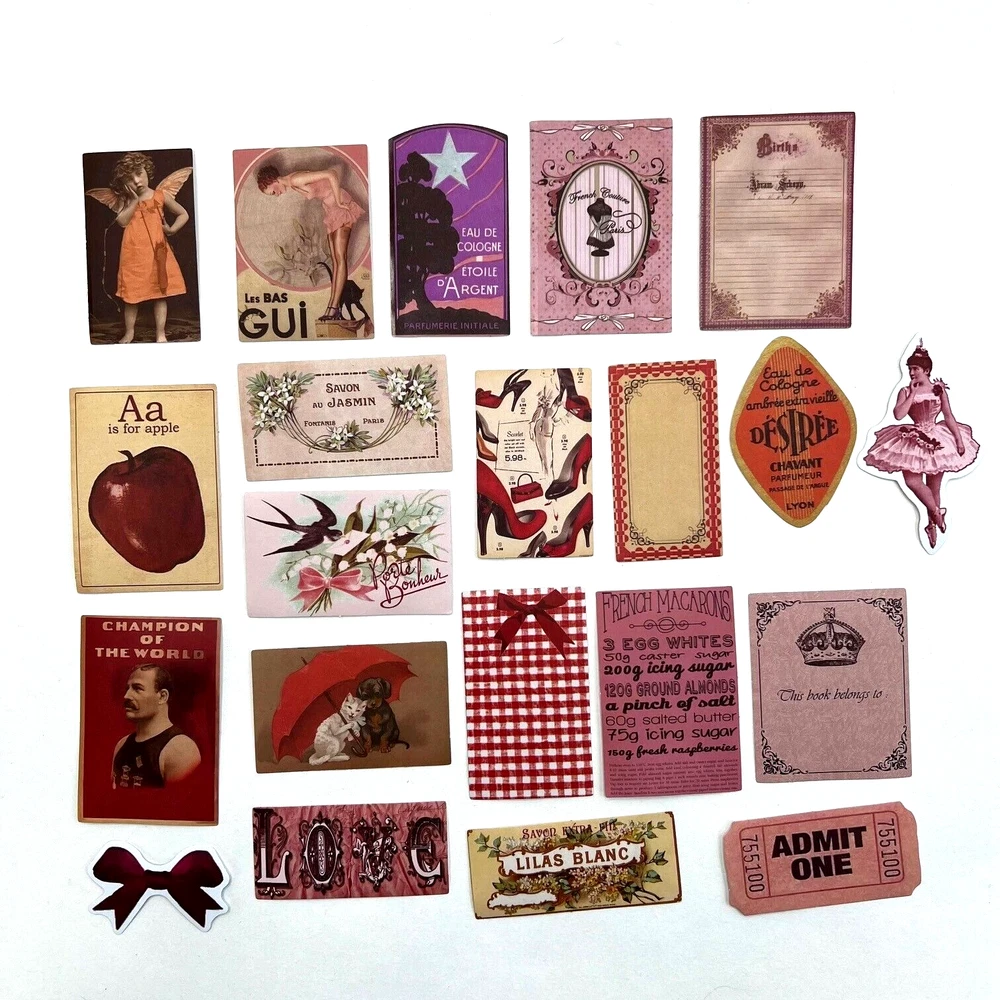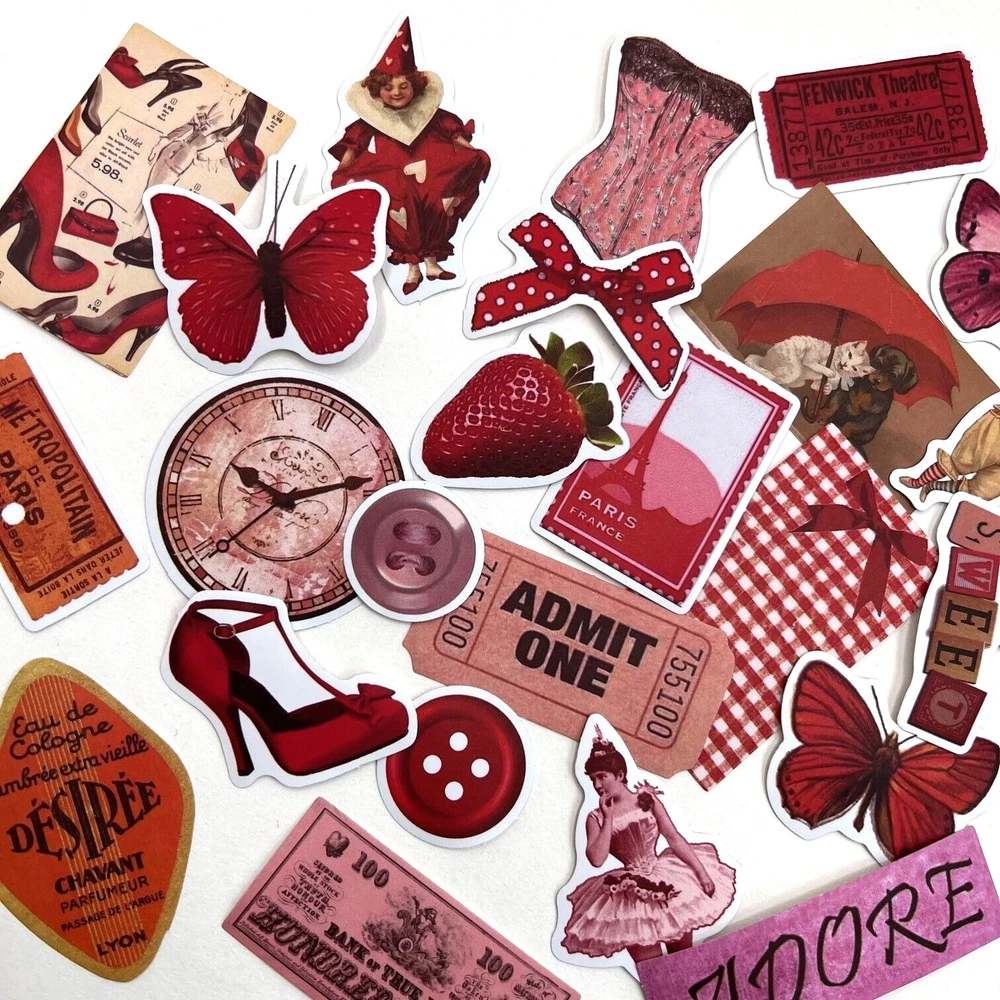 60 stickers. Red hued vintage style. The sticker in the last photo measures approx. 2 1/4 inches tall. These stickers have a nice feel to them. I have more stickers, washi tape and paper for sale. I do combine shipping. Please put all the items you want to purchase in ONE cart and then pay. I will refund you the difference in shipping after shipping label is printed. Let me know if you have any questions through eBay messaging. Thank you for stopping by!