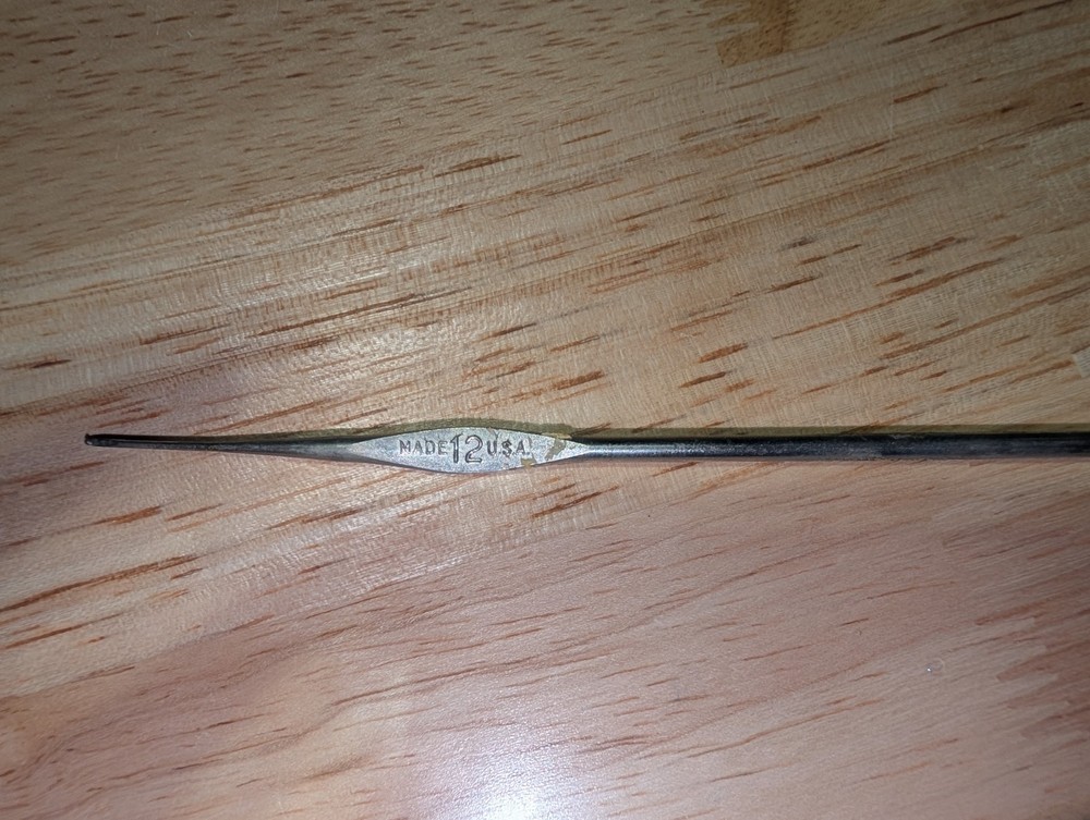 This vintage crochet hook is a dream to work with! The smooth aluminum glides through yarn effortlessly, making intricate stitches a breeze. Despite a bit of patina, it's still sturdy and reliable—perfect for delicate projects. A must-have for any crocheter who loves classic tools with character!