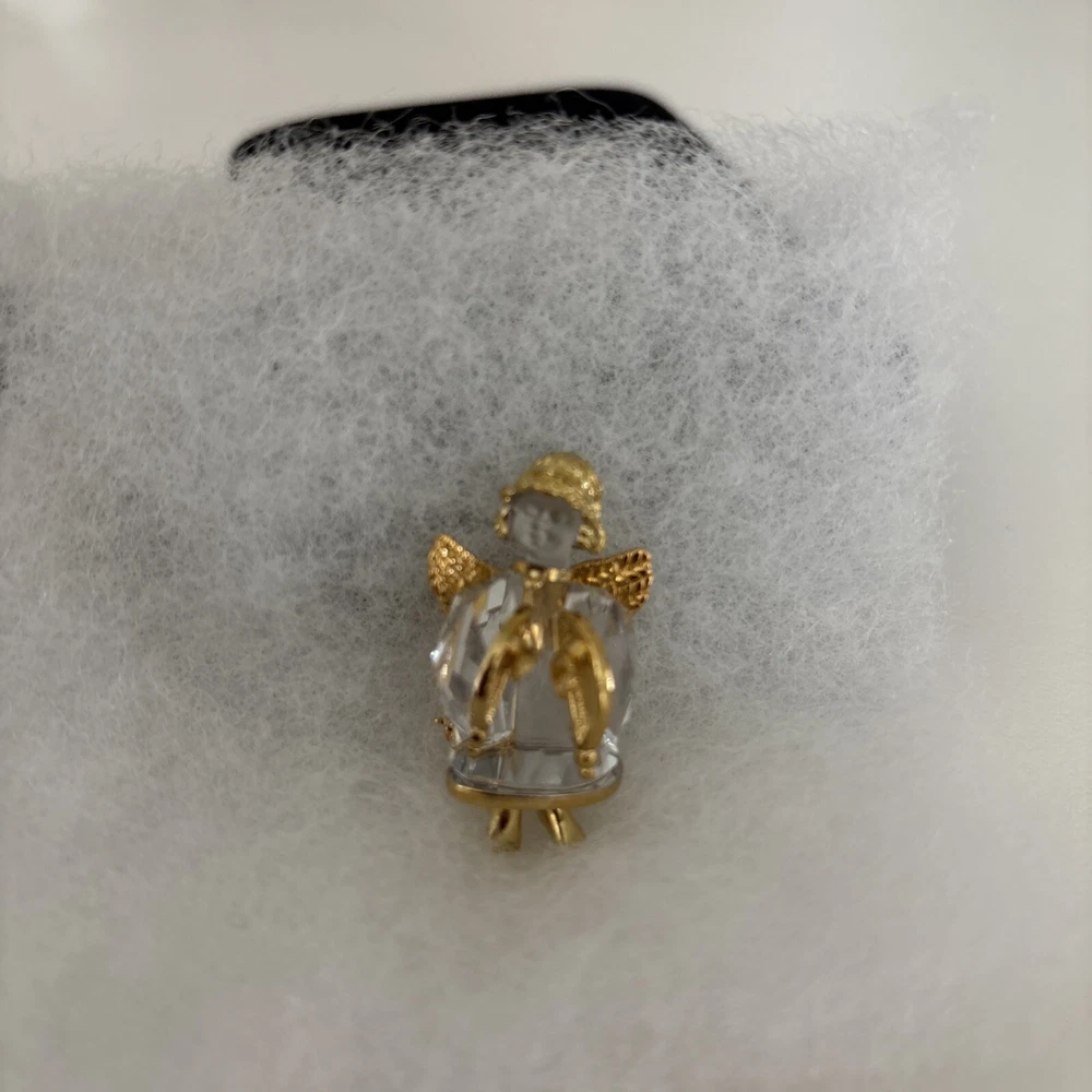 This vintage Swarovski Crystal Angel pin brooch features a dazzling crystal design. The brooch is adorned with an angel theme, making it a charming and elegant accessory. Perfect for collectors or those who appreciate vintage jewelry. All original box & paperwork included.