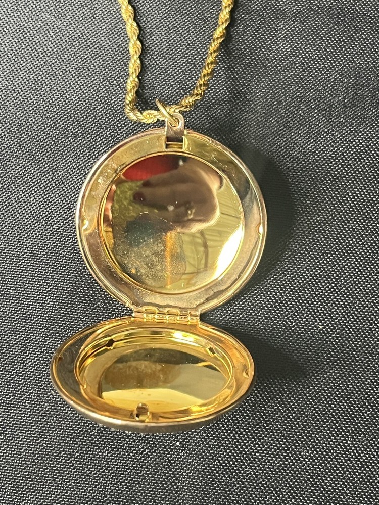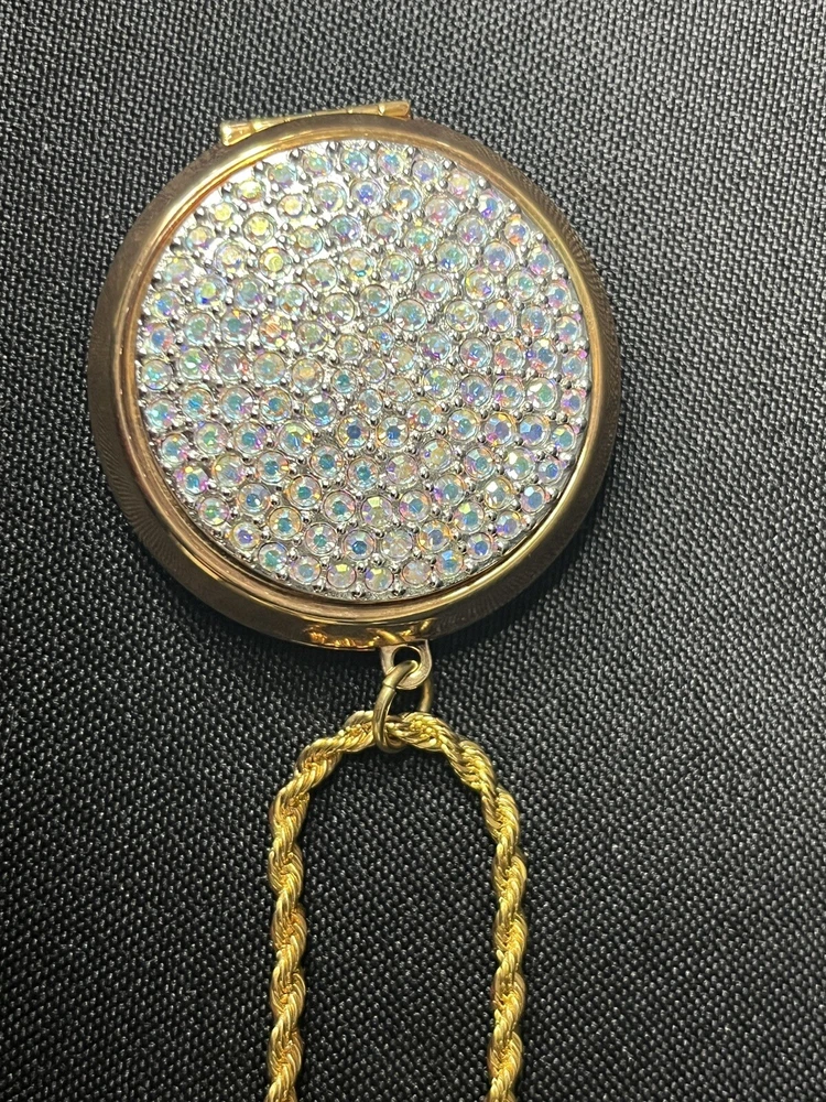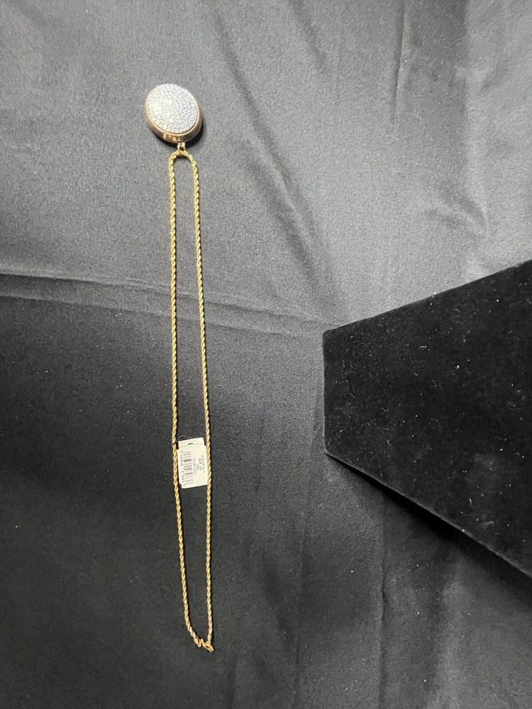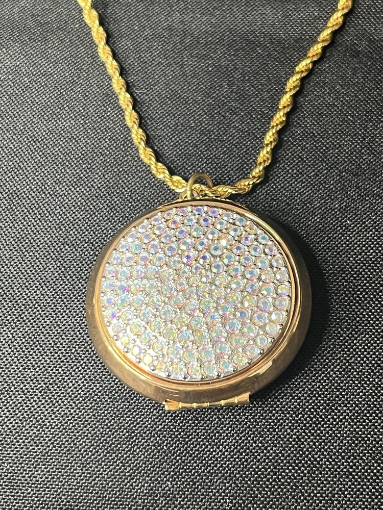 This stunning Swarovski necklace features a shimmering crystal round pill box/locket in a pavé setting, perched atop a 32" gold tone chain. The round pendant is a gorgeous addition to any jewelry collection, and the chain is long enough to wear as a standalone piece or to pair with other accessories. The necklace is perfect for any occasion and would make a fantastic gift for a loved one. The brand is well-known for its high-quality crystal jewelry, and this piece is no exception. The gold tone chain adds a touch of elegance to the overall design, while the crystal swan is a unique and eye-catching element. The necklace is sure to be a favorite among necklace enthusiasts. MM