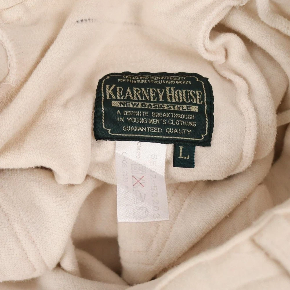 Upgrade your casual wardrobe with these vintage sweat shorts from Kearney House. Featuring a zip closure and drawstring waist, these cargo-style shorts are both stylish and functional. The 5-pocket design provides ample storage space, while the flat front and mid-rise fit give them a classic, timeless look. Perfect for summer, fall, or spring, these shorts are made from easy-care cotton material and are machine washable for your convenience. In addition to their practical features, these shorts also boast a hipster and school-themed design, making them a versatile choice for any casual occasion. With a solid white color and adjustable waist, these shorts are sure to fit comfortably and look great on any man. Don't miss out on this vintage gem! Tag Size: Men’s Large Best Fit: * Men: M/L Condition: Minor Yellowing Towards Waist Approximate Flat Measurements: * Waist: 15” * In Seam: 19” * Out Seam: 9” All items are second hand, many being vintage and may have small imperfections. Anything major is noted.