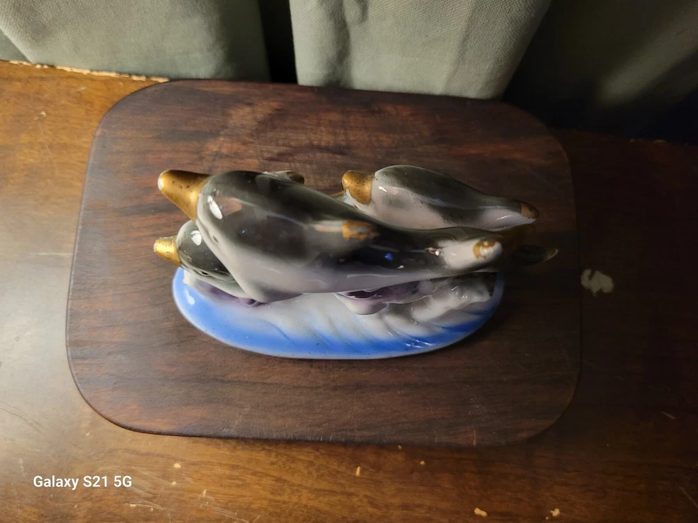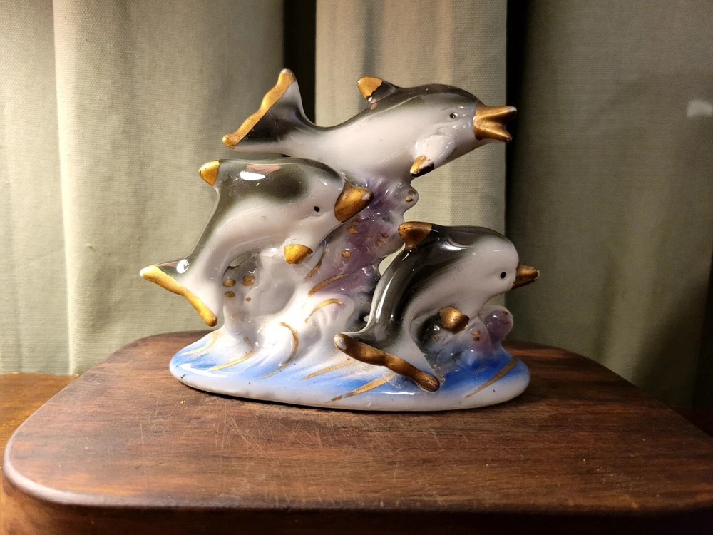 Vintage Swimming Dolphin Family Shell Figurine Ceramic Porcelain Nautical. Condition is Used. Shipped with USPS Ground Advantage.