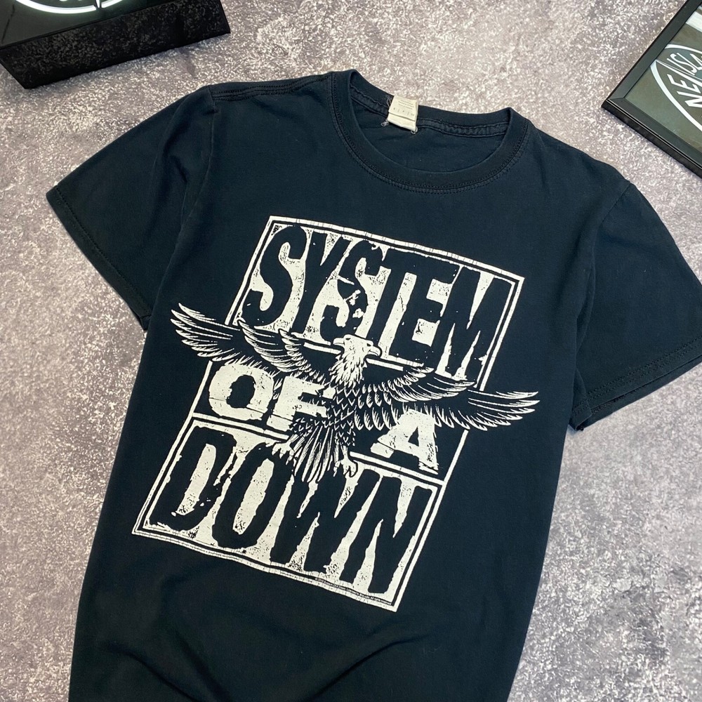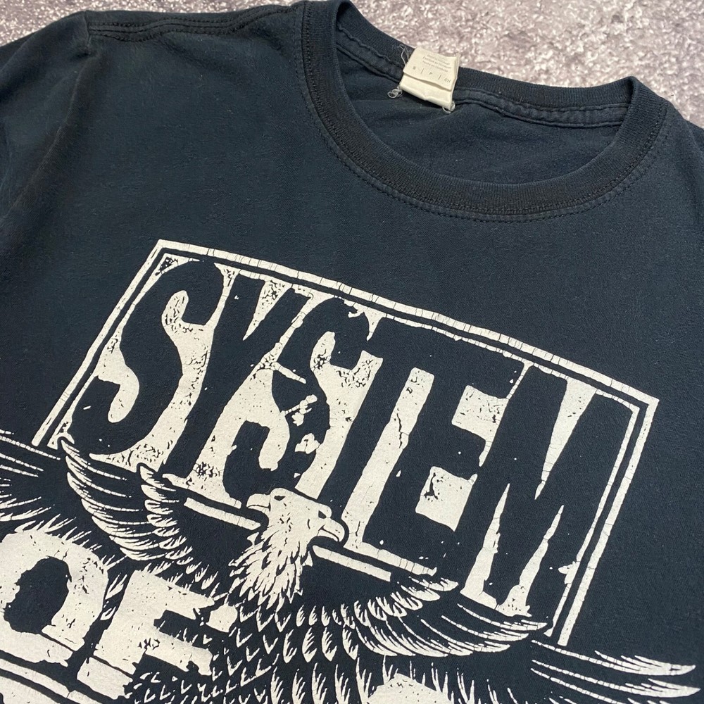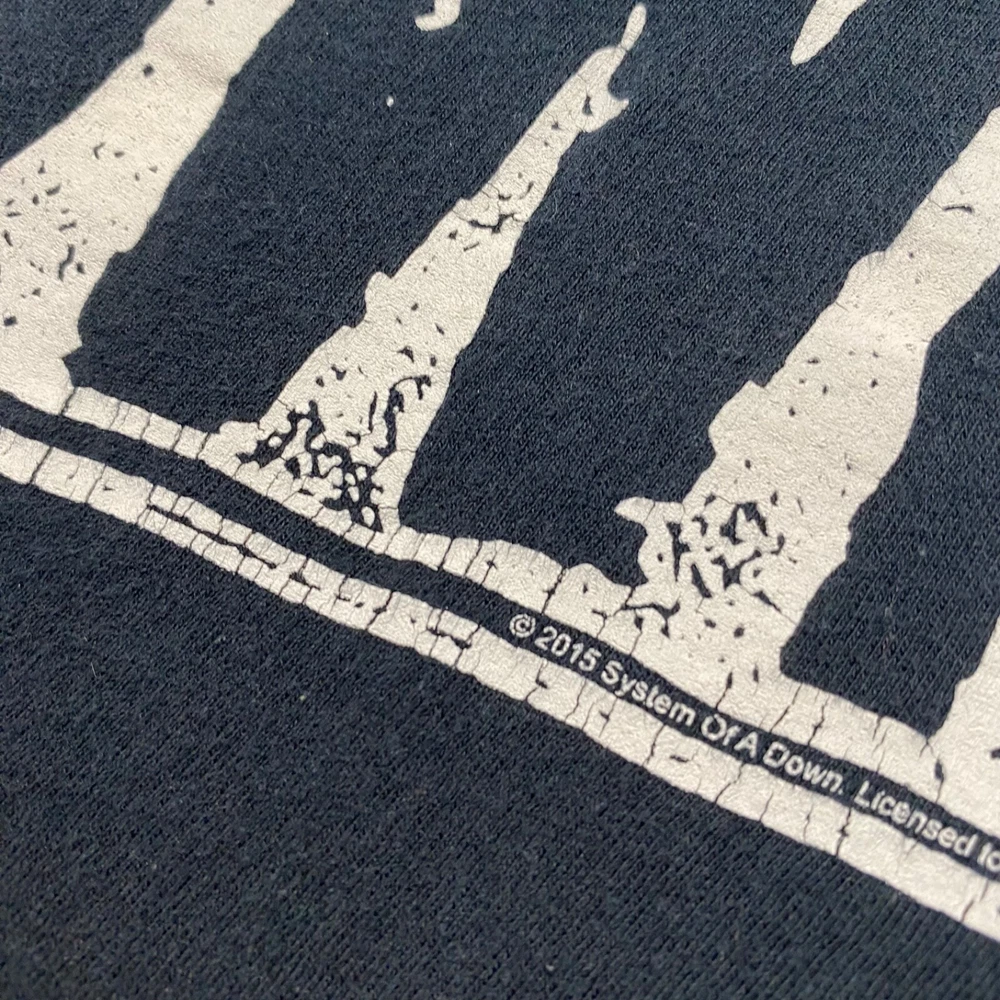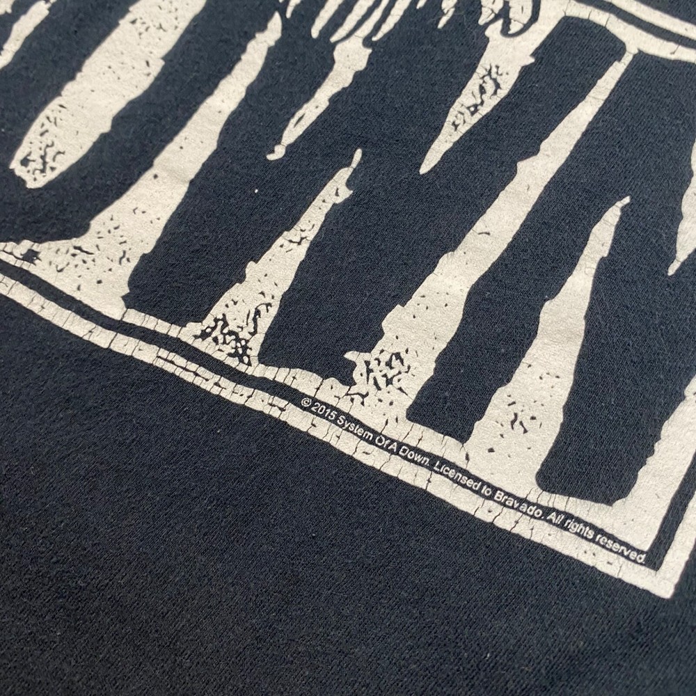 This is a vintage blue t-shirt with a short sleeve and regular fit made of cotton material. The shirt features a 2015 design of the rock band System of a Down. It is available in size small for men.