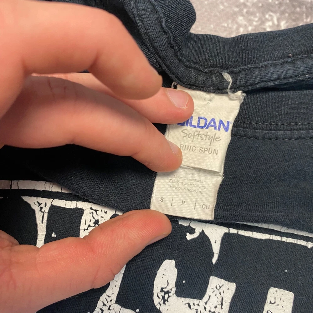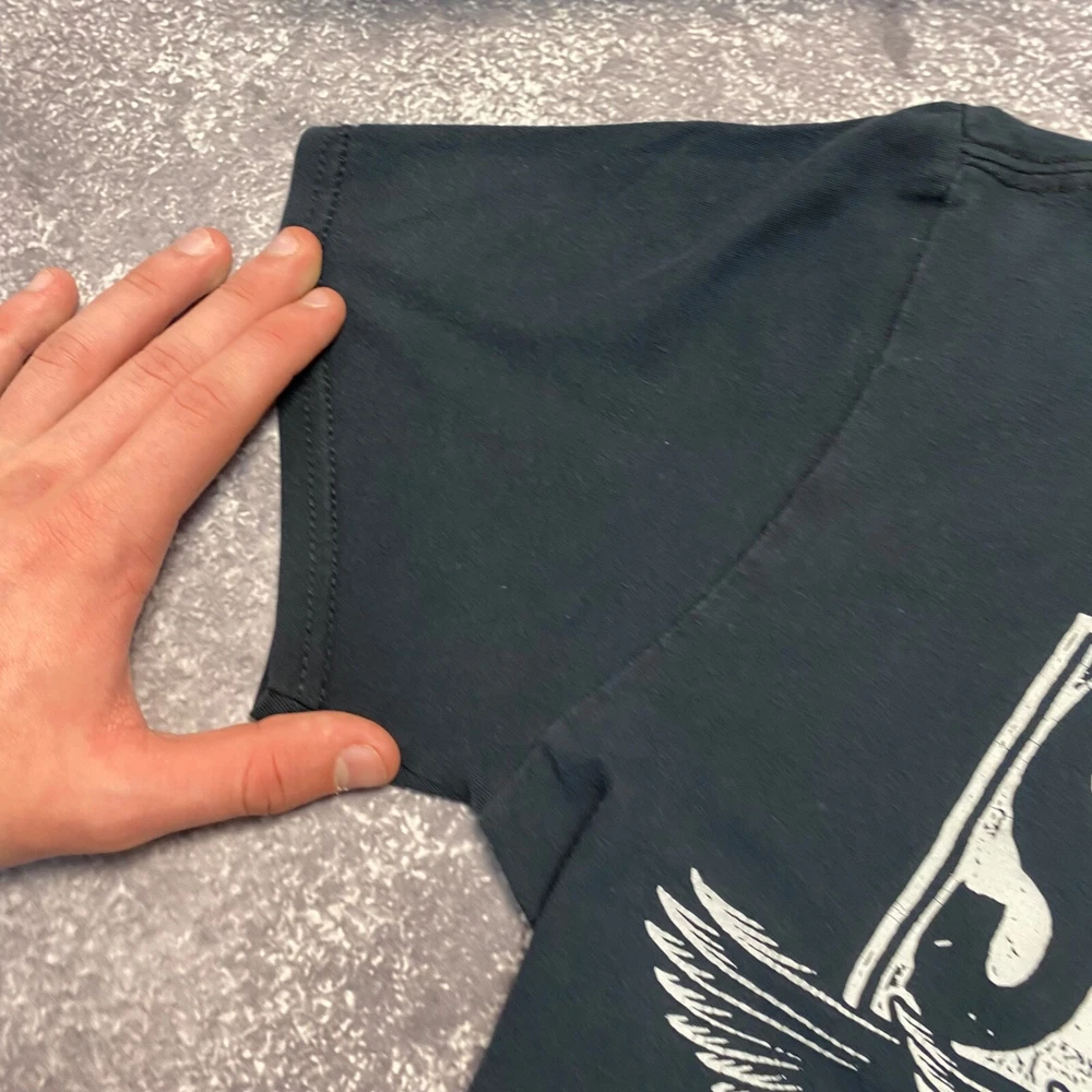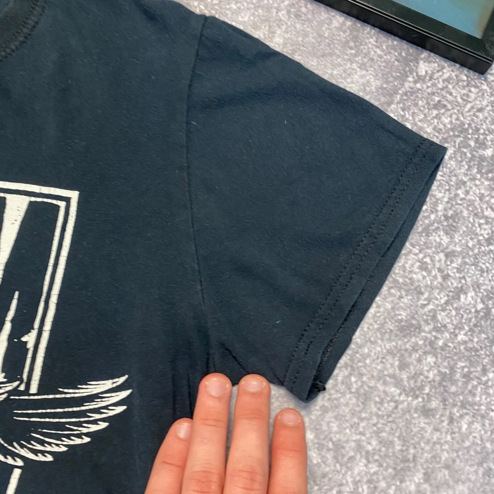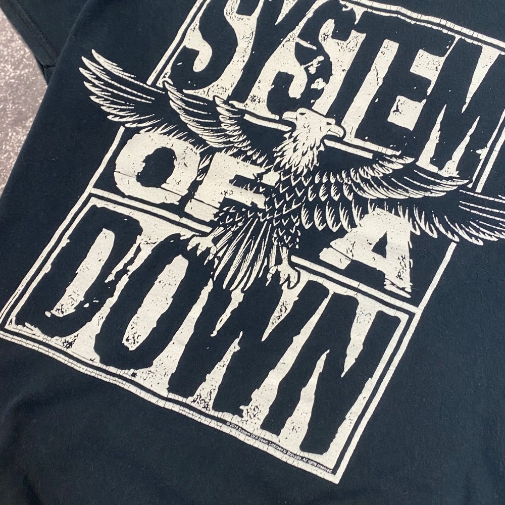 This is a vintage blue t-shirt with a short sleeve and regular fit made of cotton material. The shirt features a 2015 design of the rock band System of a Down. It is available in size small for men.