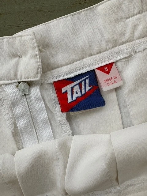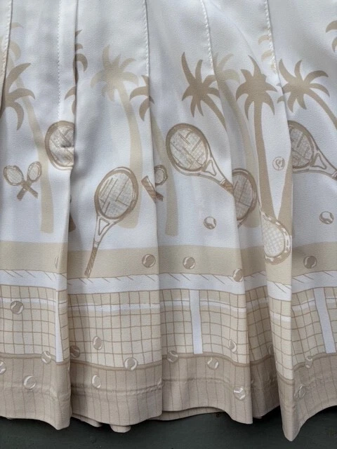 This is a listing for a pre-owned vintage Tail tennis skirt in a size 8 (modern small). It is made in the USA and has an adorable palm tree tennis racquet & ball graphic print and elastic side panels at waist. It has a back zipper closure. Please ask all questions prior to auction end for all sales are final. Thank you & good luck! BRAND: TAIL SIZE: Vintage US size 8. 14" across waist lying flat, 15.5" in length Fabric: 100% polyester Unlined Made in USA