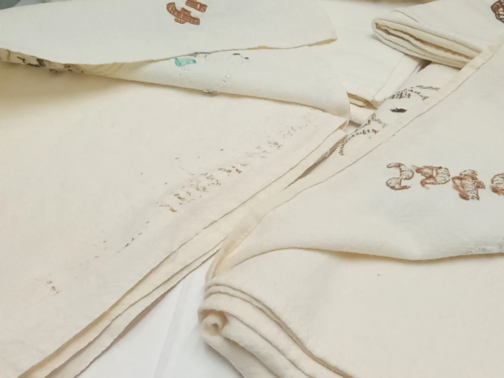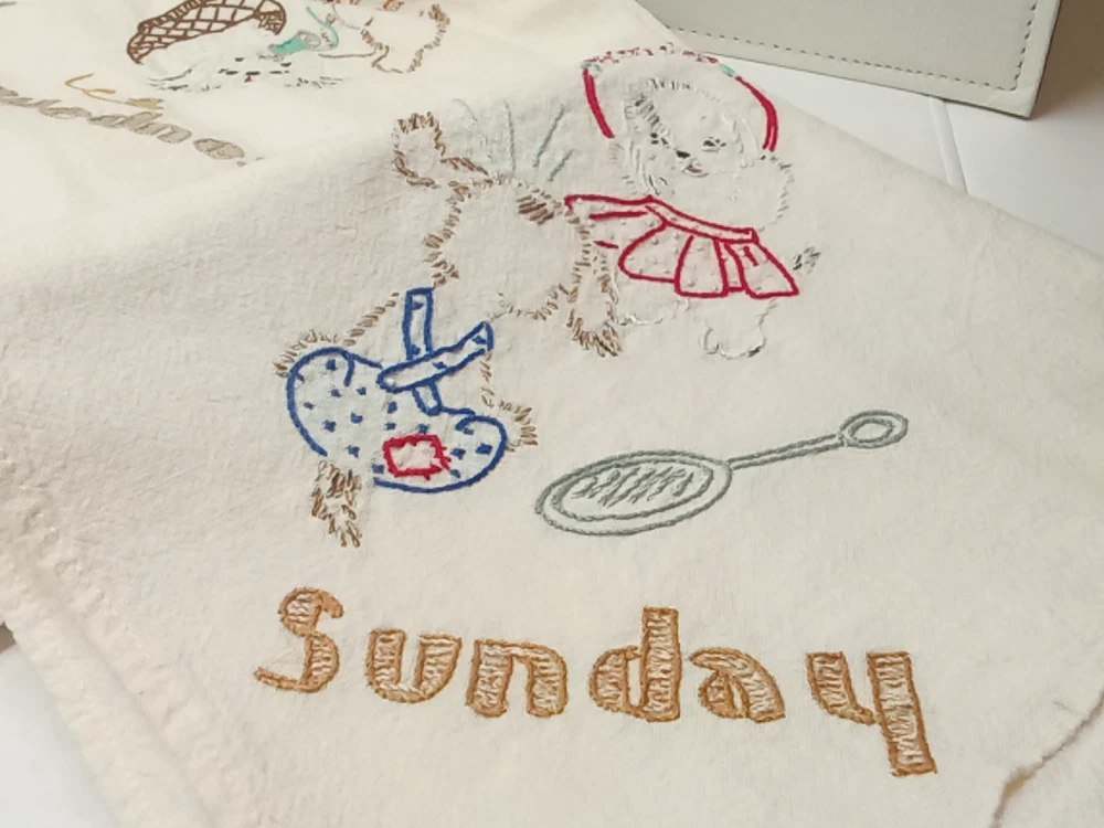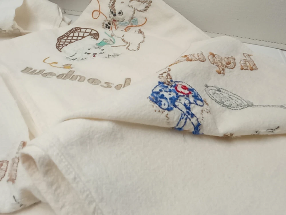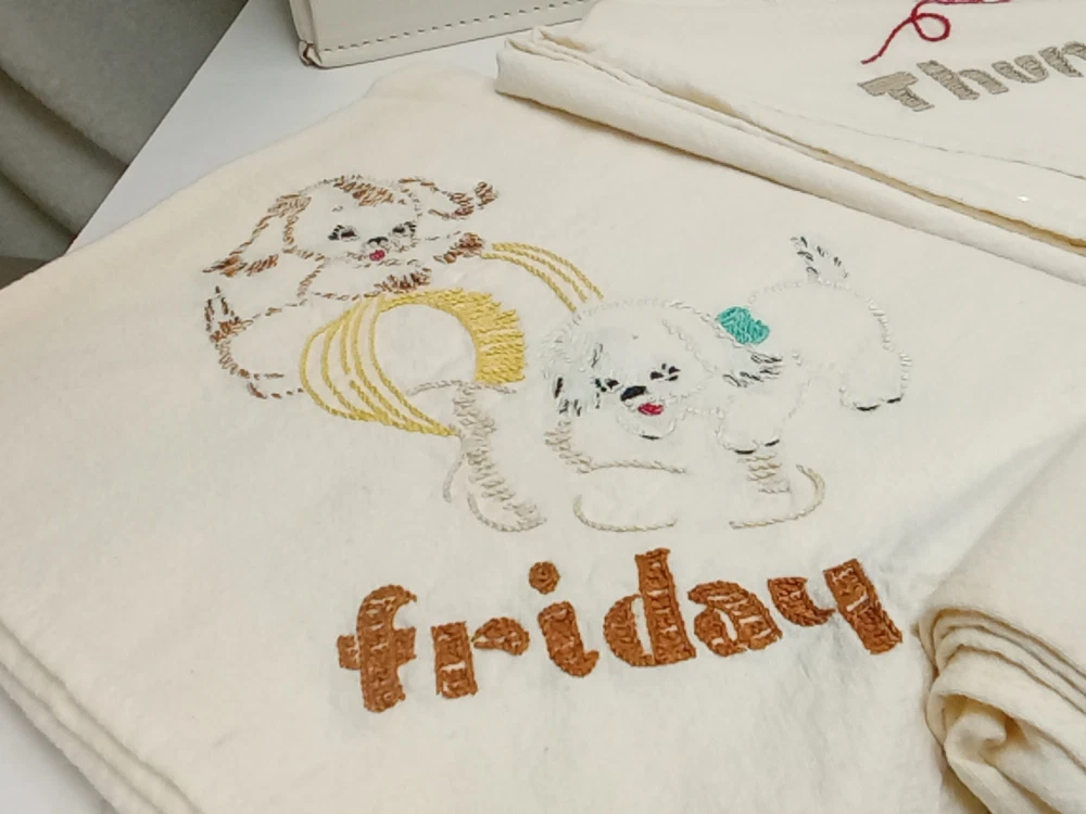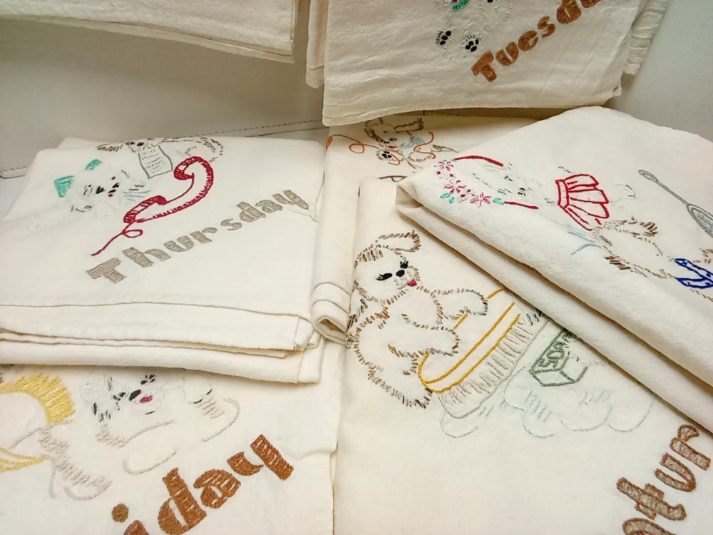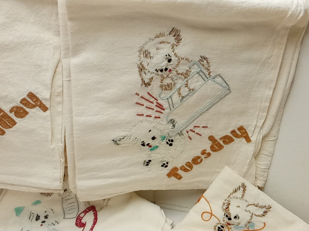 Vintage Linens Bedding Sheets Pillowcase Table Decor Cutter Fabric Textile Collectible -- Vintage Tablecloth Set-7 Days of the Week, Quality Hand-Embroidered Puppy Kitsch Square 35x36 In pre-owned* condition, appears used with general wear to include: wrinkles, some yellowy discoloration, couple faint spots, some stains on friday - see pics for detail. Style: Embroidered, Crochet Trim, Hand Stitched, Textile, Handmade, Sewing, Scrap Project, Remnant Fabric, Recycle Upcycle, Rescued Salvaged, Home Decor, Sewist, Crafter, Quilter, Wall Hanging, Table Dressing, Kitchen, Measures Approx: Length: 36 " Width: 35 " i# Hbx3779 Weight: 2-Lb 8- oz Condition: Items are quality pre-owned*, stylish, gently loved items with unique finishes and details. Any outwardly visible flaws will be noted - refer to photos as part of description. SHIPPING: Gift packaged securely with wrap, padded mailers, and boxes. Shipped USPS Priority Mail or First class Advantage, depending on weight and destination of item.