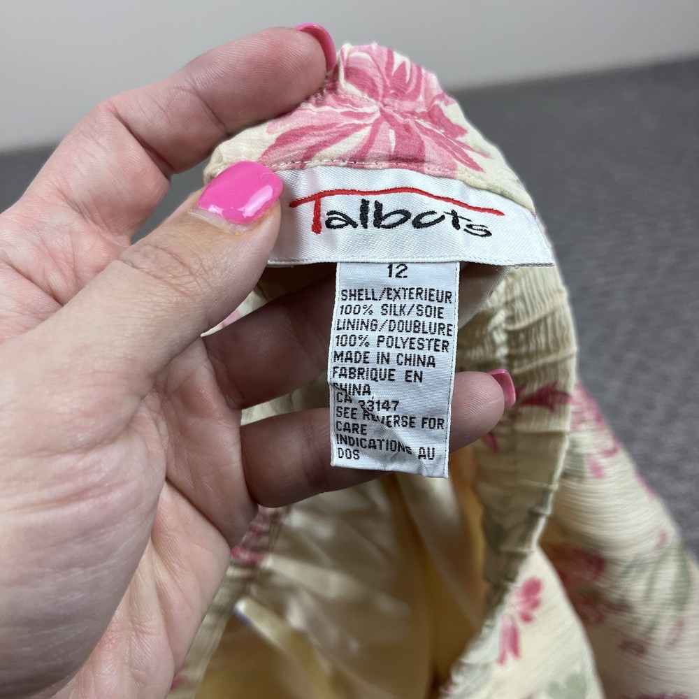 Closure: Zip Size: 12 Garment Care: Dry Clean Only Size Type: Regular Occasion: Business, Party/Cocktail Personalize: No Features: Lined Color: Yellow Department: Women Style: A-Line Skirt Length: Midi Material: Silk Seller Notes: “Very good preowned vintage condition” Handmade: No Fabric Type: Chiffon Brand: Talbots Season: Fall, Spring, Summer Vintage: Yes Type: Skirt Pattern: Floral Theme: 90s, Flower, Retro