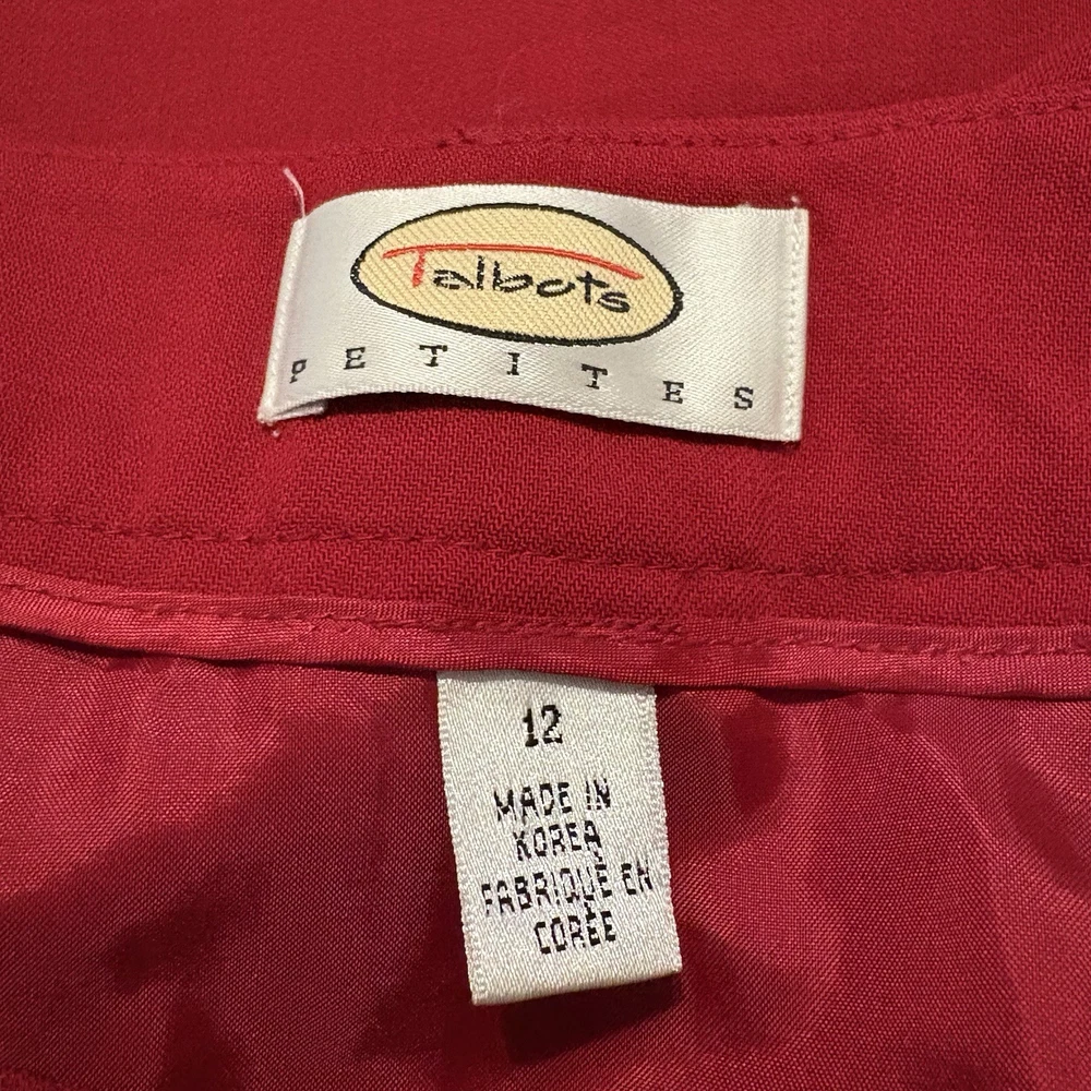 This Vintage Talbots Wrap Skirt in Women's Petite size 14 features a classic red paisley pattern, made of 100% wool knit fabric. The skirt has a button closure and a mid-rise, A-line style, perfect for various occasions such as travel, party, casual, and business. With its colorful theme and 80s/90s vibe, this skirt is a timeless piece that adds a touch of vintage charm to any wardrobe.