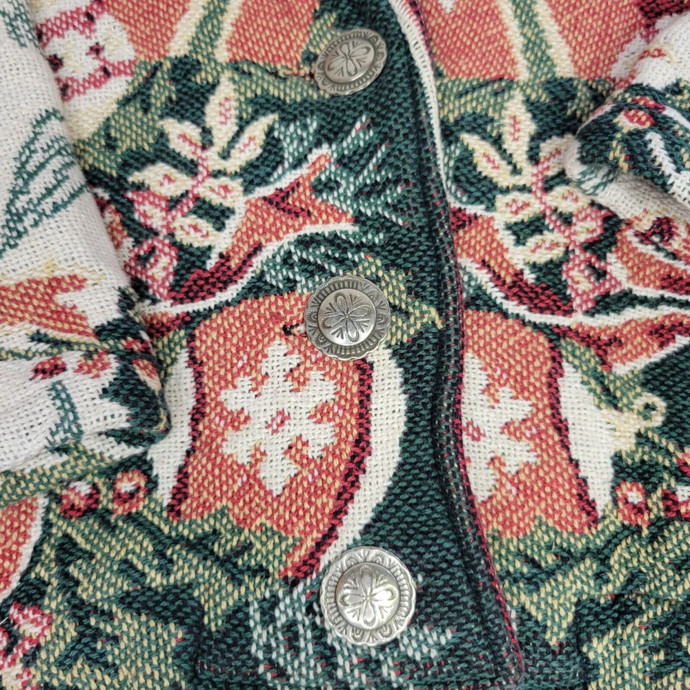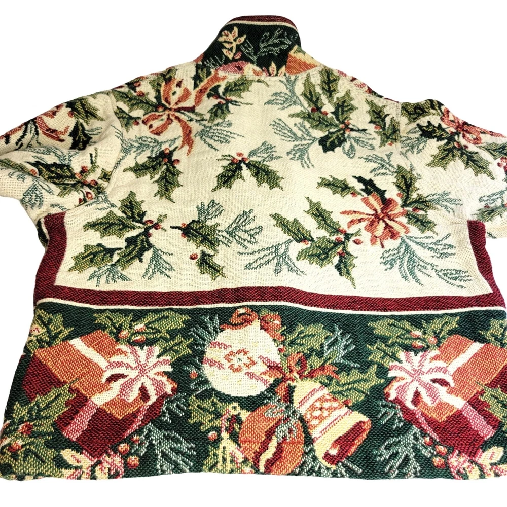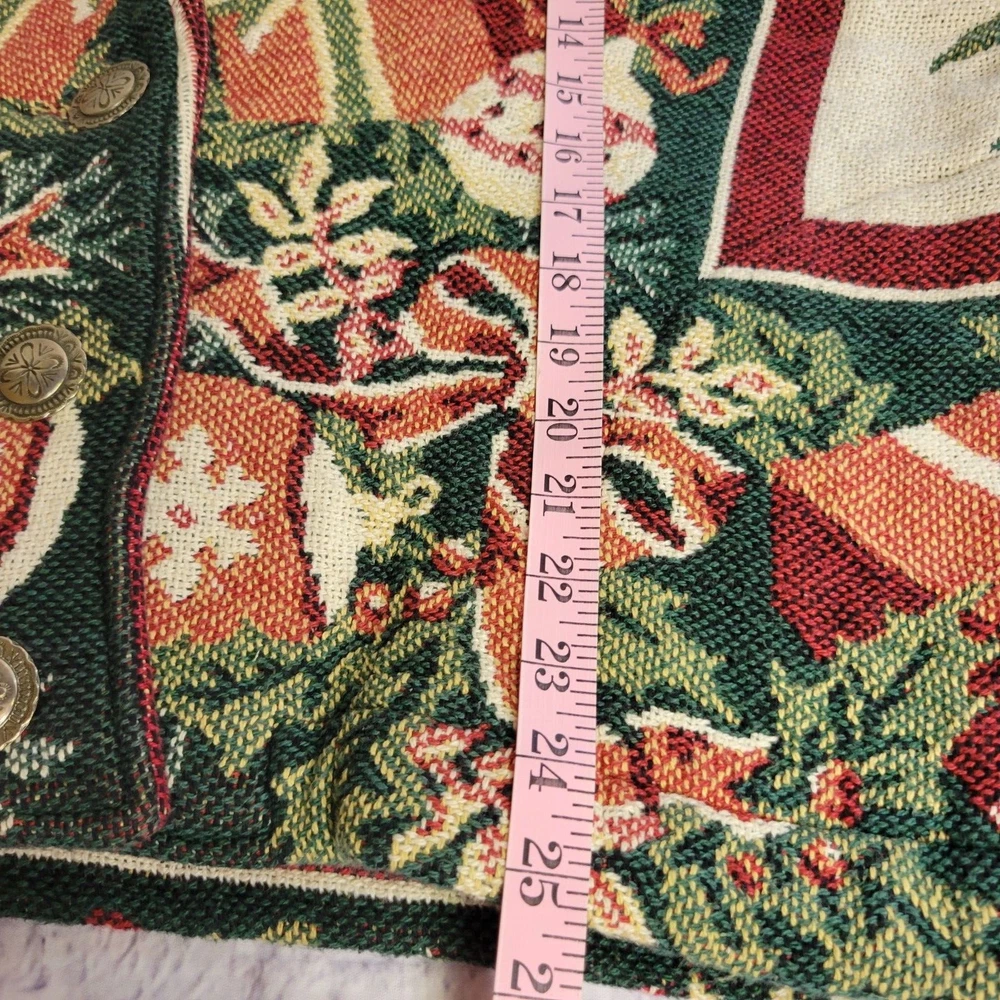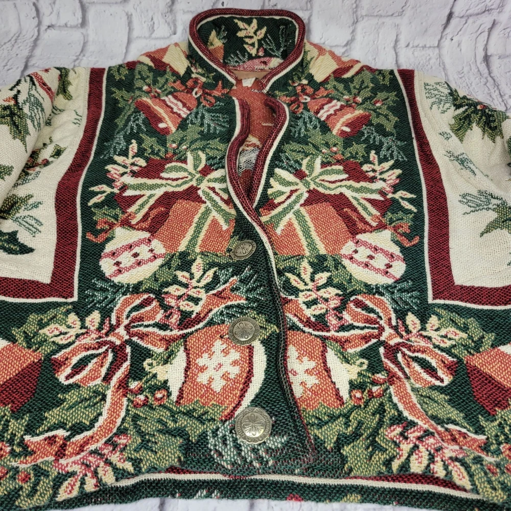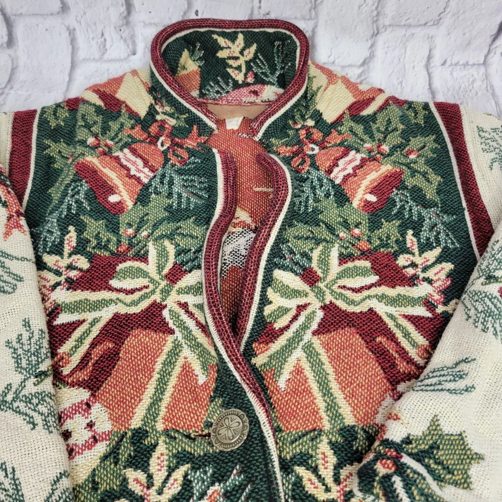 Vintage Tapestry Holiday Jacket One Size 100% Cotton Button Front Festive Design This tapestry jacket features a vibrant holiday-themed pattern, making it a stylish addition to festive wardrobes. The button front offers classic appeal, while the tapestry design showcases intricate details. • Button Front Closure and Pockets • Made Of 100% Cotton • Holiday-Themed Pattern • Tapestry Style Design • Dry Clean Only