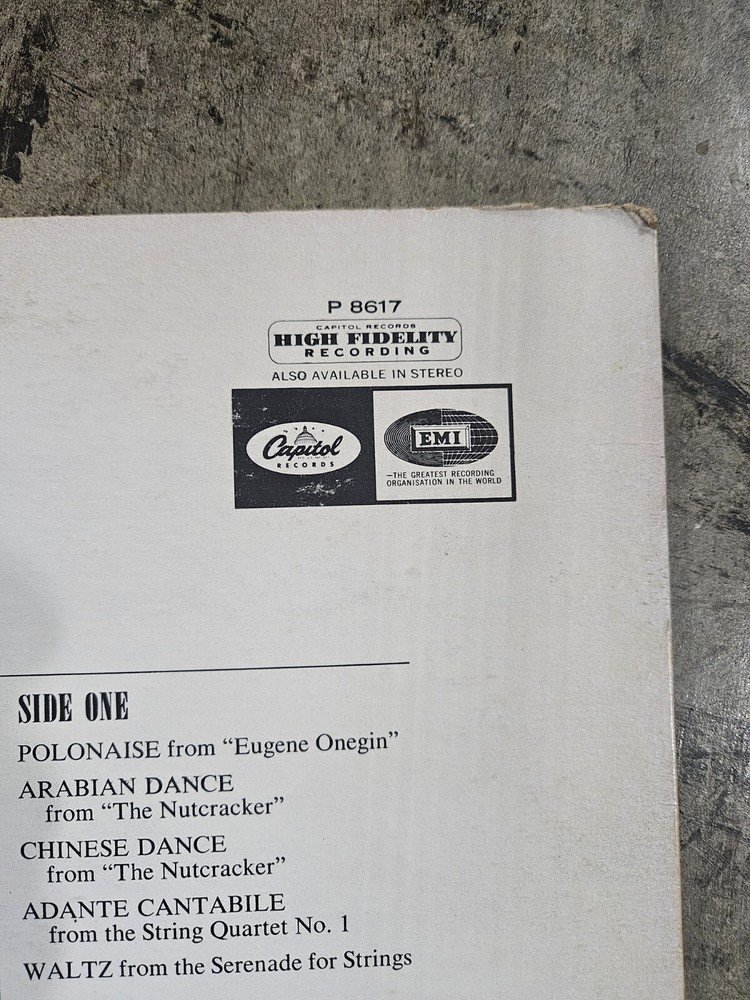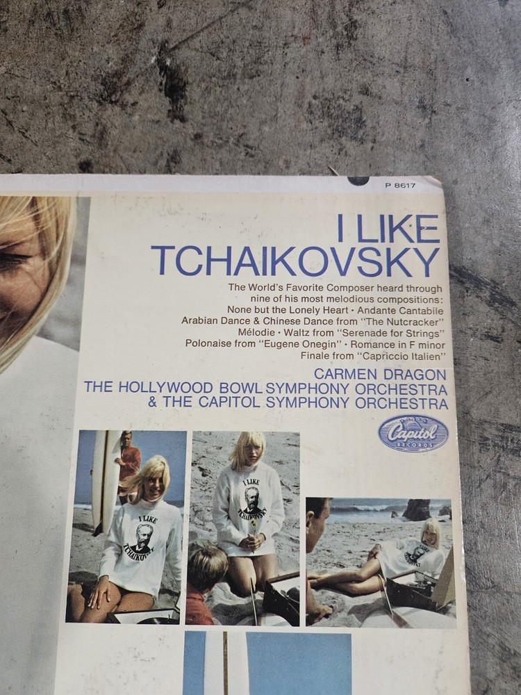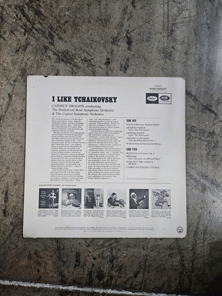 This vintage LP features the Hollywood Bowl Symphony Orchestra's performance of Carmen Dragon's "I Like Tchaikovsky" album, released by Capitol Records. The 12" vinyl record has a speed of 33 RPM and is in the classical genre. The record grading is Very Good (VG) and the material is vinyl. The album is a rare find for collectors and classical music enthusiasts alike, with its unique combination of classical music and Hollywood orchestral sounds. The LP format and record size make it a perfect addition to any vinyl record collection. This item is a must-have for any music lover and is sure to be a prized possession for years to come.