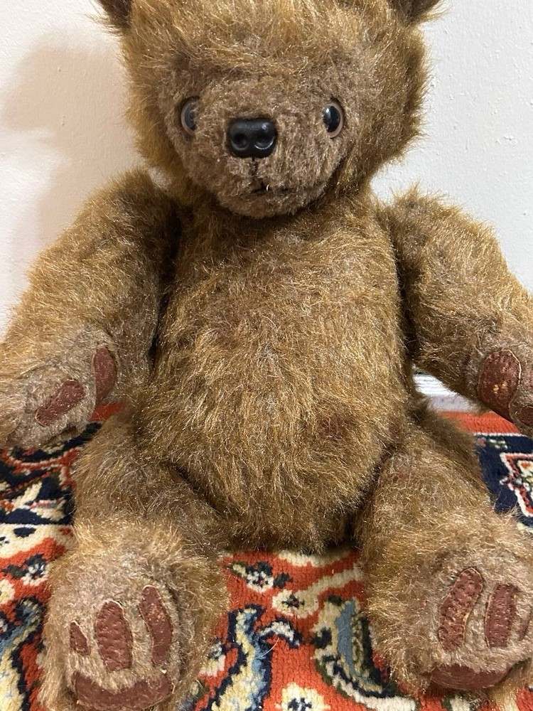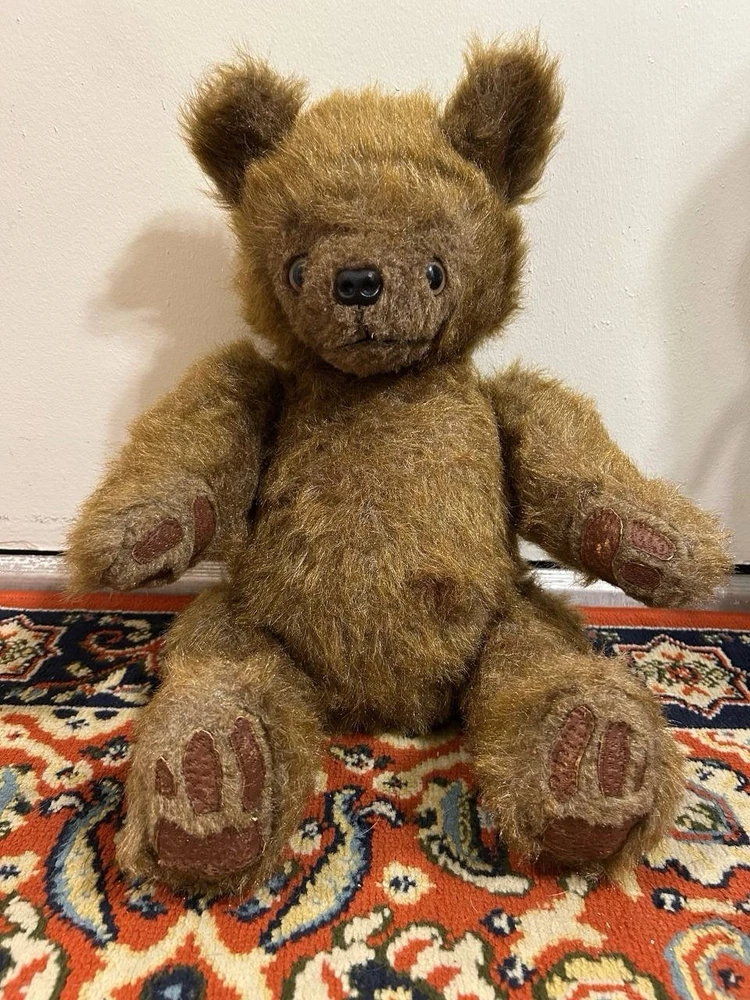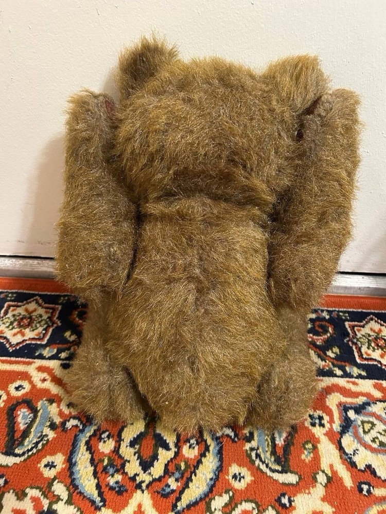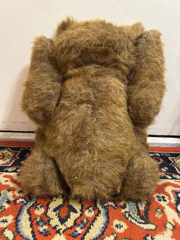 Vintage teddy bear plush in classic brown color. This bear has a well-loved, authentic vintage look with worn fur and visible age, making it perfect for collectors or decorative use. • Color: Brown • Material: Plush / stuffed • Condition: Pre-owned vintage condition with signs of wear (see photos) • Features: Original nose, paw pads, and stuffing intact • No visible brand tag (unknown maker) There is a mechanism inside, but it doesn't work This bear has a unique character and charm that only comes with age. Great for collectors, vintage decor, or restoration projects. Please review all photos carefully for condition details. Sold as-is.