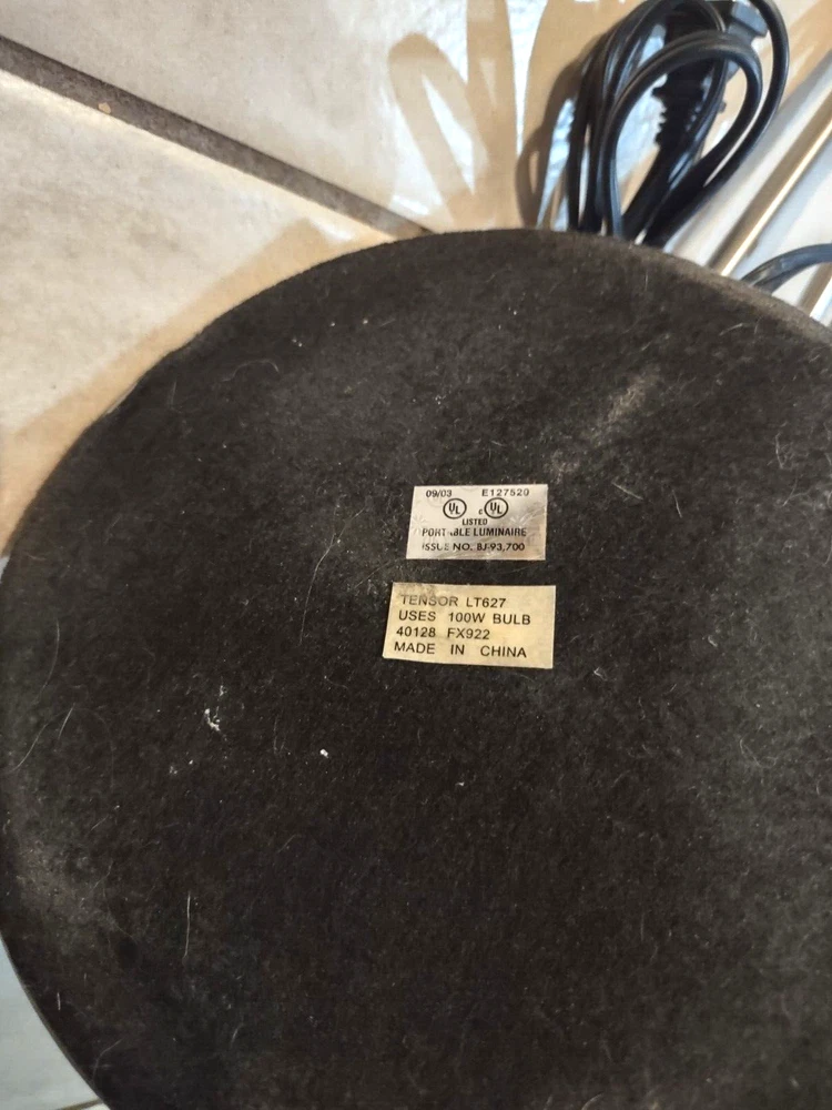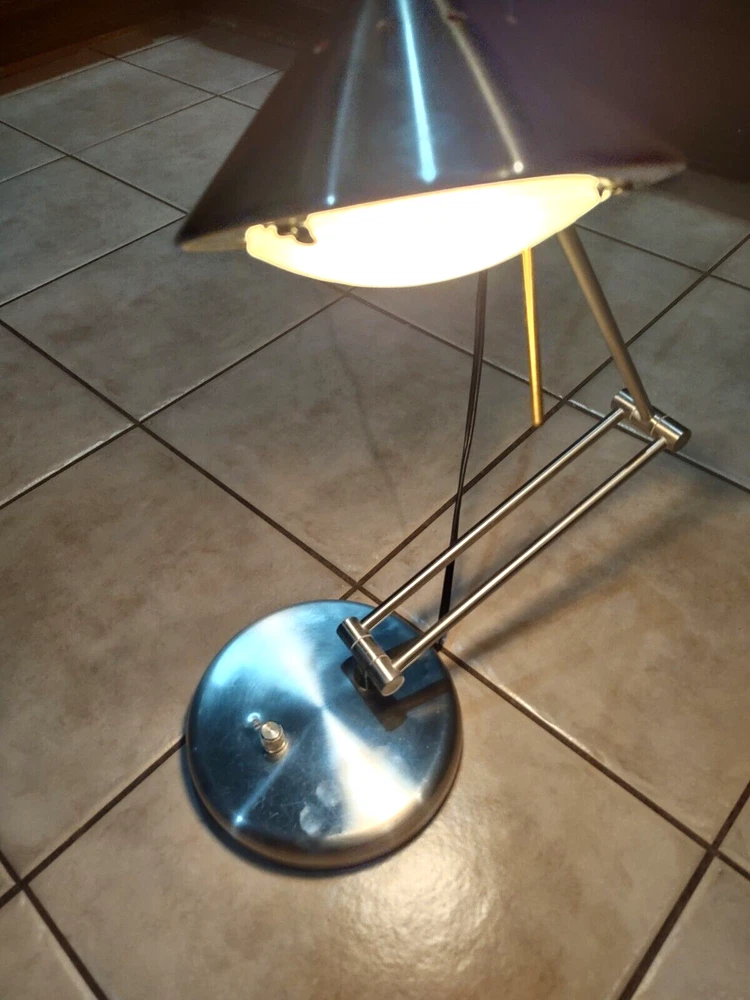 In great pre-owned working condition. Silver toned (brushed nickel) with gold accents. Some scratches on the top. See photos for details & message me with any questions. Manufactured in the 1990s Rotary dimmer switch on the base. Articulated arms. Each arm 12 inches long so total height can be up to 24 inches. Sturdy heavy base. Halogen lamp Lamp weight (before shipping) is 6.5 lbs.