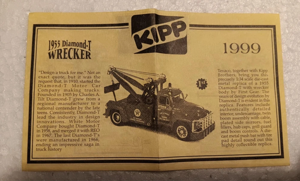 This limited edition Texaco 1955 Diamond T Wrecker Diecast 1:34 Scale Truck by Kipp Brothers is a must-have for any collector. The red color and Texaco theme make it a unique addition to your collection. The truck is made of high-quality diecast material and features a wrecker model. The vehicle year is 1955 and it was manufactured in 1999. This truck is part of the First Gear series and is a 1:34 scale. It is perfect for display or as a gift for someone who loves Texaco or vintage trucks.