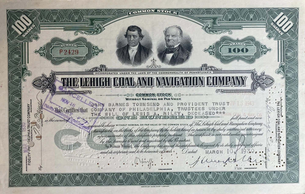 This vintage stock certificate from The Lehigh Coal And Navigation Co. is a rare find for collectors. With 100 shares, it represents a piece of history in the transportation industry. The certificate features the company's name and logo, and is a testament to their legacy. Ideal for those interested in coins and paper money, or those who appreciate scripophily, this certificate is a unique addition to any collection. It falls under the categories of Coins & Paper Money, Stocks & Bonds, and Railroads. Don't miss your chance to own a piece of history with this vintage stock certificate from The Lehigh Coal And Navigation Co.