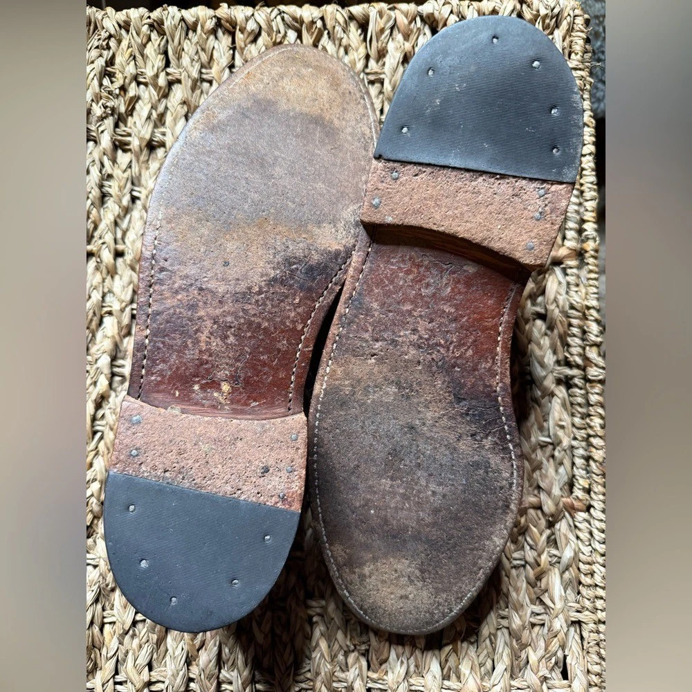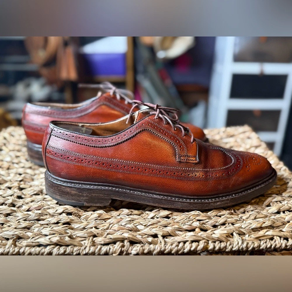 Beautiful vintage Thom McAn full brogue oxfords crafted in rich brown leather with classic wingtip and perforated detailing. These heritage-quality shoes feature genuine leather uppers, leather lining, and traditional leather outsoles with rubber heel caps. The patina shows natural aging and character while maintaining structural integrity—an excellent pair for anyone who appreciates classic menswear craftsmanship. A versatile style that pairs effortlessly with denim, chinos, or tailored trousers for a timeless smart-casual look. Size: Men's 8.5 Model Numbers Inside: 4100 / S67129 Color: Brown Material: Genuine leather upper, leather lining, leather outsole Condition: Good vintage condition. Light creasing and wear consistent with age. Soles show normal wear with plenty of life remaining. No major flaws. Style Details: • Full brogue wingtip Oxford • Genuine leather construction • Lace-up closure • Stacked heel with rubber cap • Classic heritage menswear profile 5-Star Rated Seller | Fast Shipping quiet luxury, heritage menswear, classic oxford, timeless style, vintage leather, old money aesthetic, smart casual Model image was created with AI.