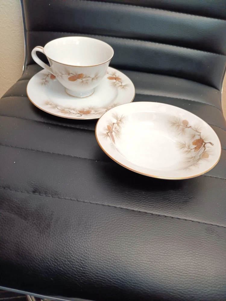 This vintage three crown China set is a stunning addition to any collection. The set includes plates, cups, and many other pieces, all featuring the beautiful rosenzahn aida pine needles pattern on a white background. Made in Japan, this vintage set is sure to impress. The brand is Crown and the color is white, making it a versatile addition to any decor. Perfect for collectors or those looking for a unique and elegant dining experience, this set is a must-have.