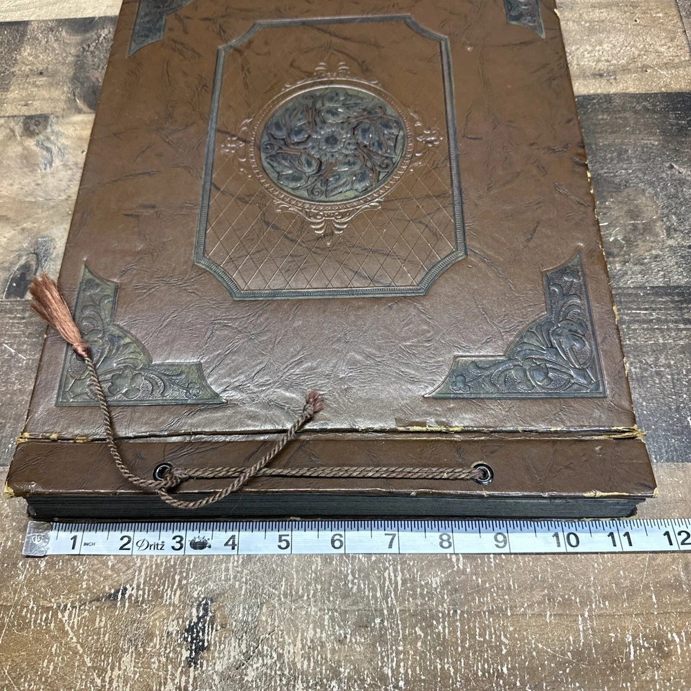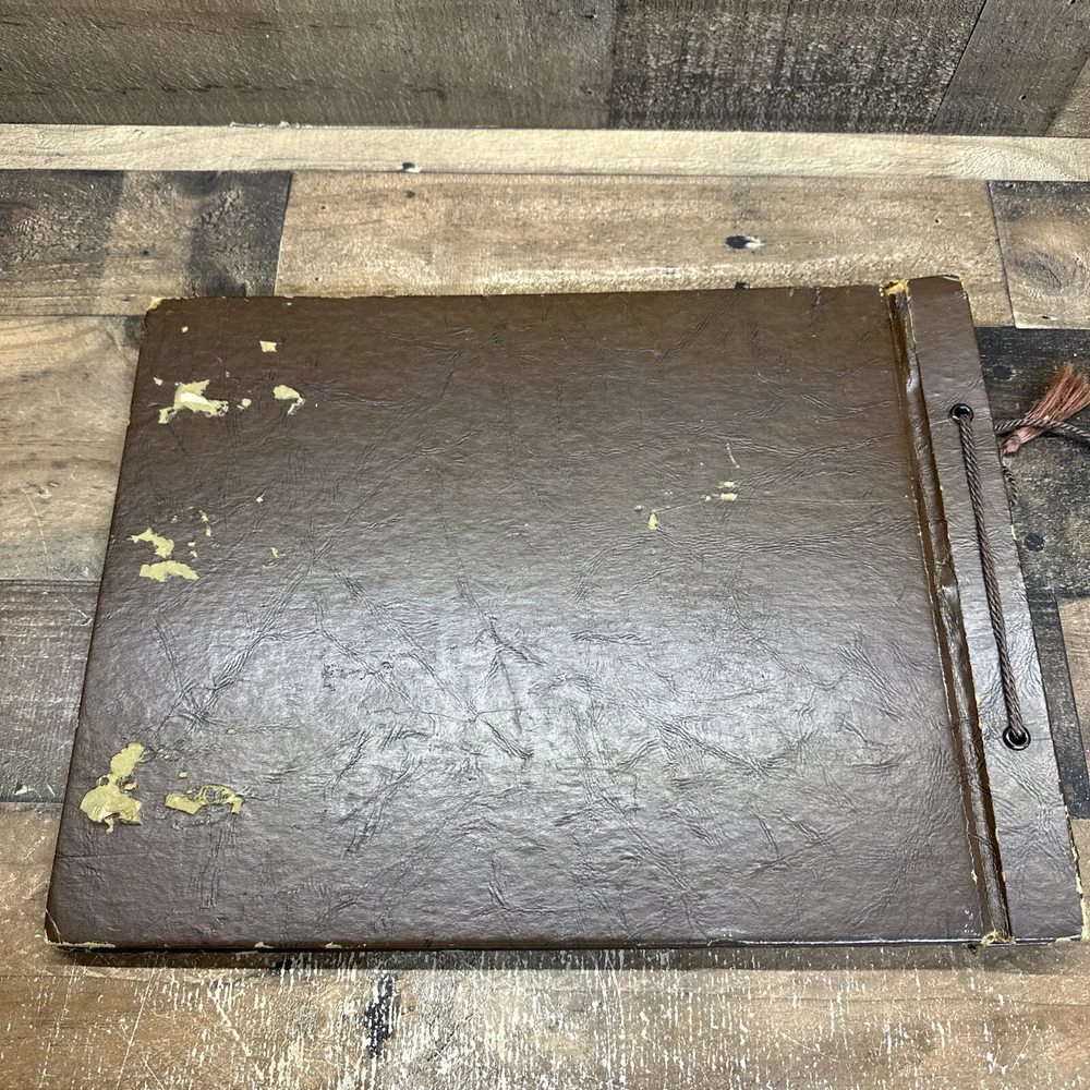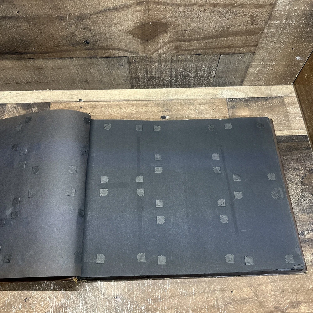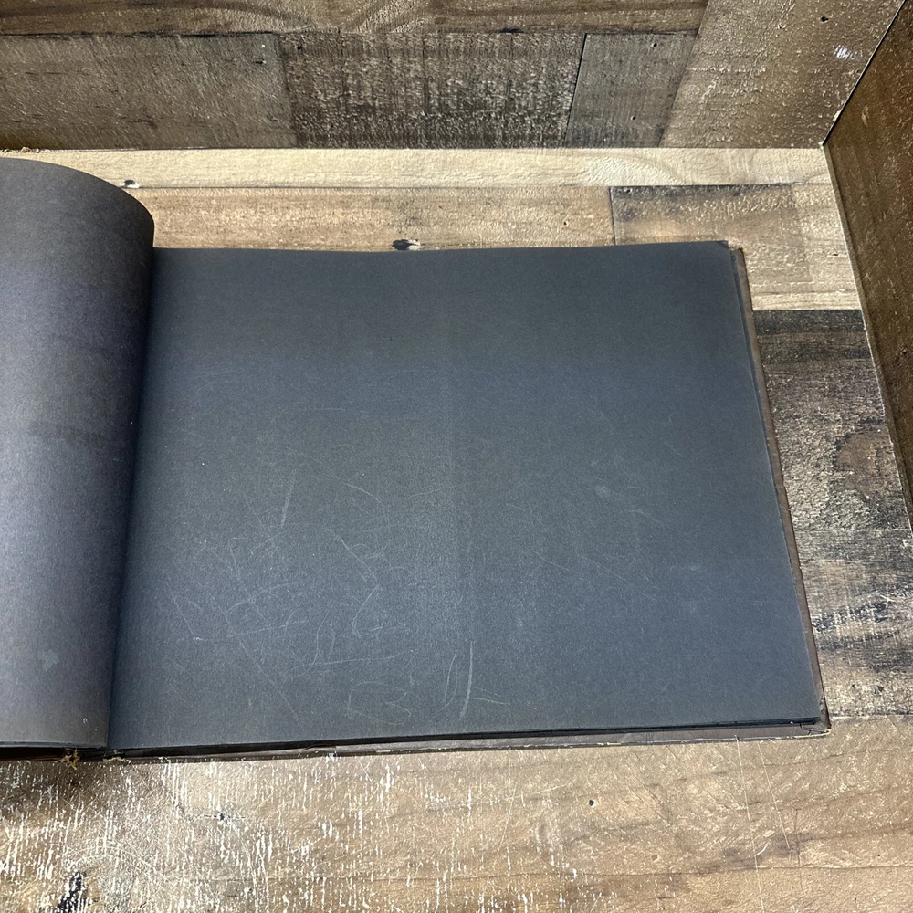 This vintage tie-bound album is a perfect addition to any collection. The black paper sheets provide a classic and timeless look that is sure to impress. The album is perfect for storing family photos and scrapbook memorabilia. The country/region of manufacture is unknown, adding to the mystery and allure of this piece. Whether you are a collector or just looking for a unique item to add to your home decor, this vintage album is sure to delight. This album has several sheets with applied photo corners already on them but the majority of the sheets are blank. This does have small imperfections please see photos.