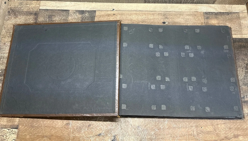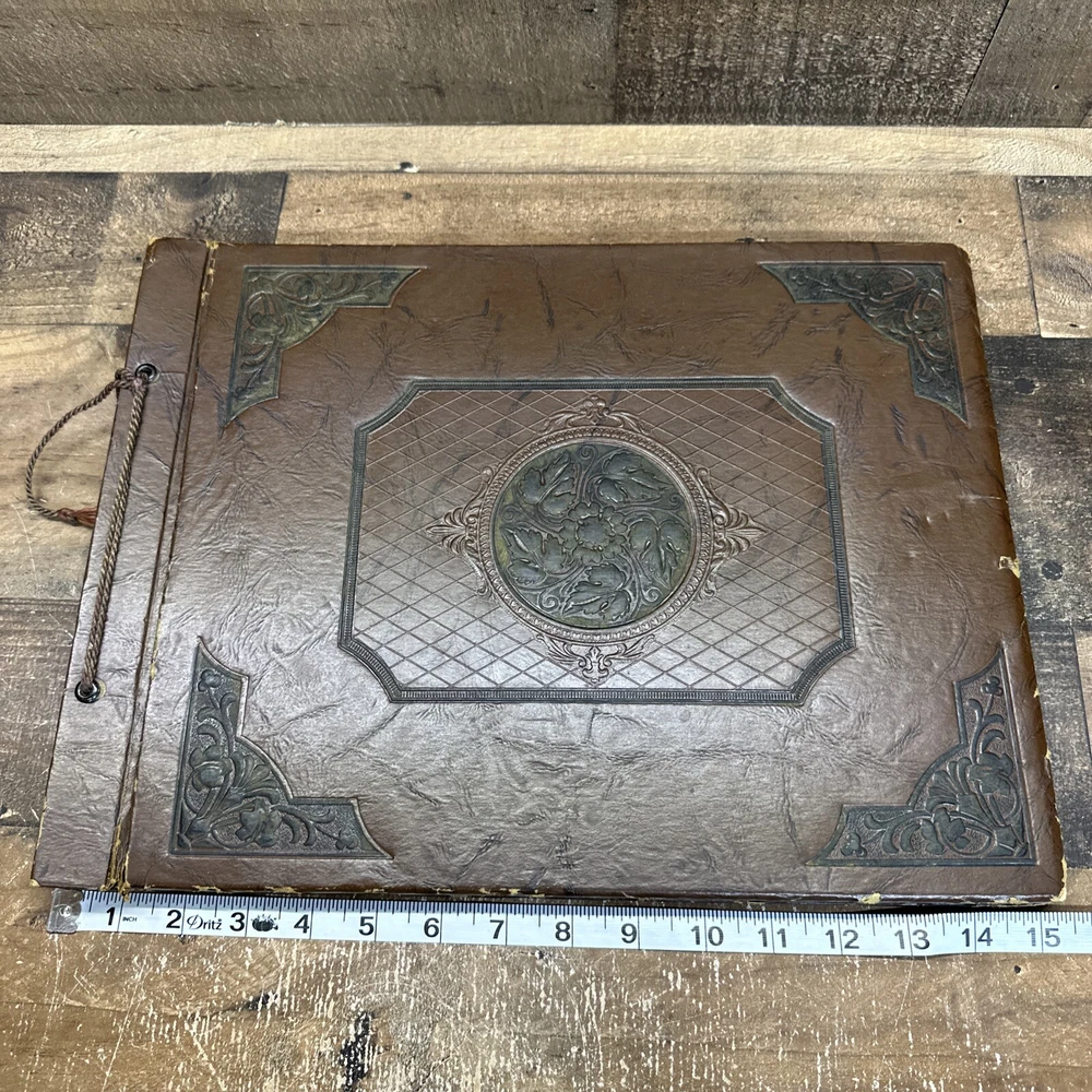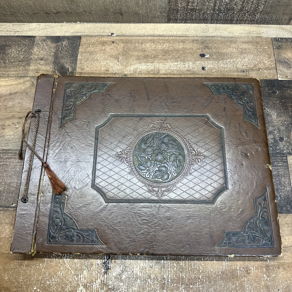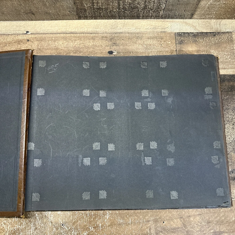 This vintage tie-bound album is a perfect addition to any collection. The black paper sheets provide a classic and timeless look that is sure to impress. The album is perfect for storing family photos and scrapbook memorabilia. The country/region of manufacture is unknown, adding to the mystery and allure of this piece. Whether you are a collector or just looking for a unique item to add to your home decor, this vintage album is sure to delight. This album has several sheets with applied photo corners already on them but the majority of the sheets are blank. This does have small imperfections please see photos.