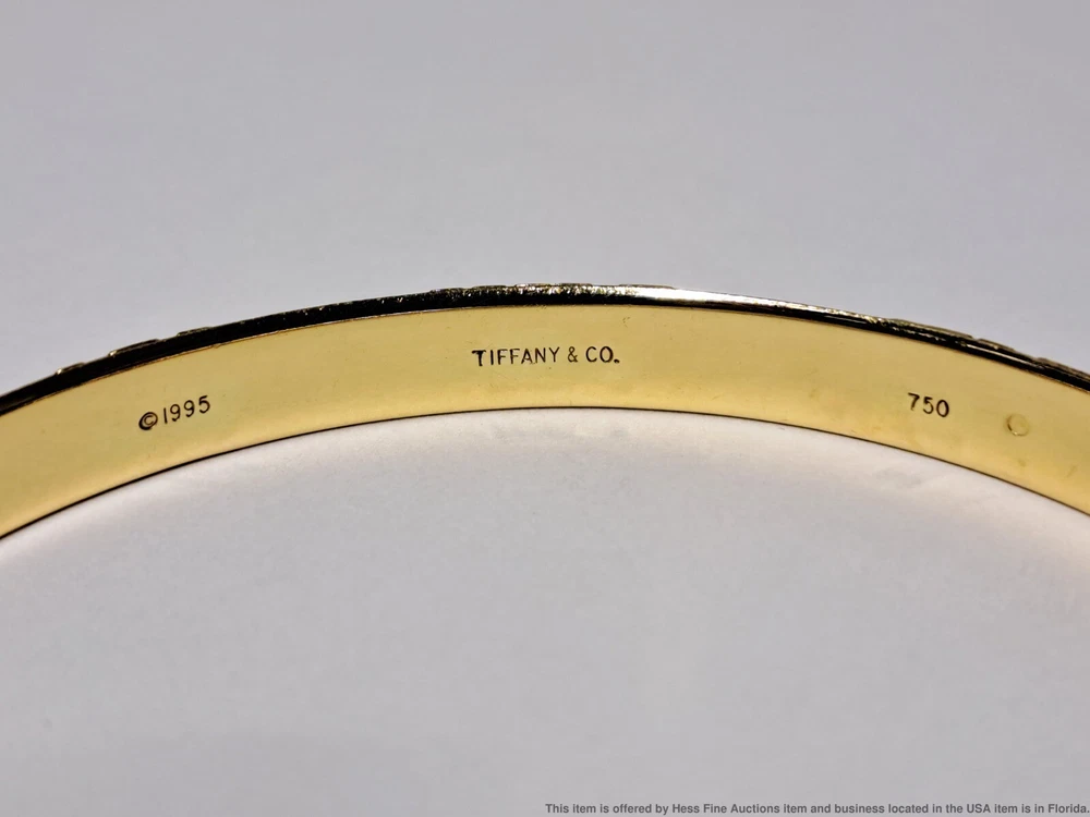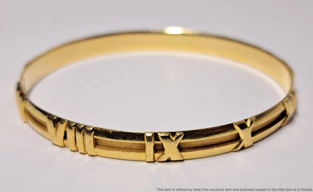 Vintage Tiffany & Co Atlas 18K Gold Roman Numeral Bangle Bracelet Signed 1995 Vintage Tiffany & Co Atlas 18K Gold Roman Numeral Bangle Bracelet Signed 1995 Click images to enlarge Description Described & Photographed By: Dillon 61241 NFTME Title: Vintage Tiffany & Co Atlas 18K Gold Roman Numeral Bangle Bracelet Signed 1995 Description: Vintage Tiffany & Co Atlas 18K Gold Roman Numeral Bangle Bracelet Signed 1995 Here are the specifications: Type of Jewelry: Bracelet Mounting metal: 18K Yellow Gold Approx. Size or length: 7-3/4 in circumference; 2-5/8 opening; 1/4 in or 6.5mm width Condition: Preowned with light use overall. Could use a polish. See photos for details. Appears ready to wear! Stamping or Factory Markings: Tiffany & Co 1995 750 Total weight of piece: 22.1 grams Estimated size of package: 7.5 x 5.5 x 3.5 Estimated weight of package: 8 oz Condition: Pre-owned Condition Notes: Described & Photographed By: Dillon 61241 NFTME Title: Vintage Tiffany & Co Atlas 18K Gold Roman Numeral Bangle Bracelet Signed 1995 Description: Vintage Tiffany & Co Atlas 18K Gold Roman Numeral Bangle Bracelet Signed 1995 Here are the specifications: Type of Jewelry: Bracelet Mounting metal: 18K Yellow Gold Approx. Size or length: 7-3/4 in circumference; 2-5/8 opening; 1/4 in or 6.5mm width Condition: Preowned with light use overall. Could use a polish. See photos for details. Appears ready to wear! Stamping or Factory Markings: Tiffany & Co 1995 750 Total weight of piece: 22.1 grams Estimated size of package: 7.5 x 5.5 x 3.5 Estimated weight of package: 8 oz Payment Paypal Shipping Shipping Options: Domestic shipping: Weight based Shipping Charges. Domestic Carriers are: Ups Second Day Air, Ups Next Day Air International shipping: Weight based Shipping Charges. International Carriers are: Ups Standard Canada, Ups Worldwide Expedited I will ship to: United States, Worldwide Weight: 8 oz. Shipping and Handling: Please check eBay's Shipping & Payment tab Customer Service Policy: Please note in bidding or buying this auction you are entering into a binding contract. In bidding or buying you are agreeing to all policies stated below and comply with Florida State laws. Sales Tax applies to all Florida sales unless you have a valid dealers license. Legal Shipping High value items require restricted delivery with only the addressee being able to sign for it. * Shipping is calculated by eBay and shown in the auction. Legal Jurisdiction. HessFineAuctions is a division of Hess Fine Art, and is registered in Pinellas County, FL, USA. It is agreed that all parties will abide by the laws of the State of Florida in all matters relating to this agreement. And that in the case of any dispute, the legal jurisdiction of resolution shall be Pinellas County, Florida. The buyer acknowledges that any items not returned within 30 days of receipt of the refund will be deemed appropriated by the buyer and buyer also acknowledges their intent to deprive from seller, either temporarily or permanently, the right to the property or the benefit from the property. Resale certificates must match buyer name or company and address * The auctions contain only what is described. Do not assume something comes with a used item if it is not stated in the auction verbiage. Many items will be marked with serial numbers or identifying numbers items may not be accepted for return if these numbers are not present. * Photographs often disclose condition far better than verbiage as many people have different ideas on what terms may mean. * If an identifying mark, inclusion or defect is visible in the images it is considered DISCLOSED to the buyer. * Gold items have been tested with a Kee gold tester M-509GM and tested as stated in the auction. * All Items are shipped insured. If an item has arrived damaged we will require images and a damage affidavit. CUSTOMS AND INTERNATIONAL BIDDER POLICIES International bidders - you are agreeing to the following when you place a bid with us: * If your total purchase including shipping exceeds $200.00 US and you pay with a credit card then your only delivery option is UPS signature delivery. This is because credit cards require both a signature and tracking. * If you pay with PayPal and the total price including shipping is less than $750.00 US then we can ship USPS to most countries. Please contact us with eBay’s message system before you pay for an amended invoice. * The following applies if you are shipping to or from these countries. CANADA, Australia, Belgium, Brazil, Croatia, Denmark, France Germany, Great Britain and Northern Ireland, Israel, Netherlands New Zealand Spain and Switzerland, Estonia, Finland, Gibraltar, Hungary, Italy, Latvia, Lithuania, Luxembourg, Malaysia, Malta, Portugal, and Singapore. We will be able to offer you USPS International shipping if you are paying with PayPal and the item and shipping are less than $750.00 US. We may be able to ship 1st Class USPS International if you are shipping to or from the countries listed above. * If you wish your item sent to a colleague with a US address we are of course willing to do so but the address must be verified with PayPal Credit card company and in the eBay invoice. * We declare all items for the winning bid amount. * It is common for countries to charge some form of customs duties, taxes, VAT, or brokerage fees on items being shipped from the USA. These costs, along with country-specific importing rules and delays caused by customs, are the buyer’s responsibility. * We do not falsify customs documents to assist you in evading your lawful taxes. Hess Fine Auctions Hess Fine Auctions can be reached during working hours of 9 to 5 PM EST. Legal Shipping Vendio Images: More than just a pretty image. 250+ Mobile Responsive & Active Content Free Listing Templates with Vendio Sales Manager. Vendio provides powerful selling automation for sellers of all sizes. Get business information that counts! - Vendio Counters are active content free.