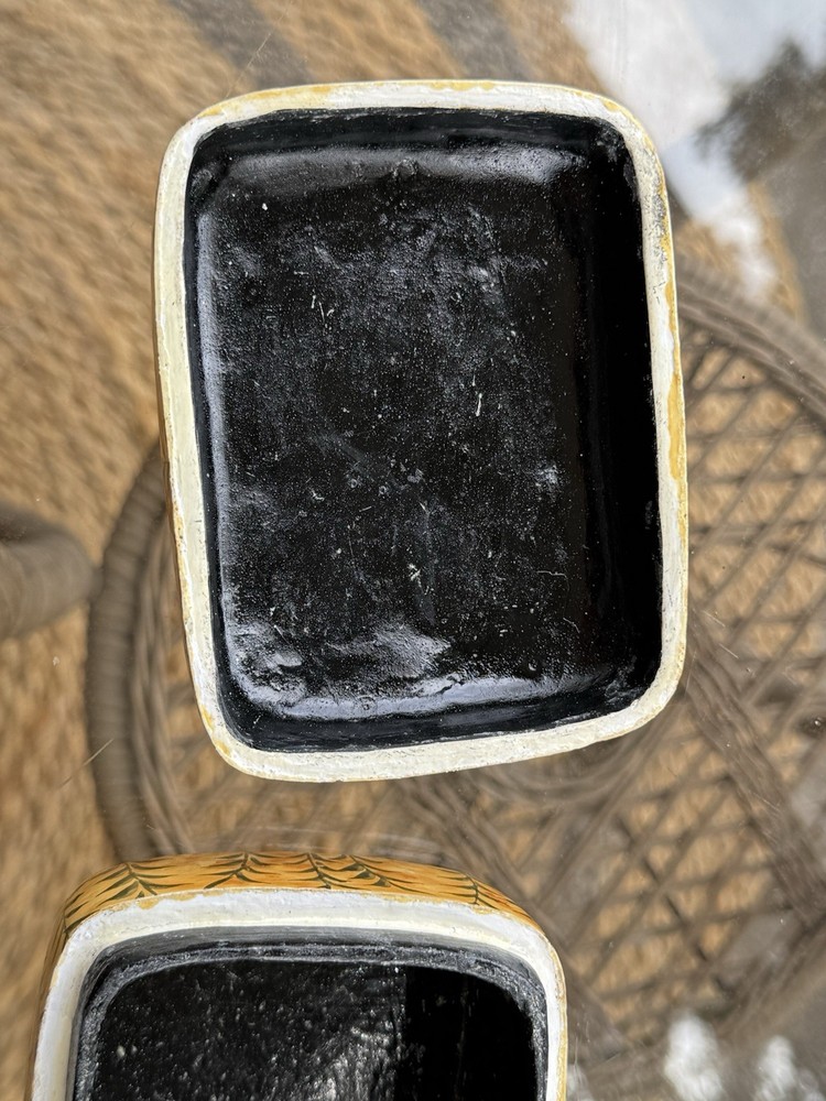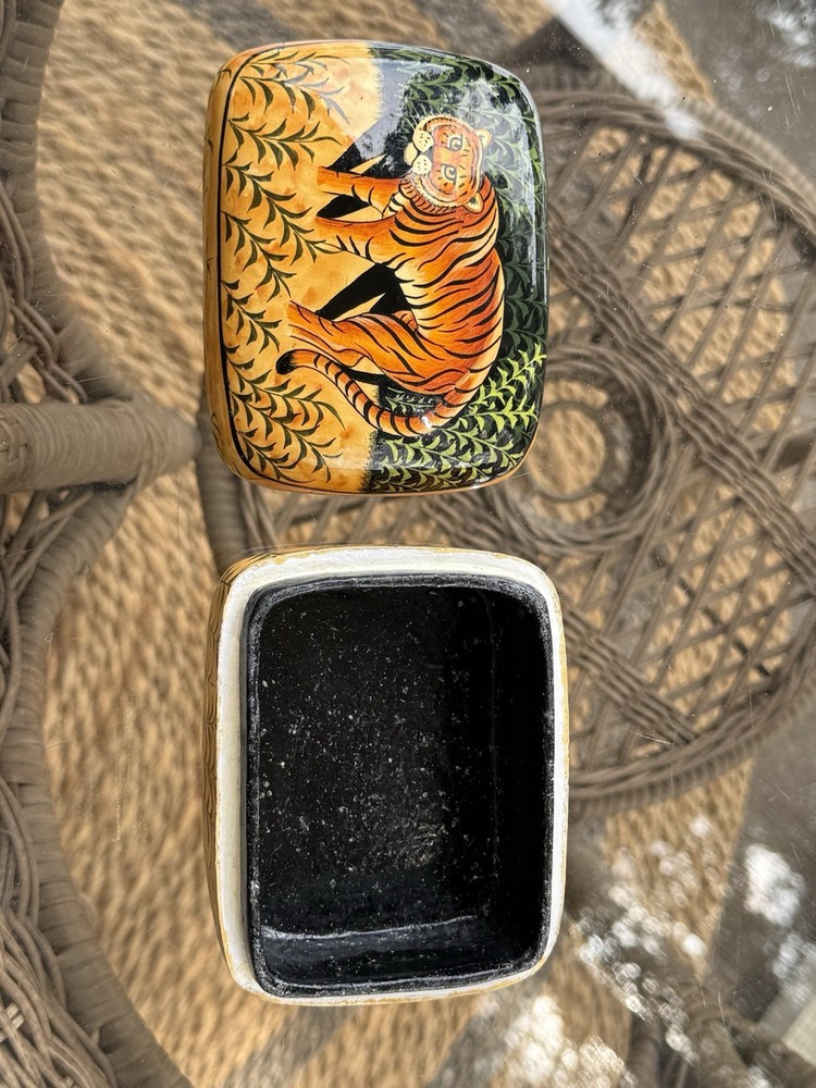 The Vintage Tiger Trinket Box is a charming collectible item that showcases a unique design featuring tigers. It is a trinket box with a lid, making it perfect for storing small items like jewelry, keepsakes, or other treasures. The vintage aspect adds a touch of nostalgia and classic appeal to any decor, while the tigers add a playful and captivating element to the overall aesthetic. Ideal for collectors or those looking to add a whimsical decorative piece to their space, this trinket box is a delightful addition to any collection.