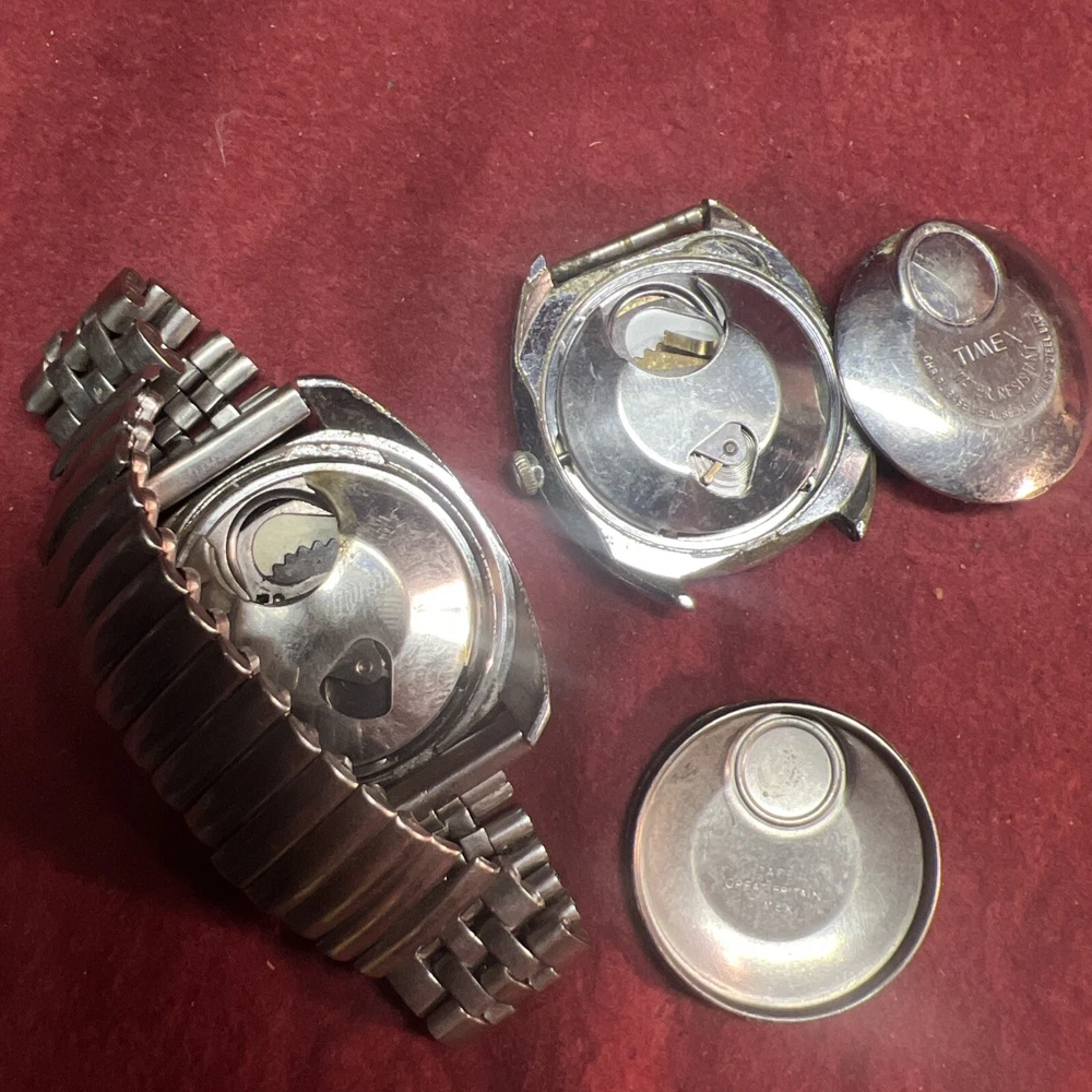 Vintage Timex divers watch Black Dial / Orange Seconds Hand -for Restoration! Missing bezel and looks like movement has missing parts! I’m including a second Timex electric and possibly you can exchange movements? I’m not sure if the second Timex movement works or not! But it looks complete! See pics!! Both for parts repair!! As is as seen as pictured… Please read below: Please review item specifics, and pictures for best details!! Please ask questions and good luck bidding! If any issue with purchase or arrival condition such as not as described, please reach out to me before posting feedback and or opening a case and I will make it right!! My wish is for you to have a happy buying experience and to enjoy my items!! Please note about vintage items. Unless marked new or new old stock, they are sold in used, as-is, pre-owned condition. Because of the age of these items they may have some wear, imperfections and signs of use, age and time… "International buyers " please note: Import duties, taxes, and charges aren't included in the item price or postage cost. These charges are the buyer's responsibility. “Please check with your country's customs office to determine what these additional costs will be, prior to bidding or buying." Shipping international via the eBay international Shipping method! ** Due to the nature of used/vintage watches, I do not guarantee long term functionality and accuracy... for best performance always have older watches serviced!! ** In regard to water resistance and or waterproof: the water resistance rating, if any, is based on the manufacturer's marking, not an actual test by me. I do not recommend using any of my used watches in submerged water environment such as swimming or shower or ocean!