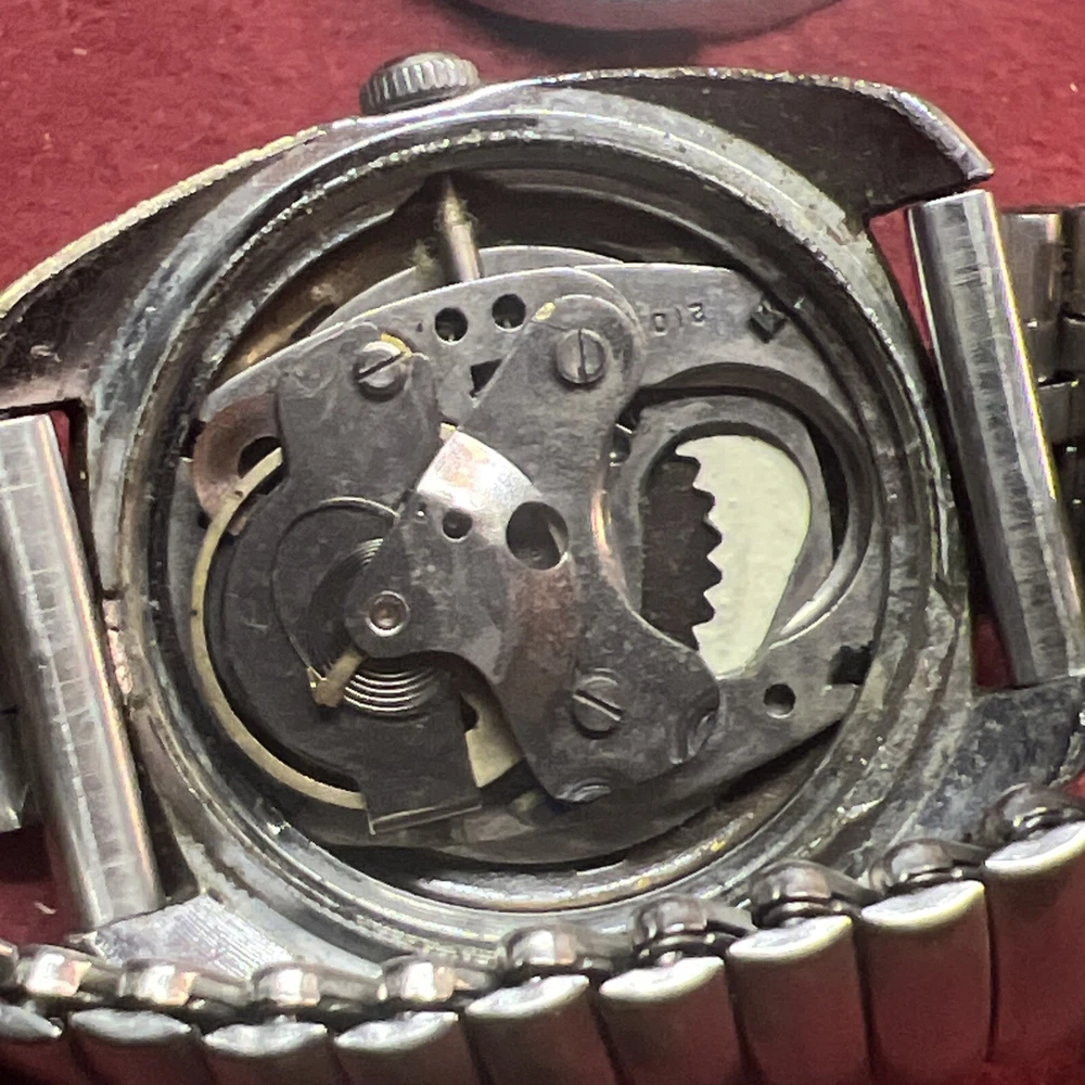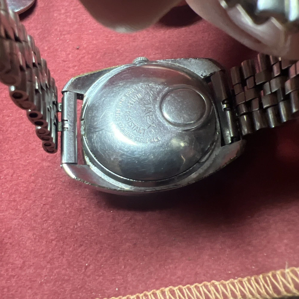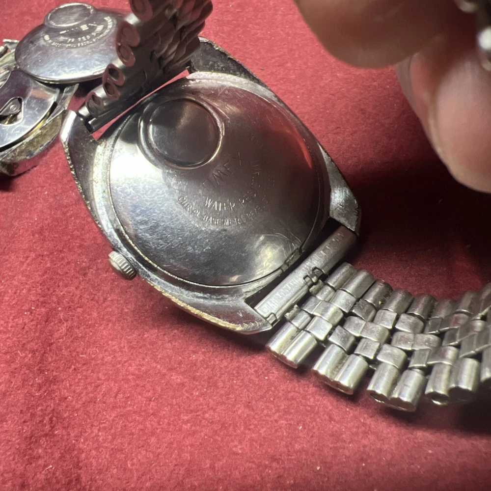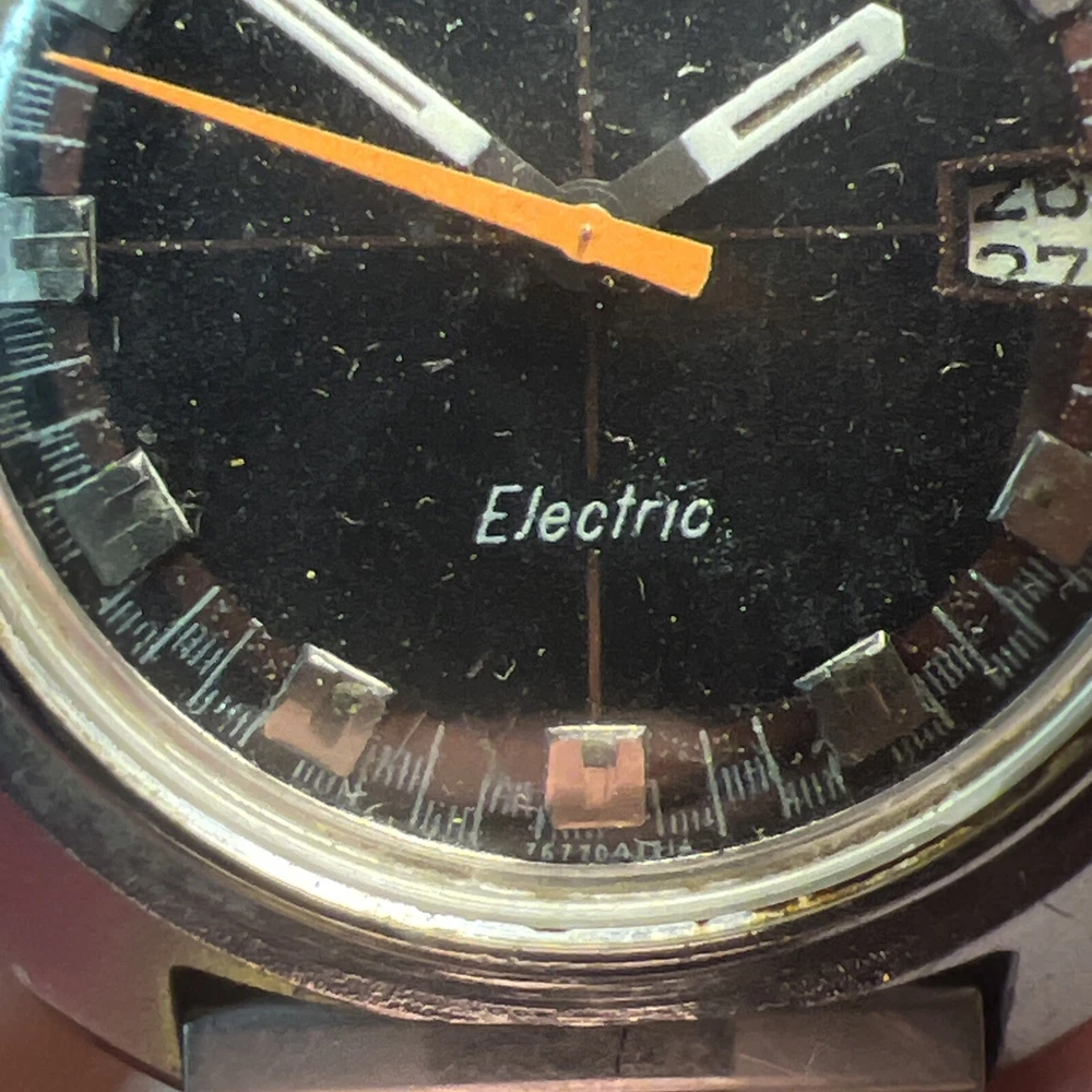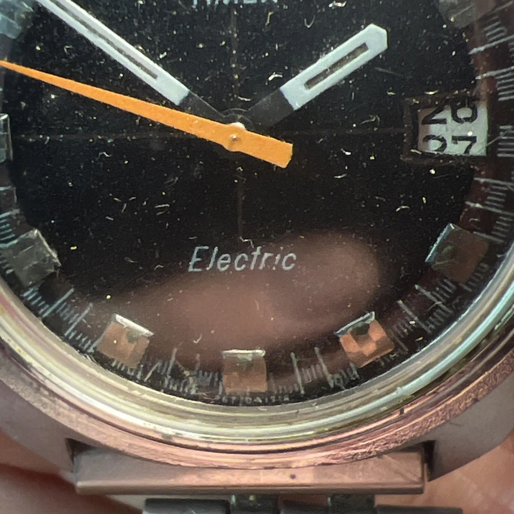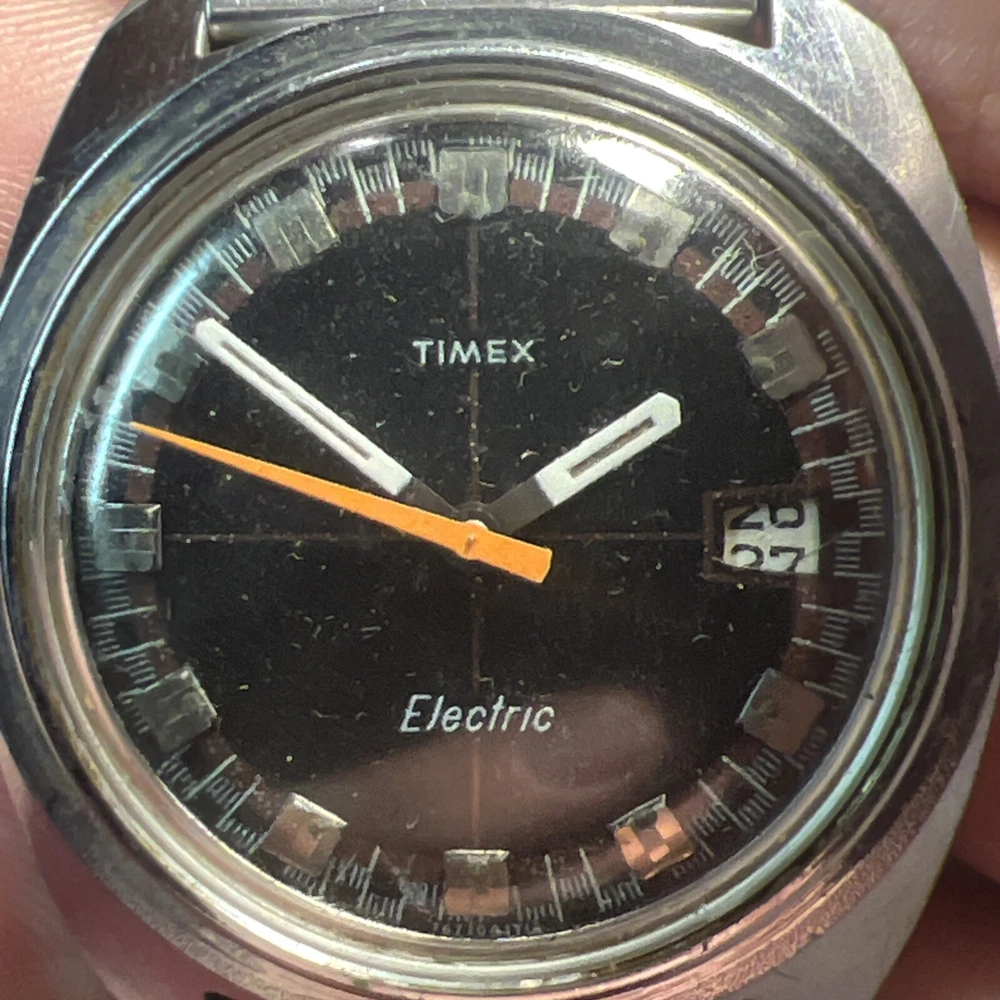 Bezel Color: Black Department: Men Movement: Electric Band Color: Silver Type: Wristwatch Display: Analog Case Color: Silver Bezel Type: Missing Dial Color: Black Caseback: Snap Features: Orange Seconds Hand, 12-Hour Dial, Black Dial, Date Indicator Style: Diver Vintage: Yes Brand: Timex Lug Width: 19 mm Water Resistance: No