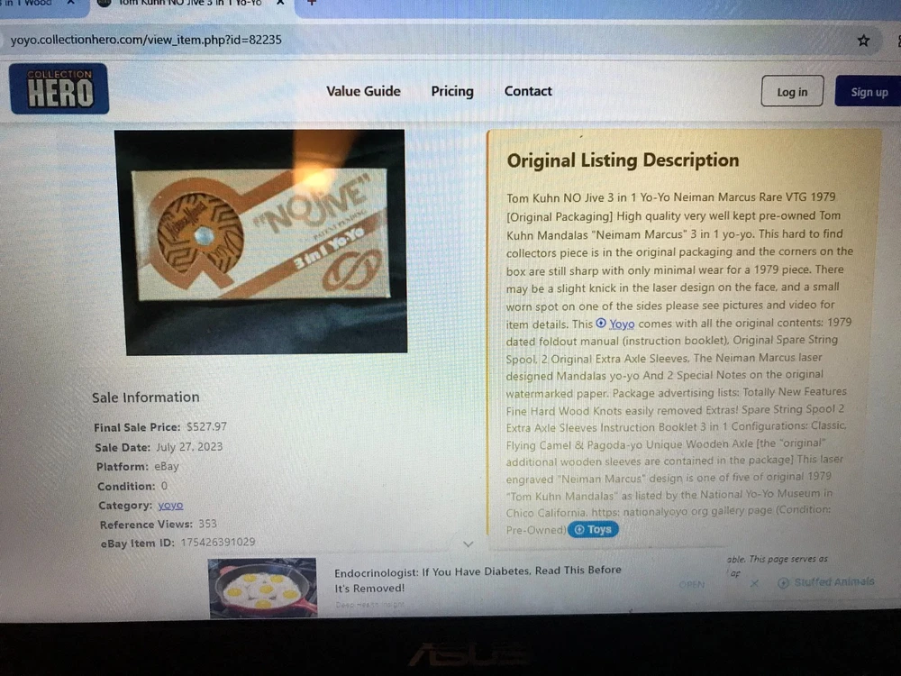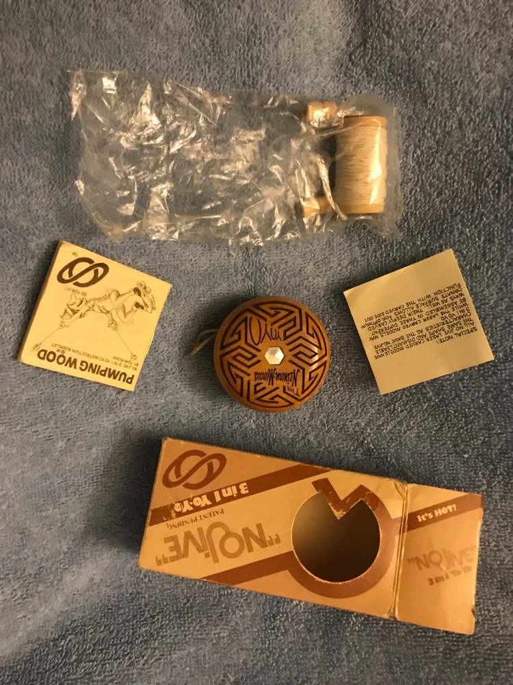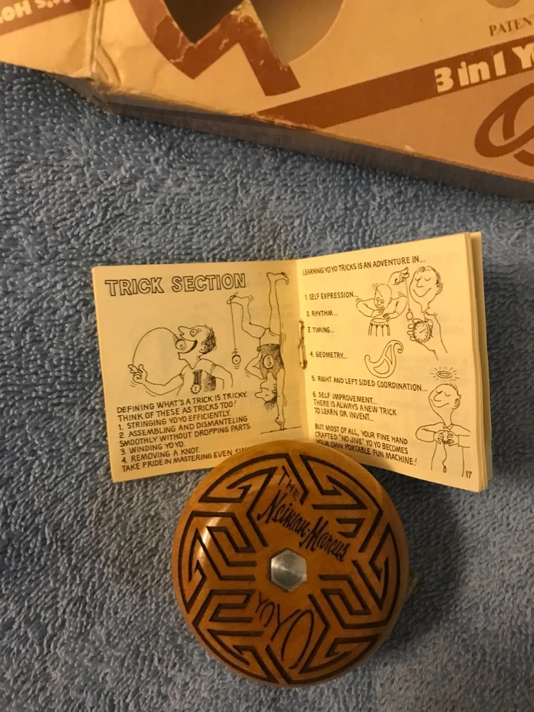 The Vintage Tom Kuhn's The Neiman Marcus NO JIVE 3in1 yoyo is a rare and collectible toy produced between 1979-1980. Made in the United States, this yoyo appeals to collectors of classic toys and enthusiasts of vintage yoyos. With its unique design and iconic branding, this yoyo is sure to be a sought-after piece for those interested in the history and nostalgia of these toys. new/used (looks like it was never played with but I can't guaranty that) in box with spare string spool 2 extra axle sleeves instruction book with lots of yoyo tricks in it. Box has some age damage check pics. price tag in pics is not the price.